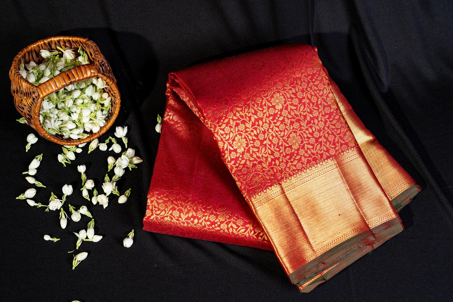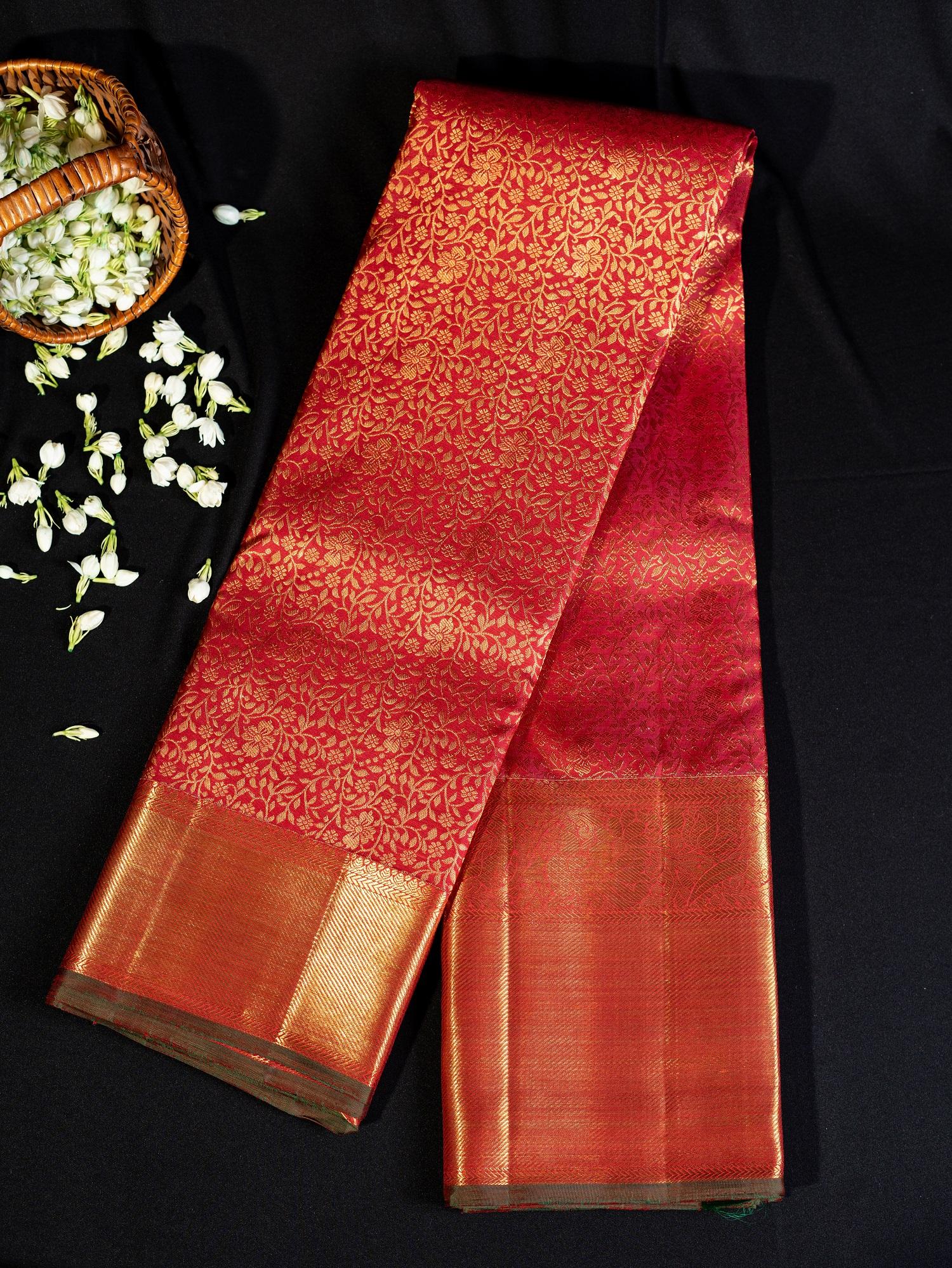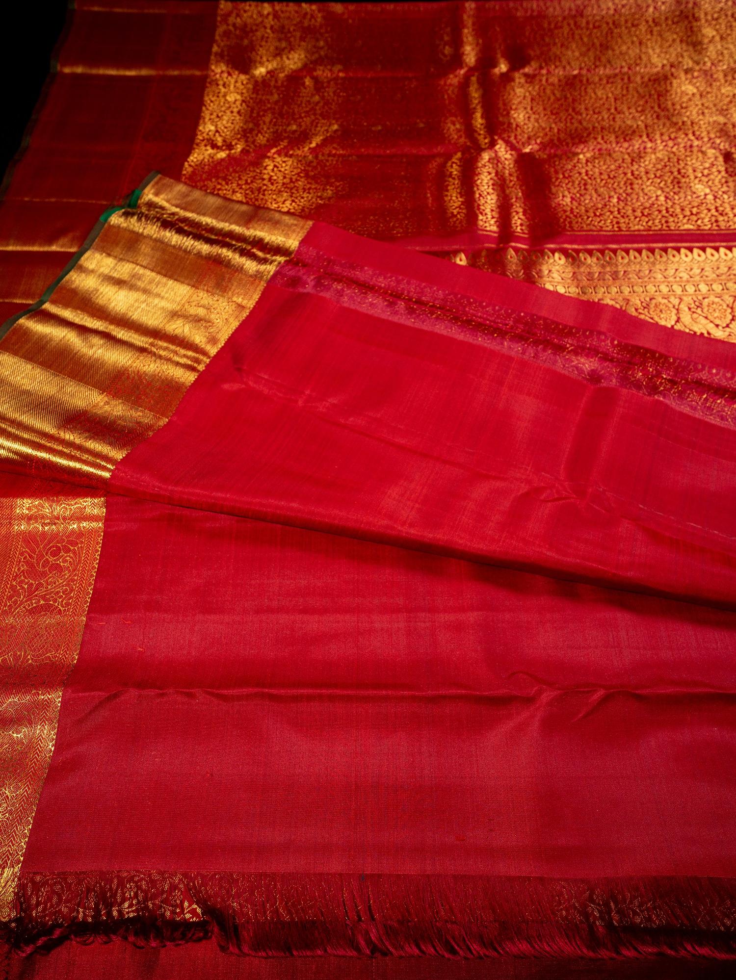 A 2 gram gold red Kanchipuram silk saree with a red gold zari medium border is a truly regal and sophisticated ensemble.The main body of the saree is a deep and rich red, evoking the warmth and elegance of luxury.The 2 gram gold thread weaving adds an unmistakable touch of opulence and glamour.The Kanchipuram silk fabric provides a lustrous sheen and smooth texture, enhancing the saree's visual appeal. The red gold zari medium border adds a subtle yet dramatic contrast, creating a striking visual effect that's perfect for formal events, weddings, or special occasions. The combination of red, gold thread, and red gold zari creates a captivating and harmonious look, evoking the beauty of luxury and celebration.