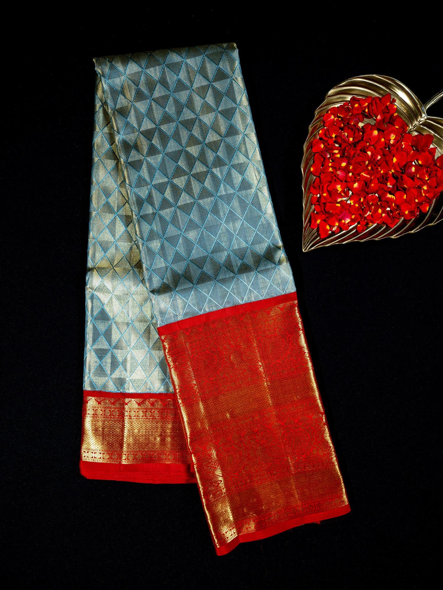 Elevate your style with this exquisite Kanchipuram Silk Tissue Brocade kalanetha blue and ash Saree. The rich kalanetha color adds a touch of elegance, while the delicate silk fabric offers a luxurious feel. Perfect for special occasions, this saree will make you stand out in the crowd.