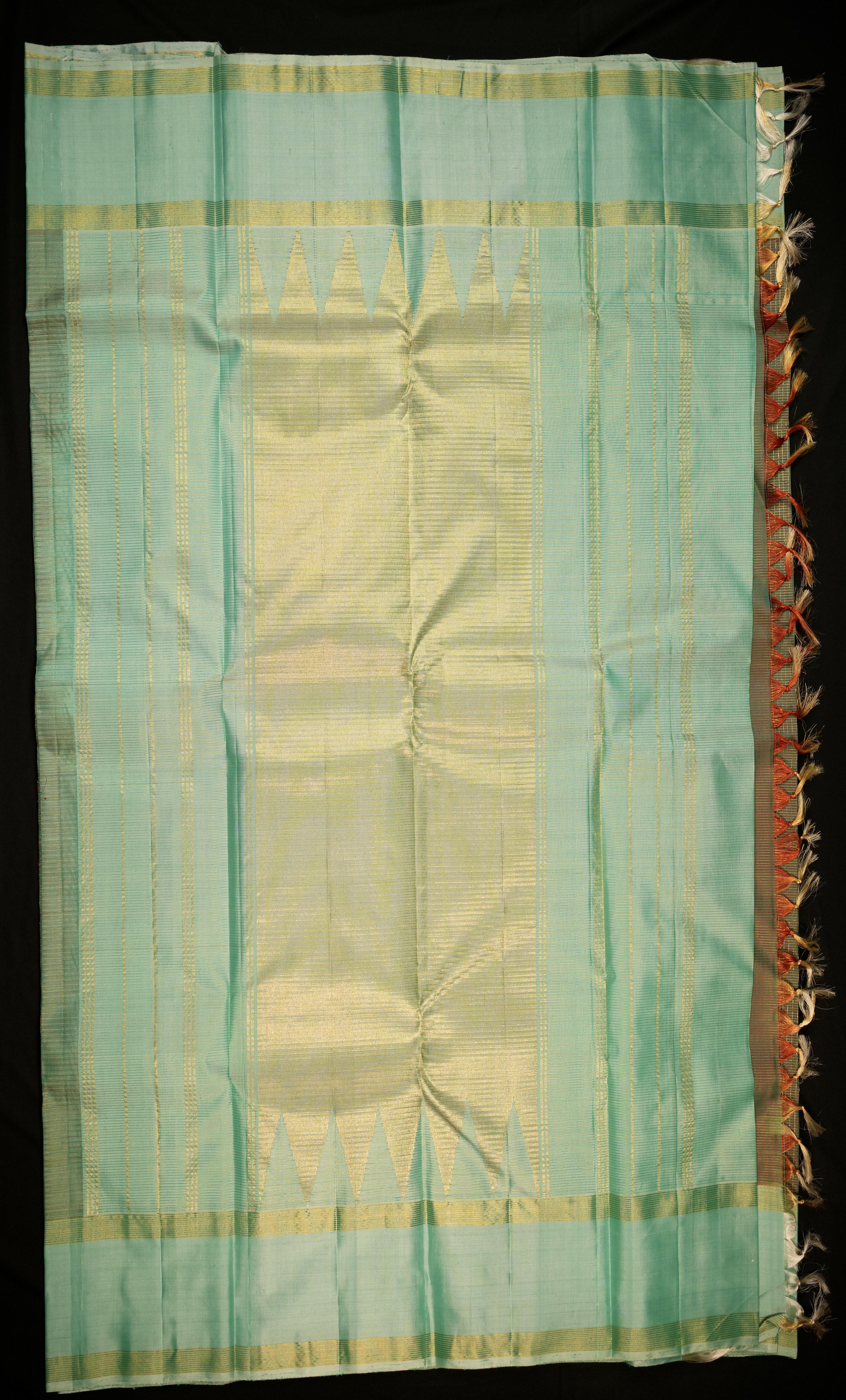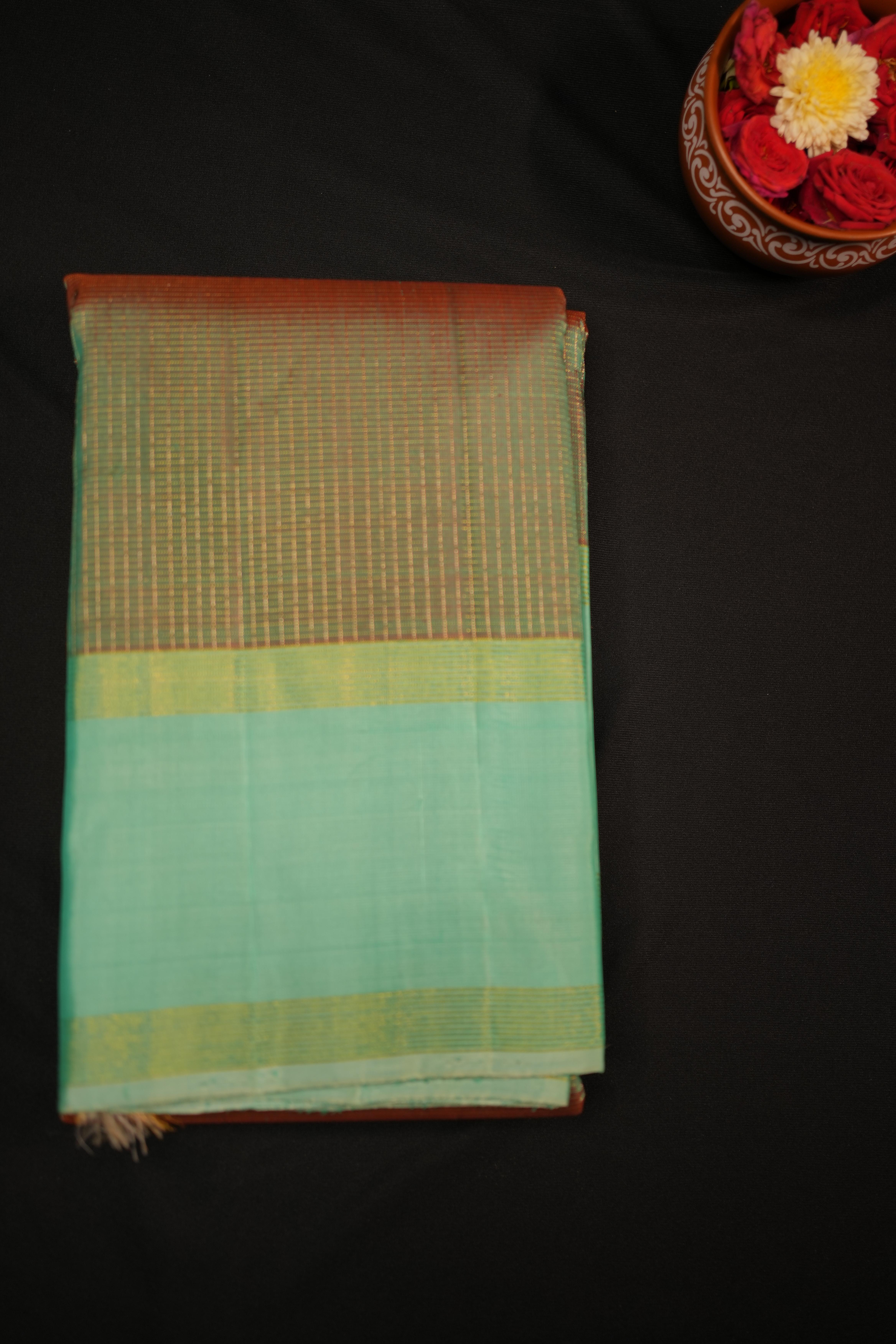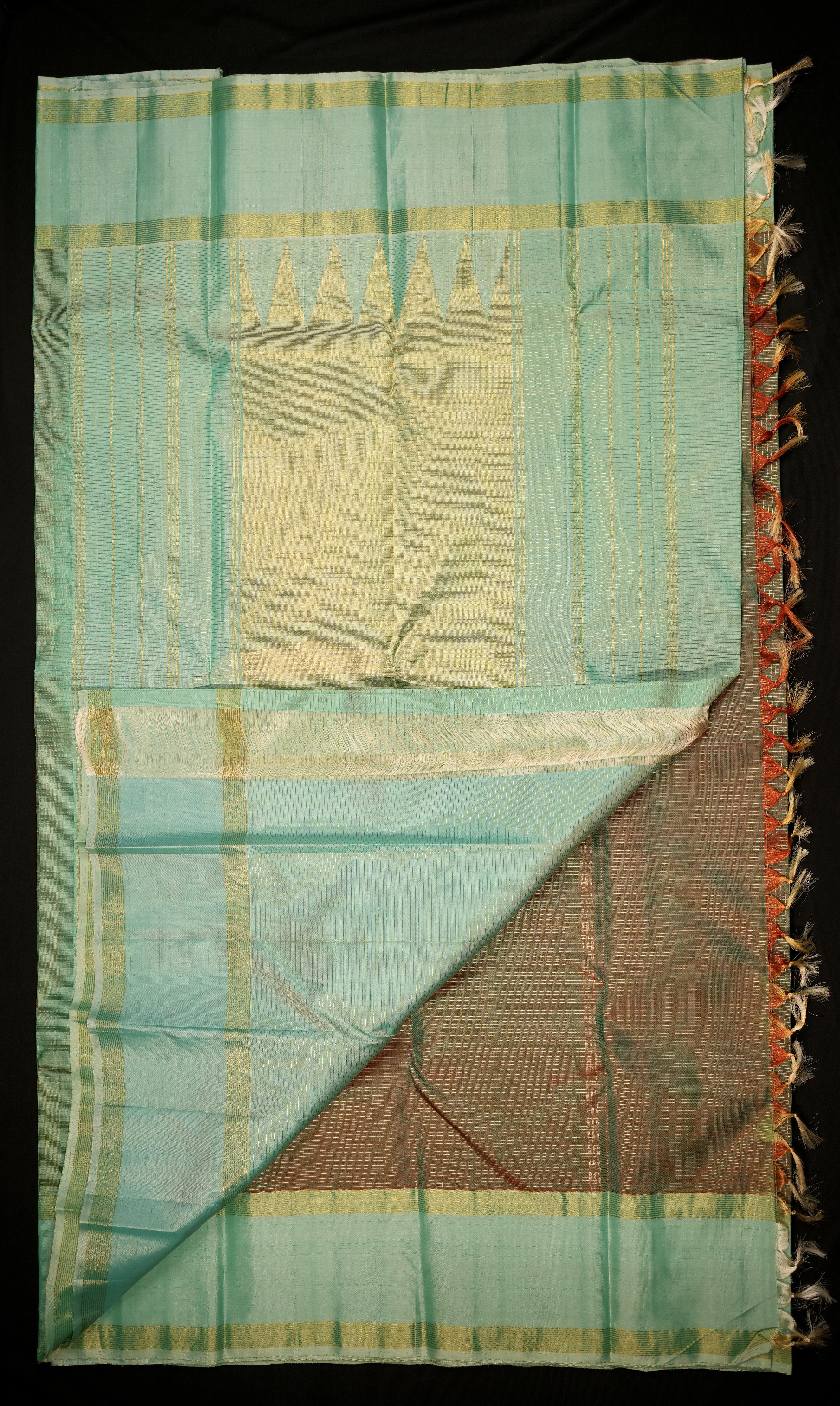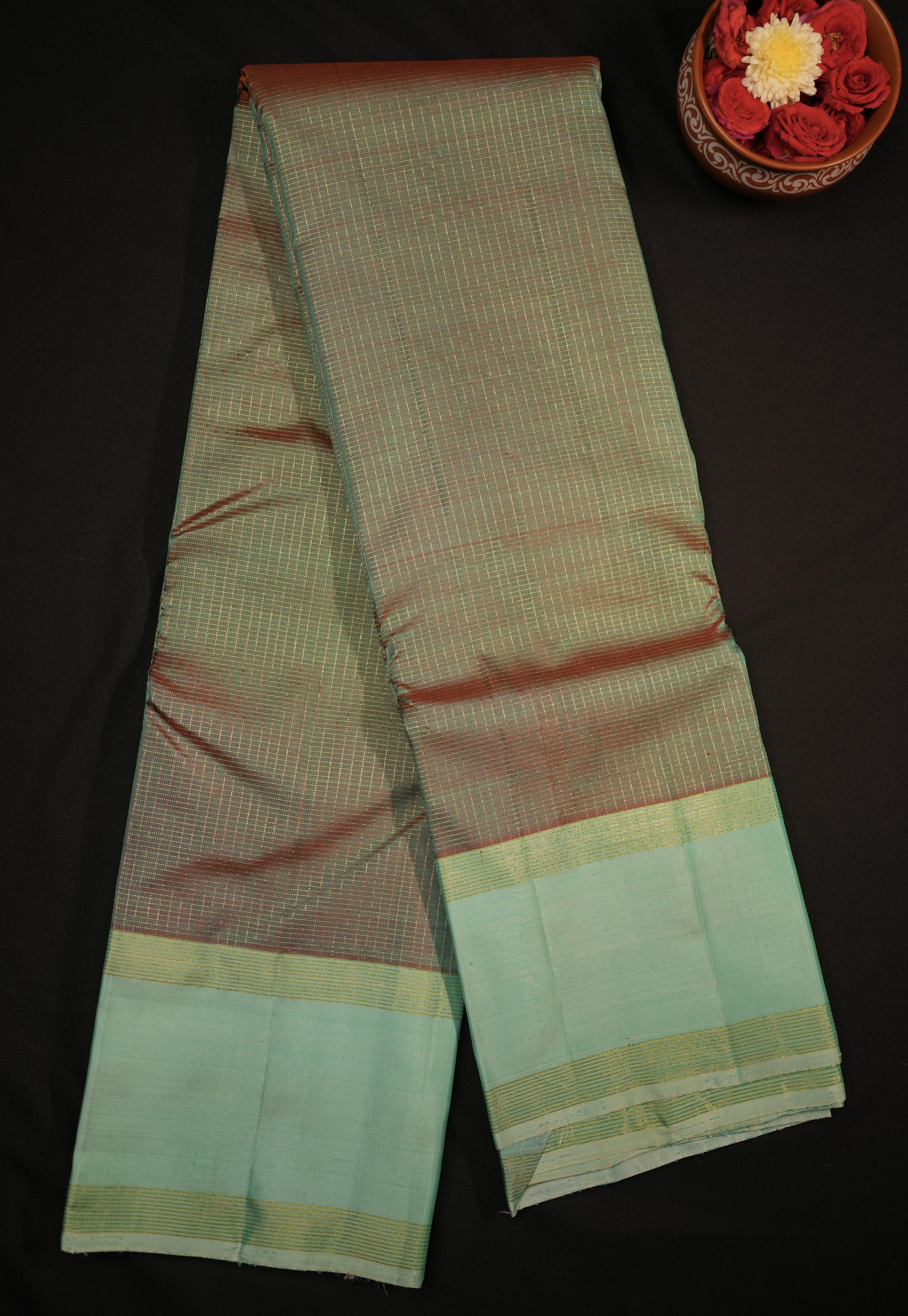 Body: The body of this saree is elegantly checks, showcasing the rich dual tone silk in its purest form, highlighting the beauty of simplicity. Border: The contrast sea green plain medium border adds a modern and sophisticated touch to the saree, providing a striking contrast. Pallu: The contrast kaddi pallu enhances the saree's elegance with its understated yet luxurious design. Blouse: Completing the look is a contrast plain sea green blouse with zari borders, offering a refined and harmonious finish.