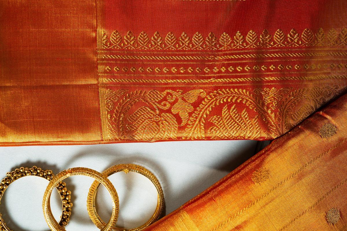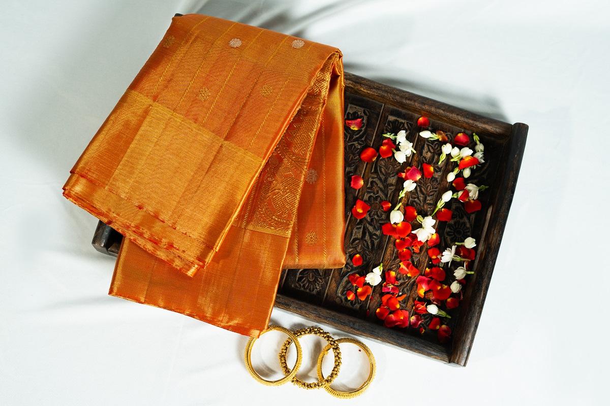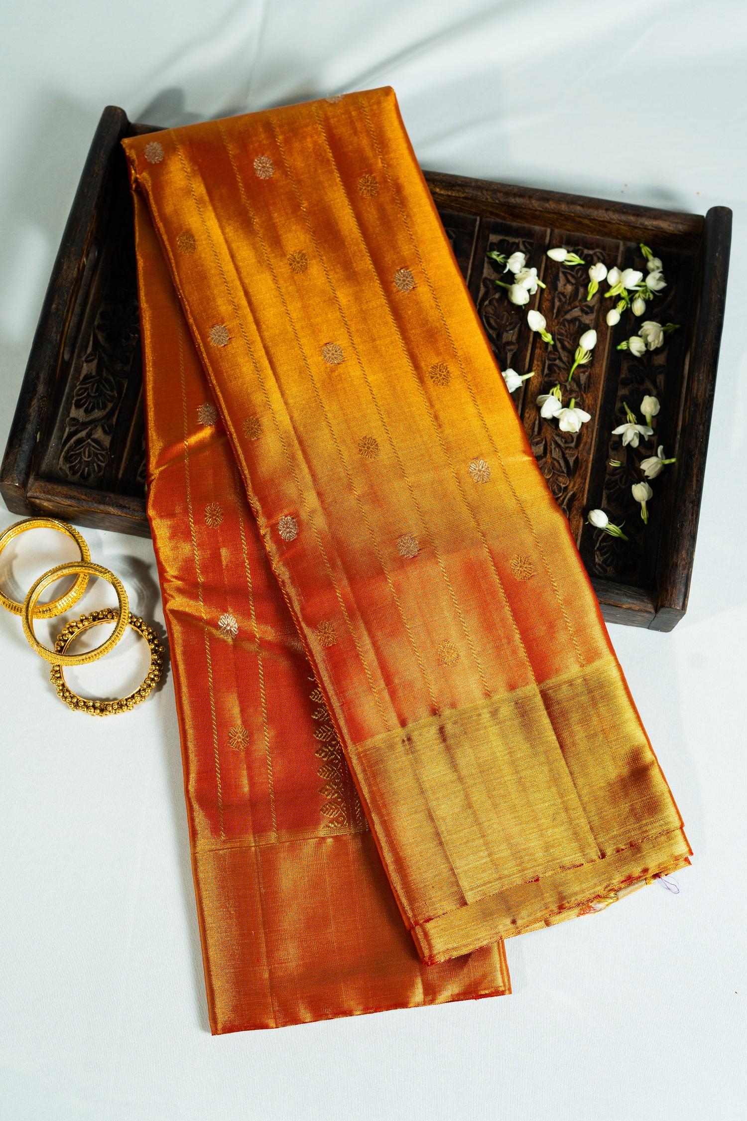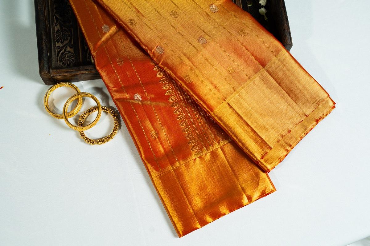 A Kanchipuram orange monotone tissue saree is a beautiful and eye-catching creation. The orange monotone color is bold, vibrant, and energetic, making a statement and grabbing attention. The tissue fabric gives the saree a light, airy texture and a subtle sheen, adding to its visual appeal. The monotone color scheme creates a clean and minimalist look, making the saree perfect for formal events, modern weddings, or high-end parties. The Kanchipuram weaving technique ensures that the saree is of the highest quality, with intricate weaving and attention to detail. The orange color is both modern and traditional, making the saree perfect for those who want to showcase their personal style and cultural heritage.