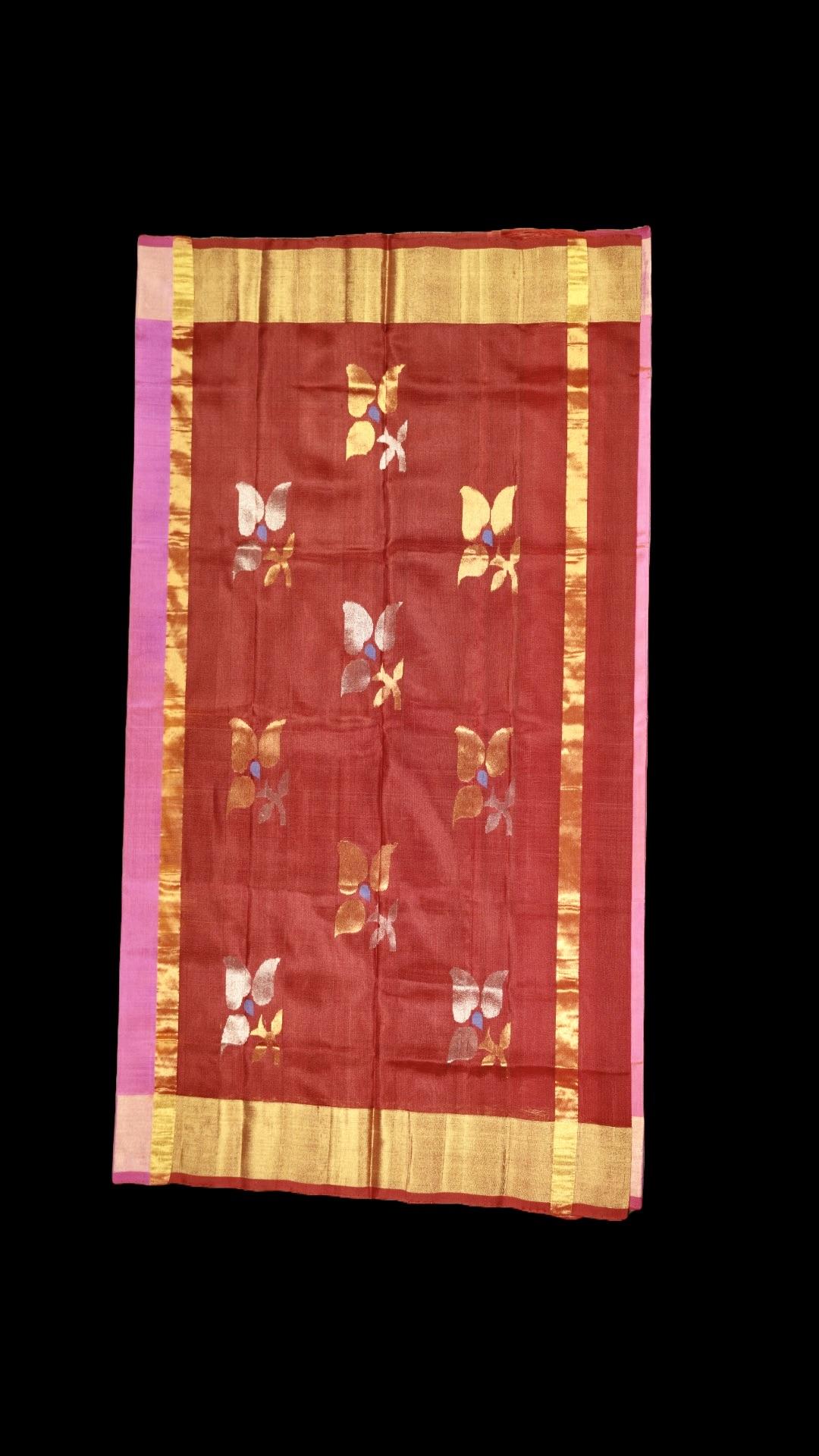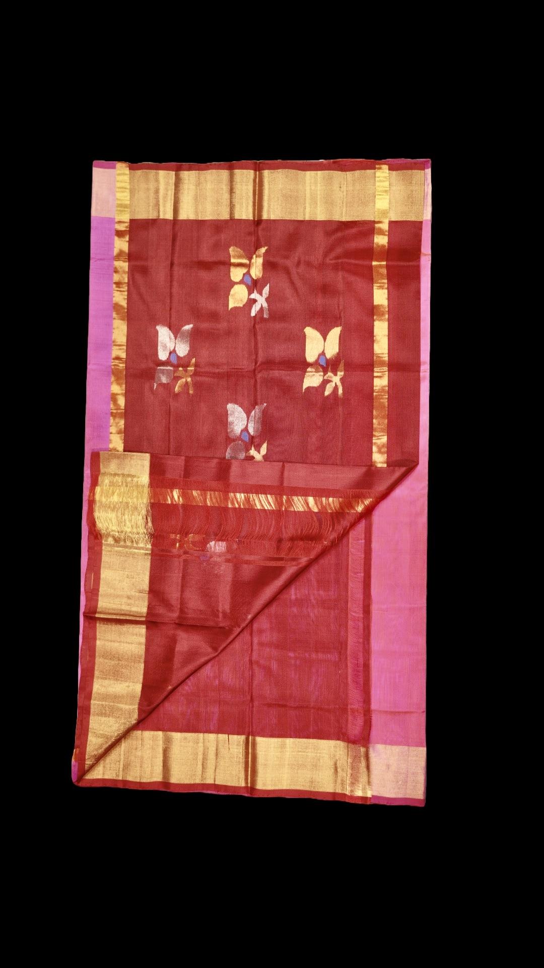 Uppada Silk Dark Pink Saree owning floral motifs, a gold Zari woven kaddi border, red edging and a red floral Pallu.