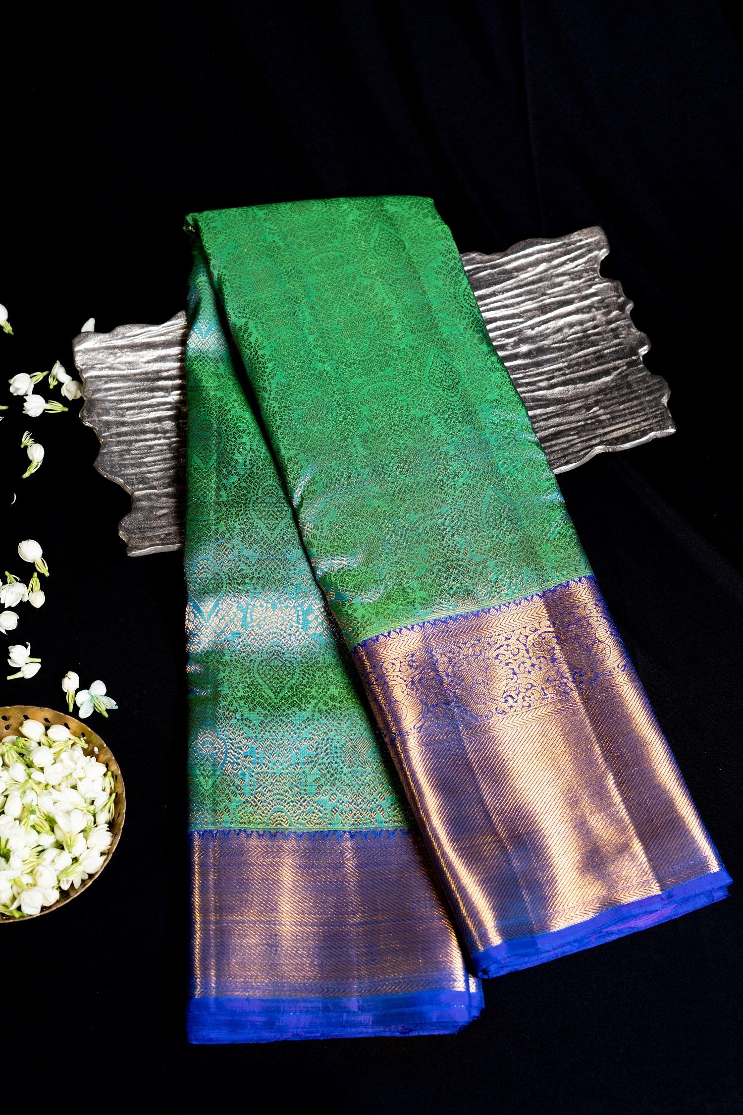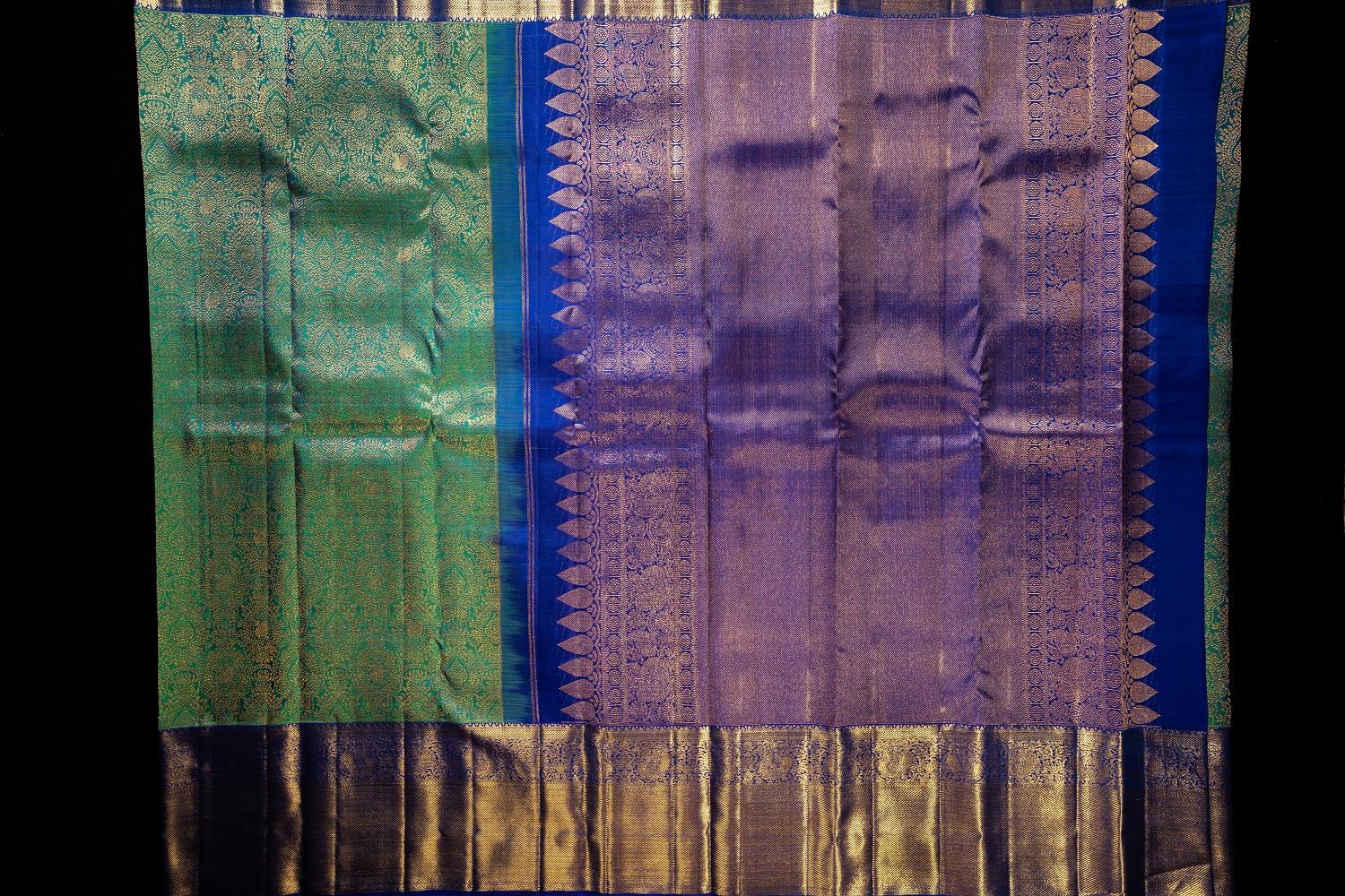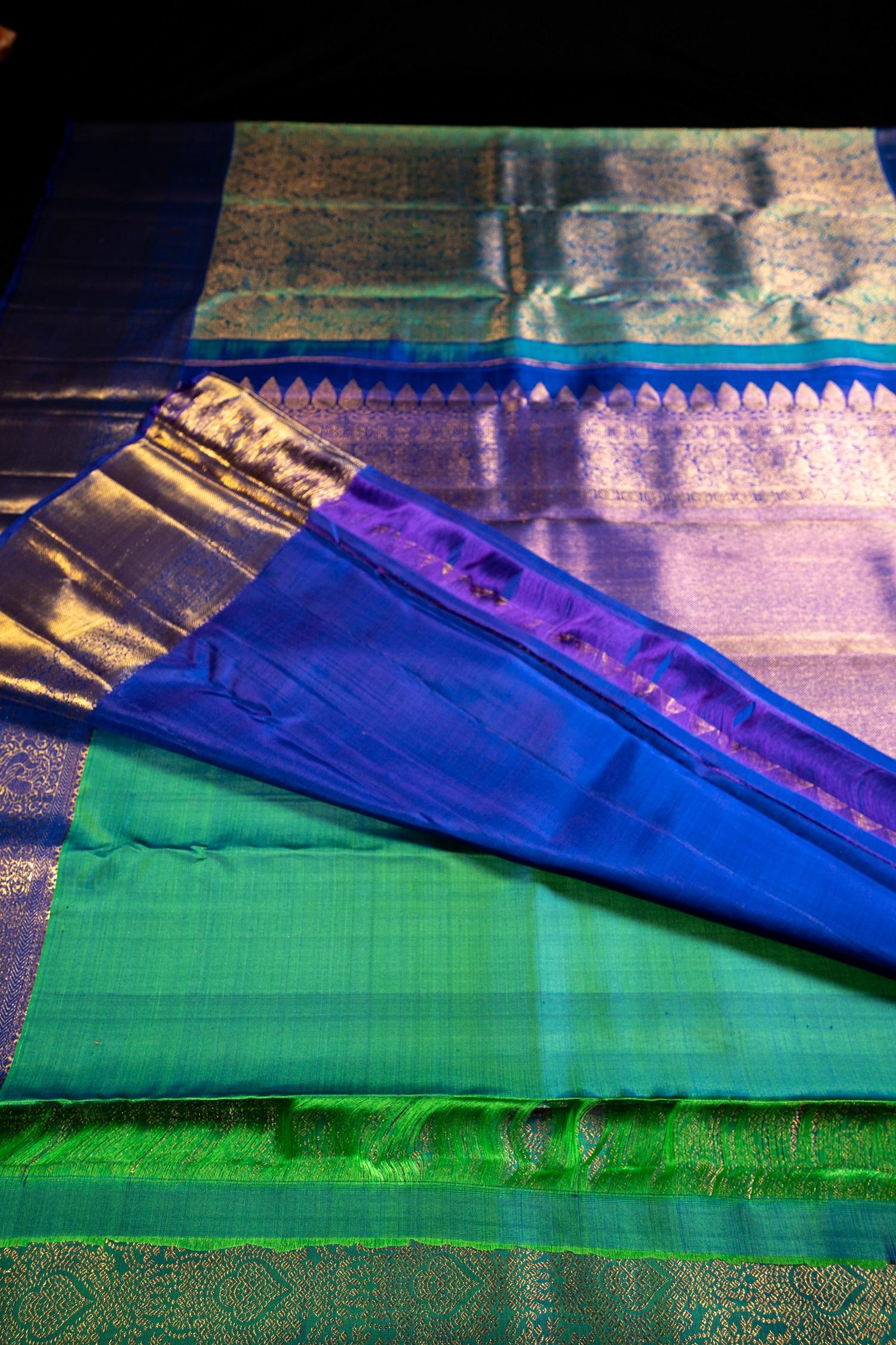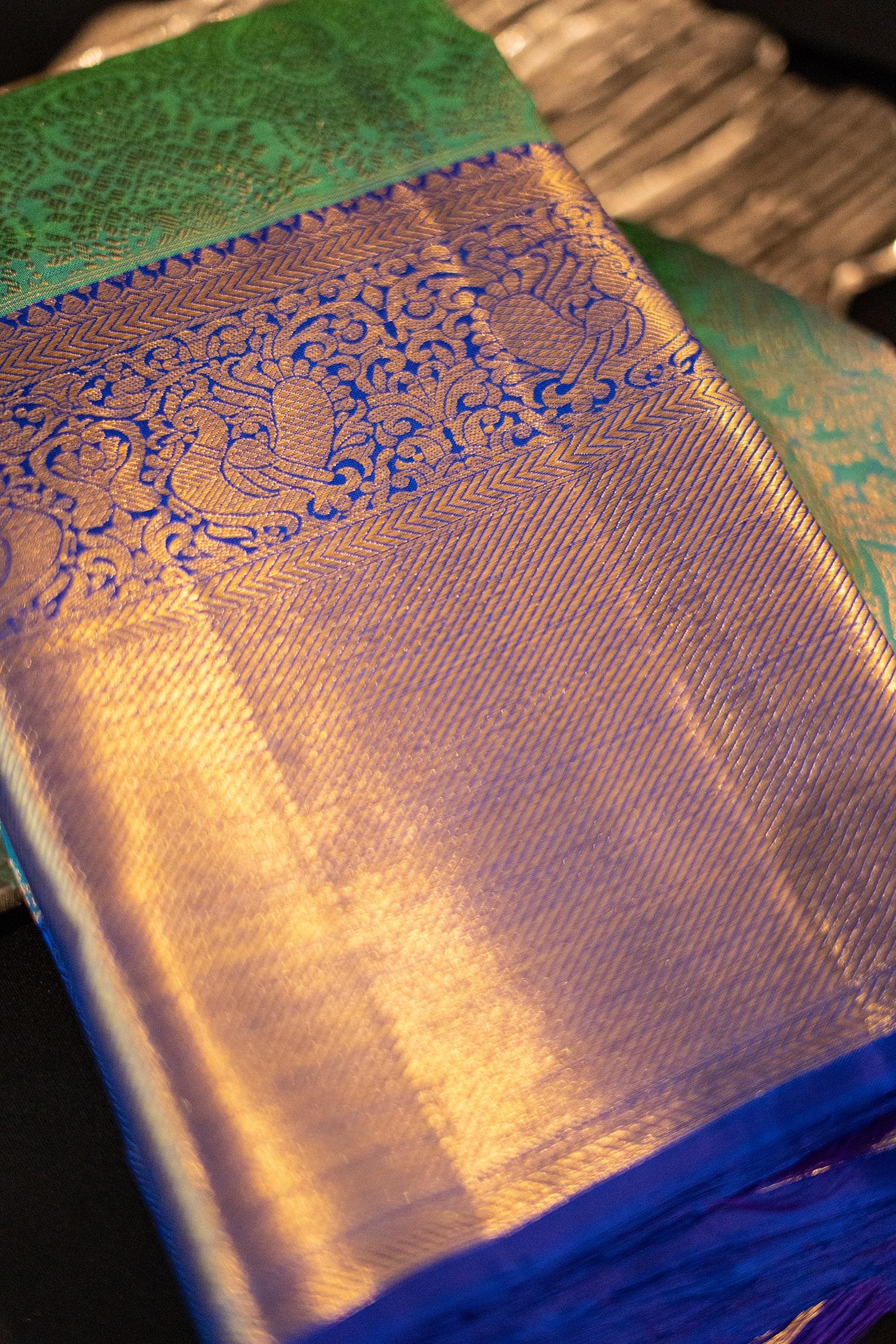 A 2 gram gold peacock blue and peacock green kalanetha Kanchipuram silk saree with a contrast blue and gold zari big border is a true masterpiece.The main body of the saree features a stunning peacock blue and peacock green kalanetha (interlocking) design, evoking the majesty and beauty of the peacock. The 2 gram gold thread weaving adds an unmistakable touch of luxury and glamour. The Kanchipuram silk fabric provides a lustrous sheen and smooth texture, enhancing the saree's visual appeal. The contrast blue and gold zari big border adds a bold and dramatic contrast, creating a striking visual effect that's perfect for formal events, weddings, or special occasions. The combination of peacock blue, peacock green, gold thread, and gold zari creates a captivating and regal look, evoking the splendor of royalty and celebration.
