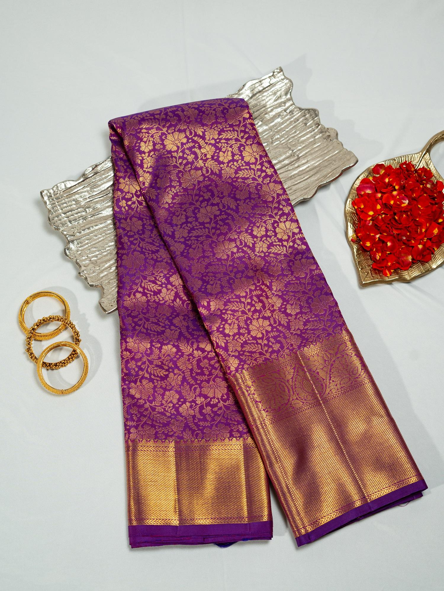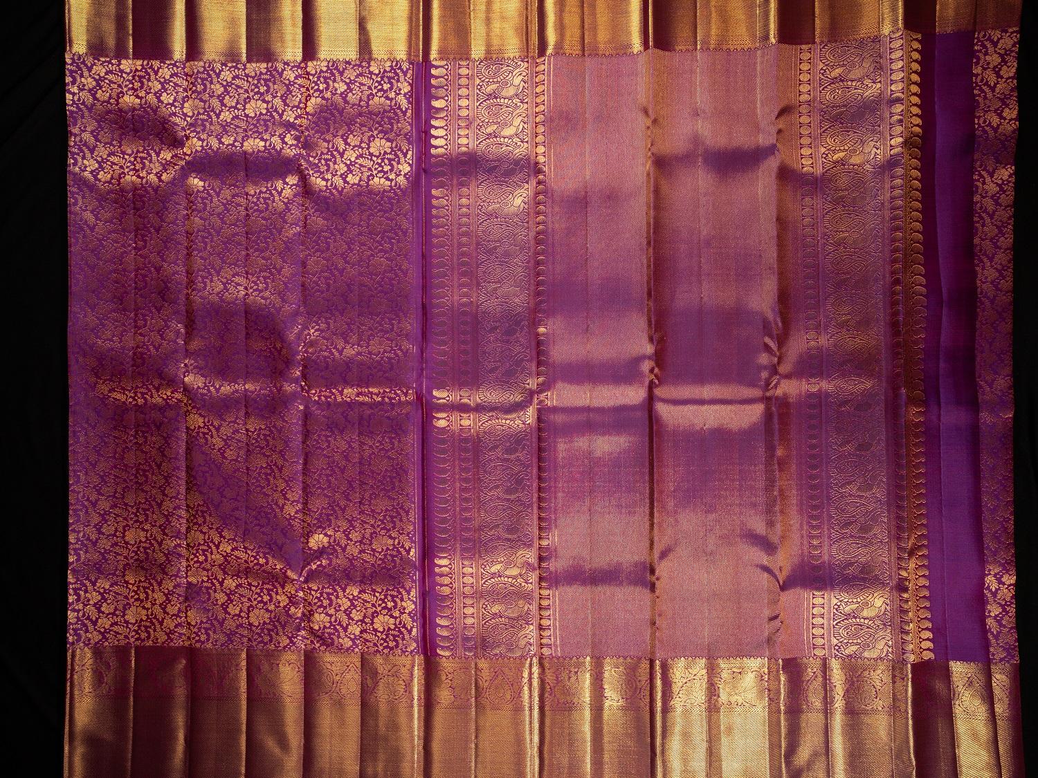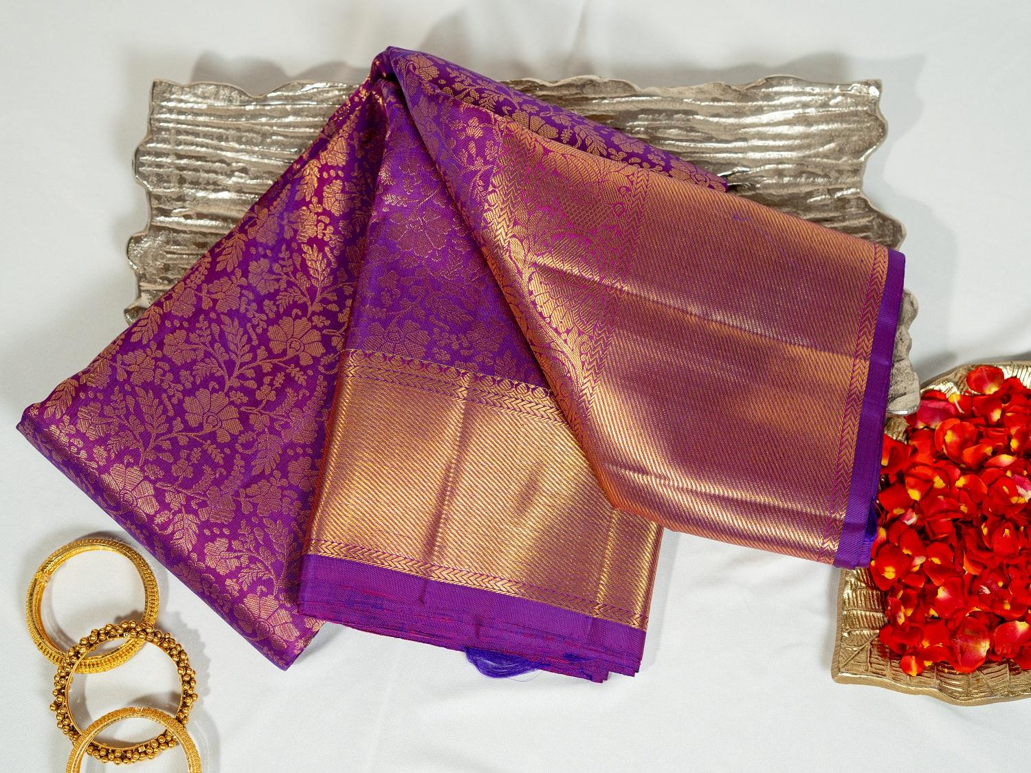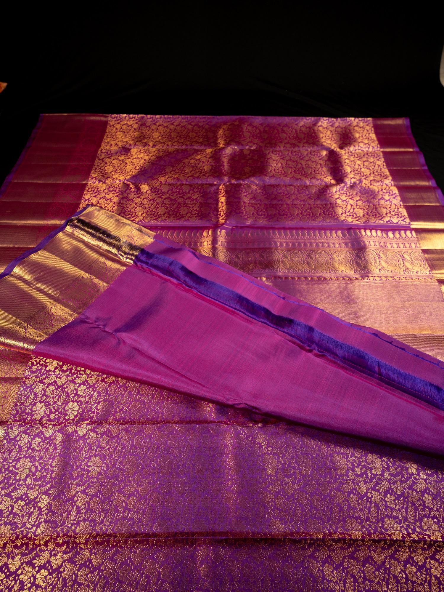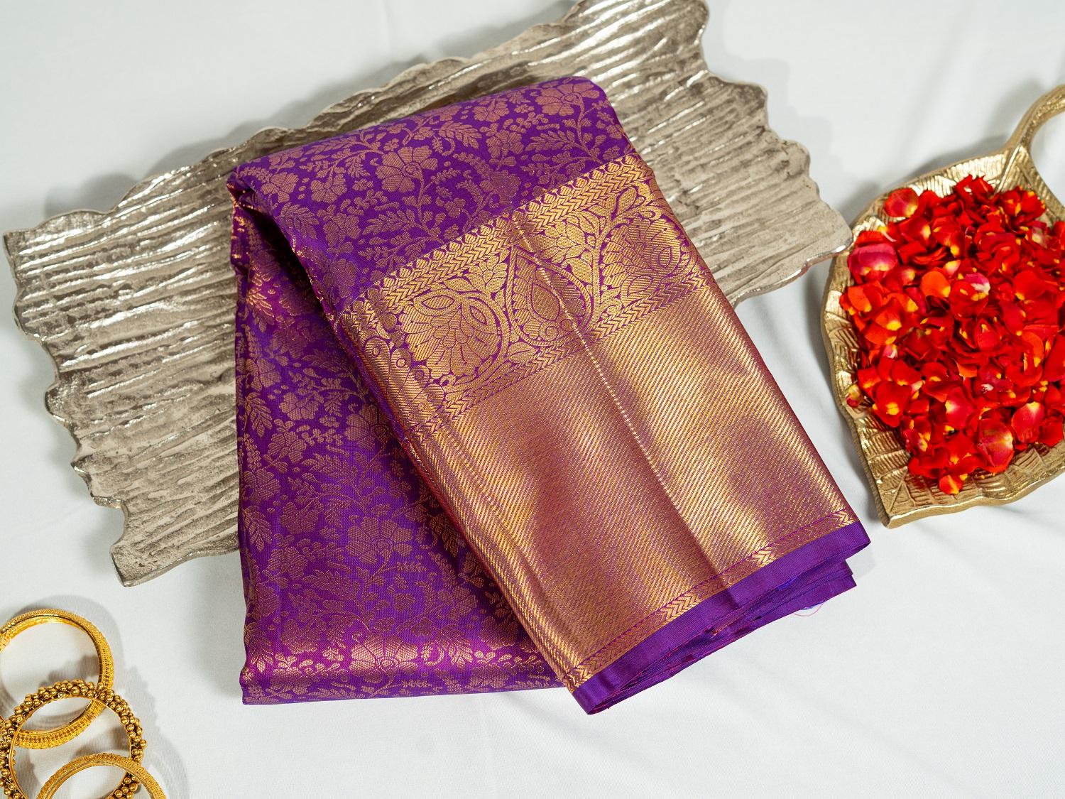 A 2 gram gold purple Kanchipuram silk saree with a self gold zari big border is a truly regal and opulent ensemble.The main body of the saree is a rich and luxurious purple, evoking the grandeur and sophistication of royalty. The 2 gram gold thread weaving adds an unmistakable touch of luxury and glamour. The Kanchipuram silk fabric provides a lustrous sheen and smooth texture, enhancing the saree's visual appeal. The self gold zari big border adds a bold and dramatic contrast, creating a striking visual effect that's perfect for formal events, weddings, or special occasions. The combination of purple, gold thread, and gold zari creates a captivating and majestic look, evoking the splendor of royalty and celebration.