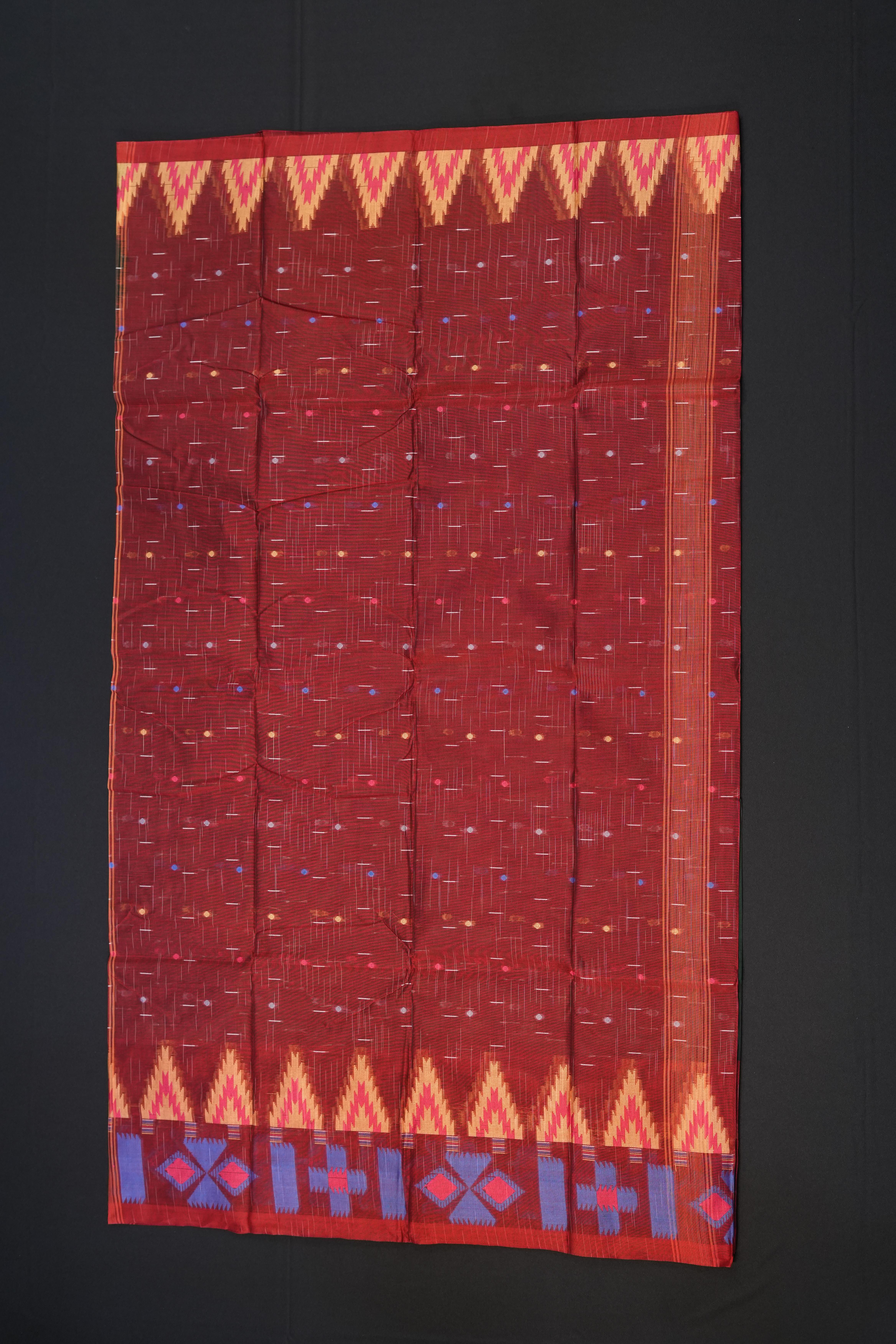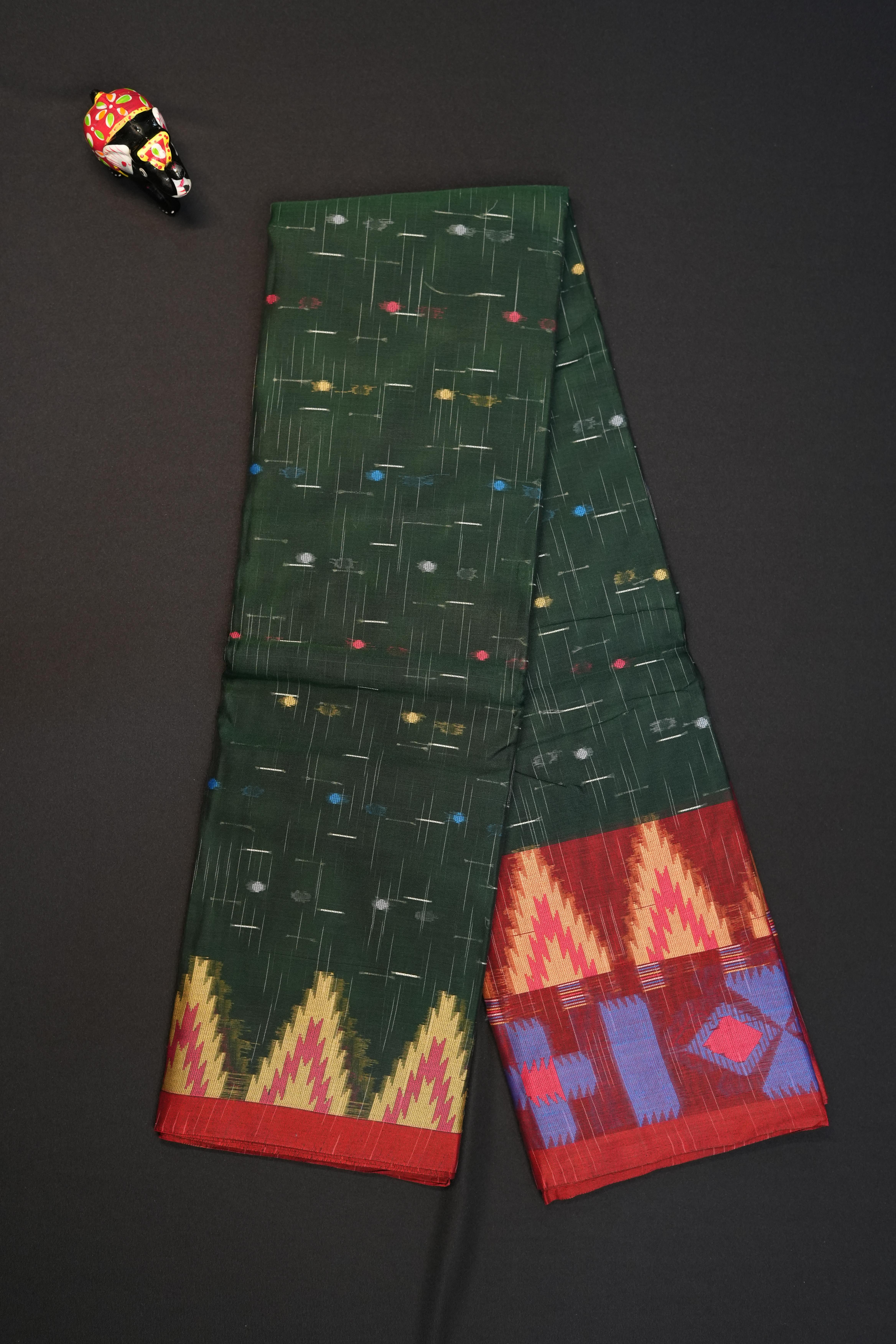 The saree features butta, giving it a timeless appeal with fine craftsmanship. Border: The contrast red small border enhances the look with a balanced contrast. Pallu: The pallu is designed with contrast floral motifs, adding a traditional touch to the entire ensemble.