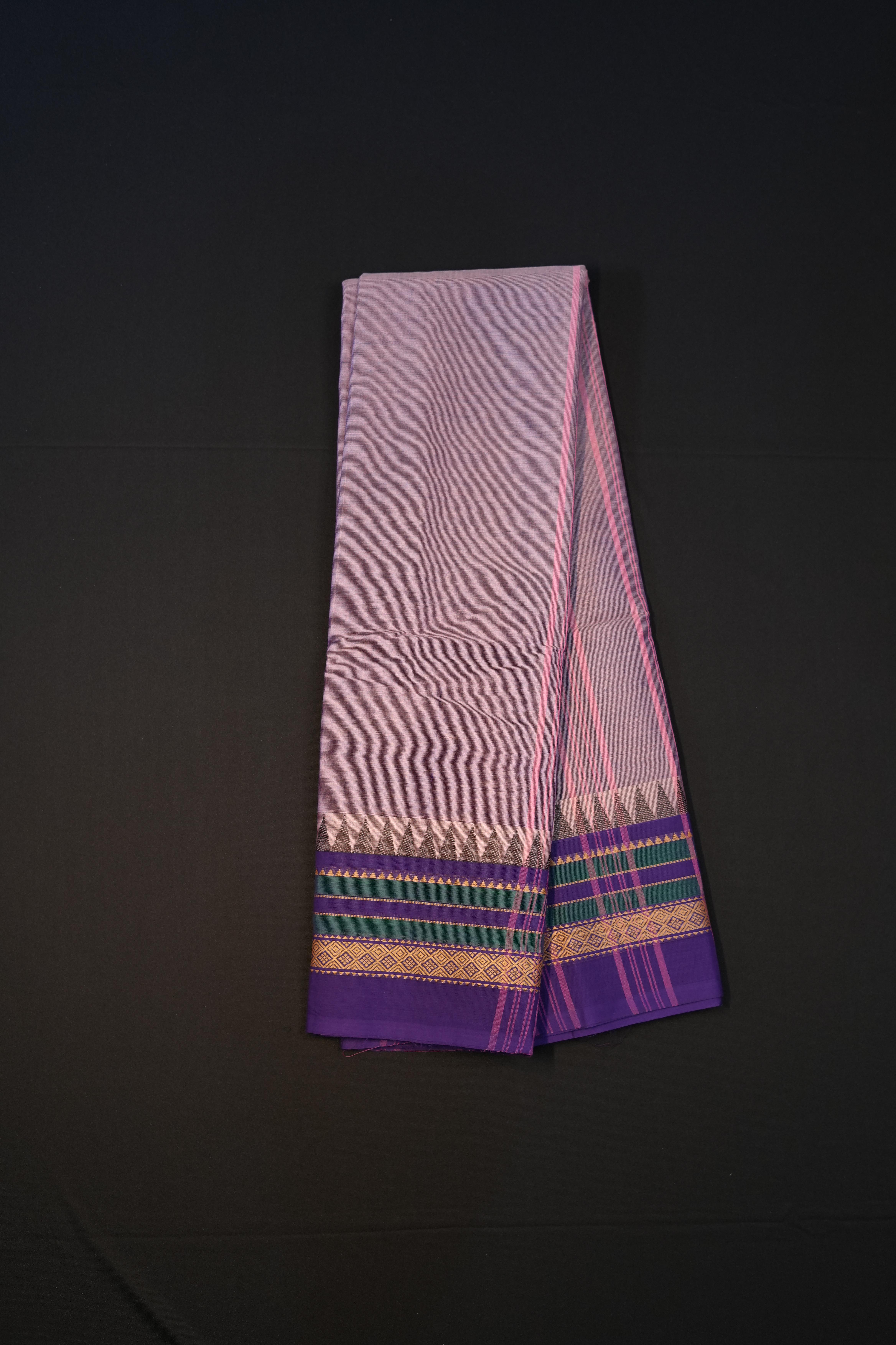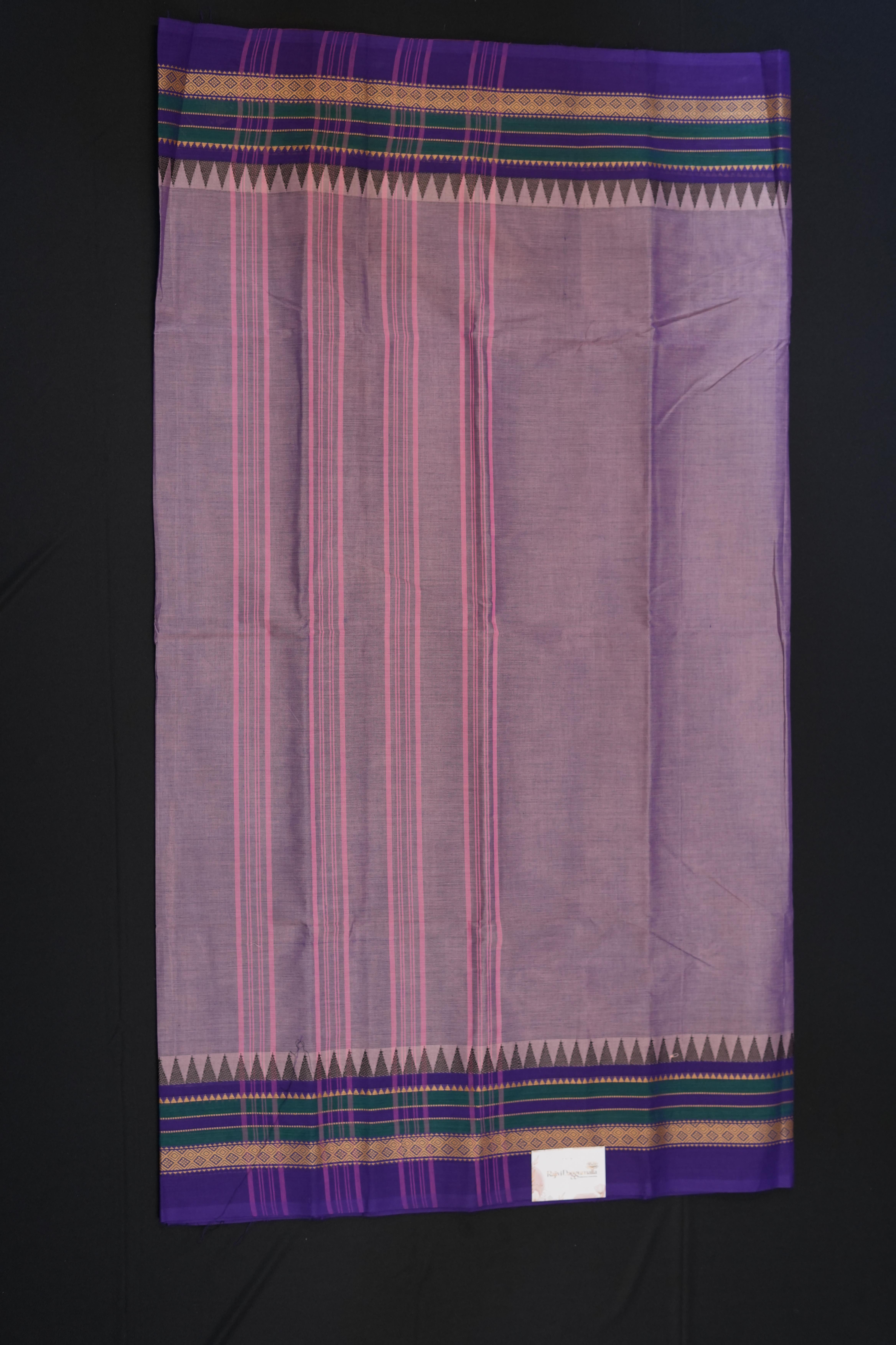This saree features a plain body creating a warm and inviting look. Border: It is enhanced with a contrast dark violet small border,adding a stylish touch. Pallu: The pallu is designed with contrast cream threaded lines.