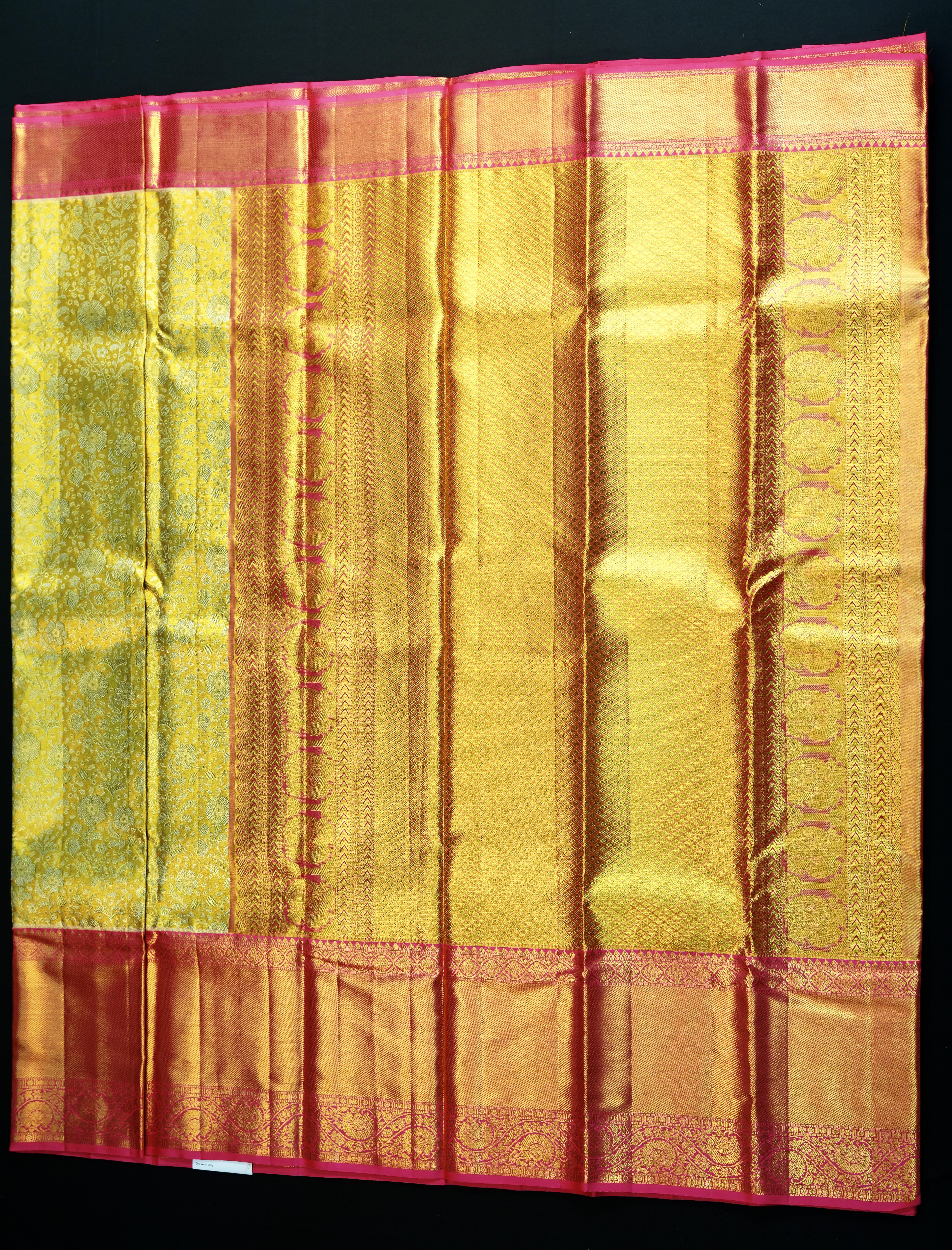 lluminating a divine aura, this alluring Vibrant green kanjivaram silk saree with floral pattern all over the body, merged with contrast pink and gleaming gold zari woven border and pallu.