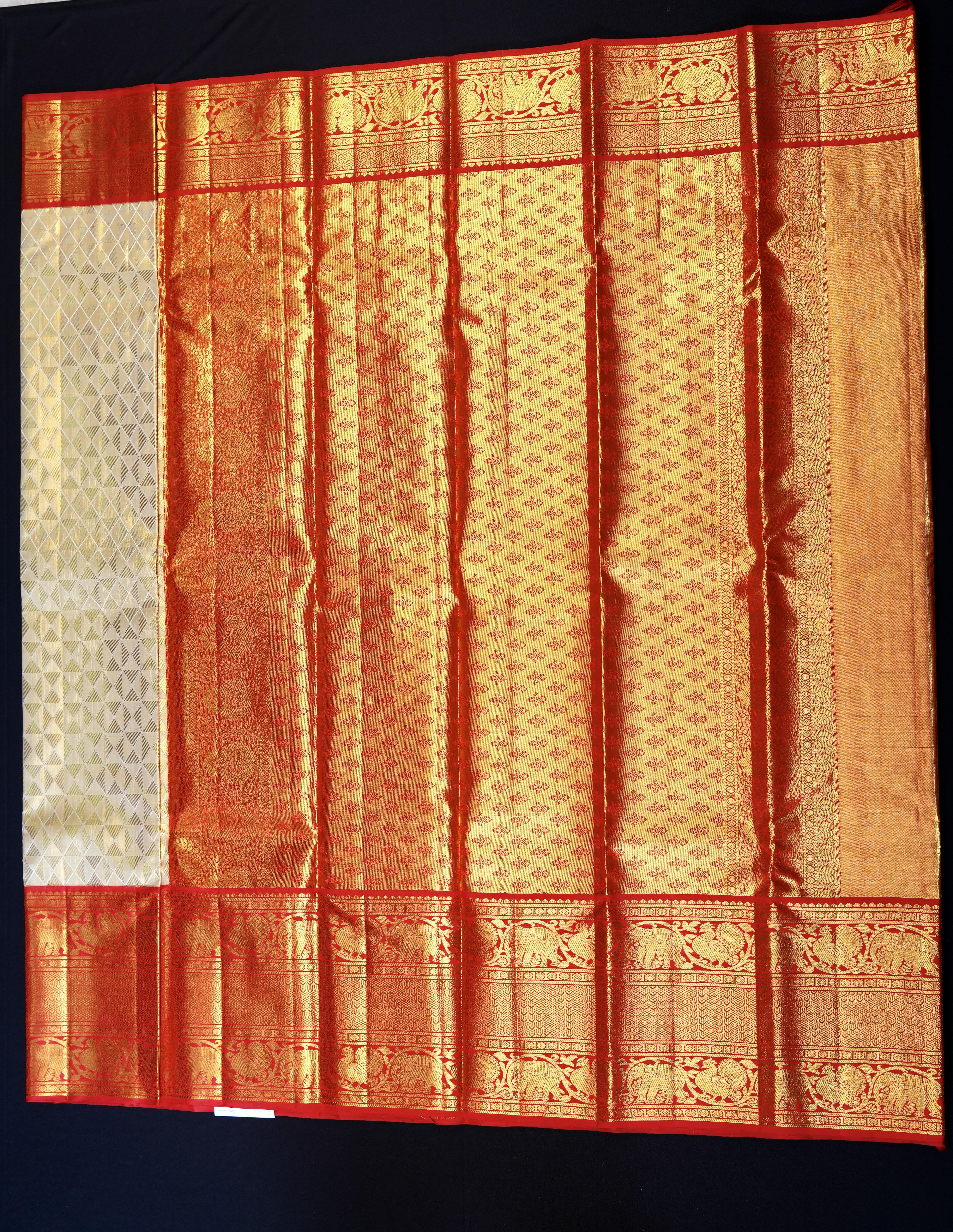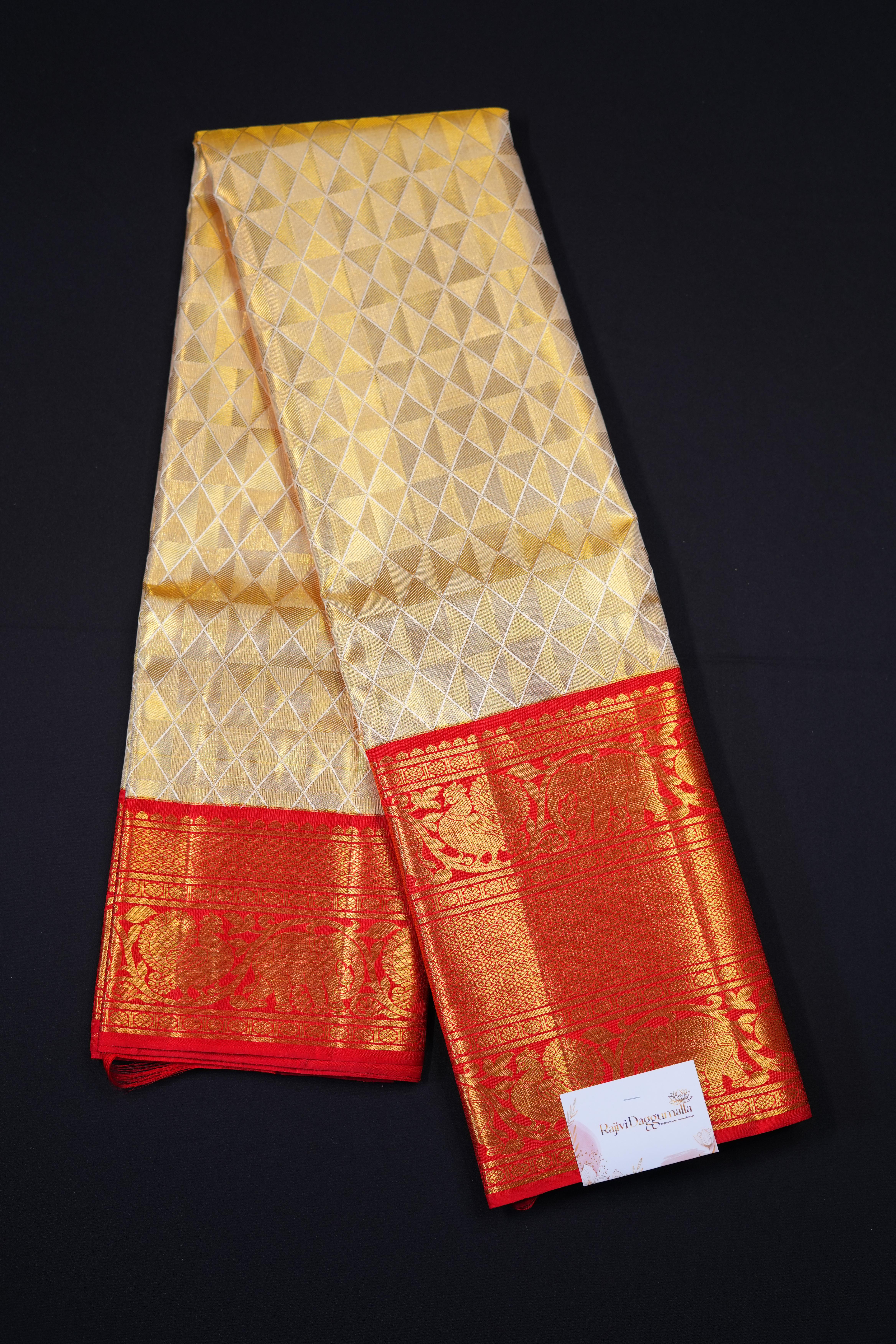 A timeless kanjivaram silk saree in a rich cream and gold dual tone color, adorned with a majestic contrast red border and pallu showcasing intricate geometrical motifs woven in lustrous gold zari. This elegant saree is perfect for festive occasions and parties.