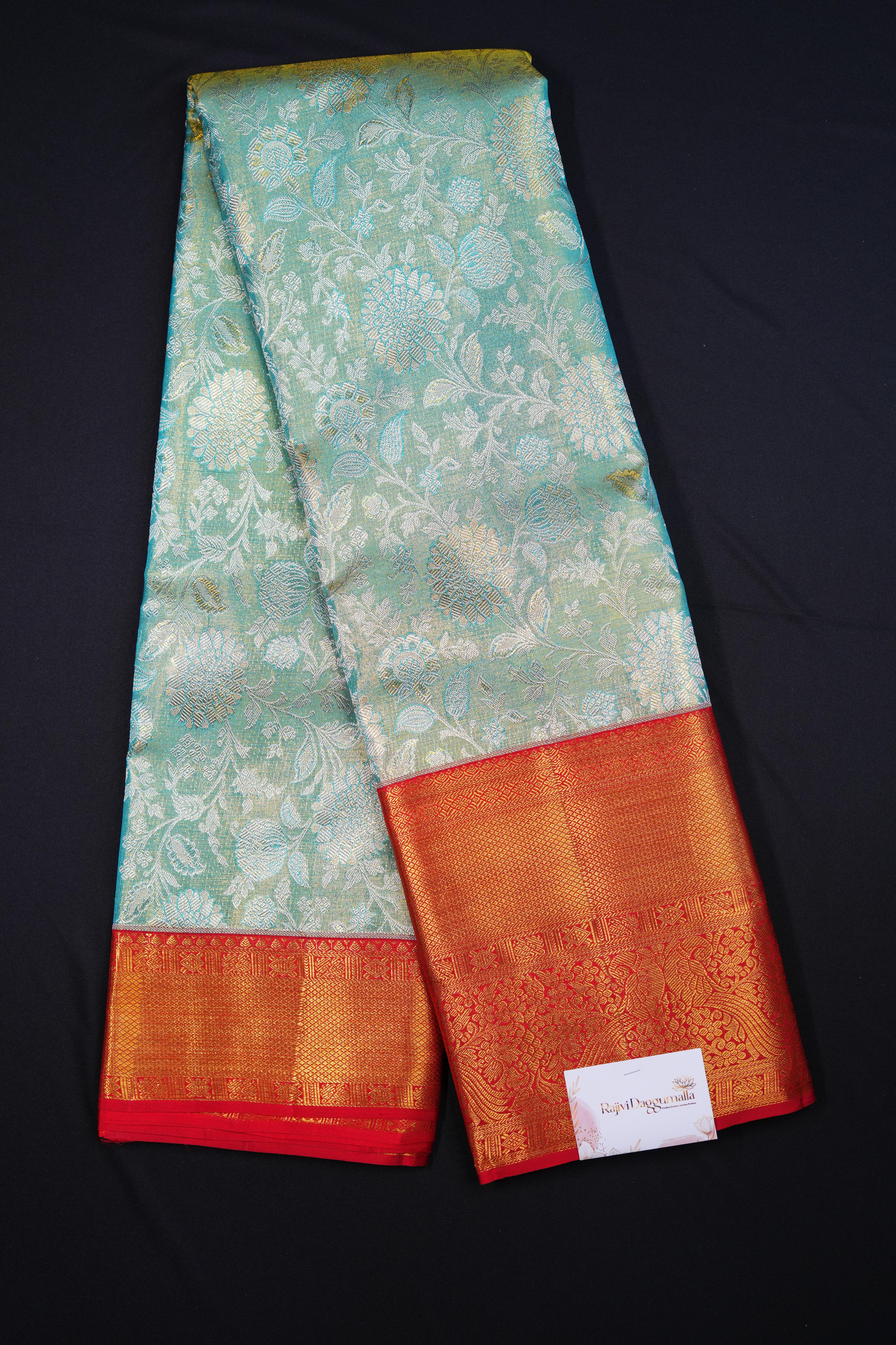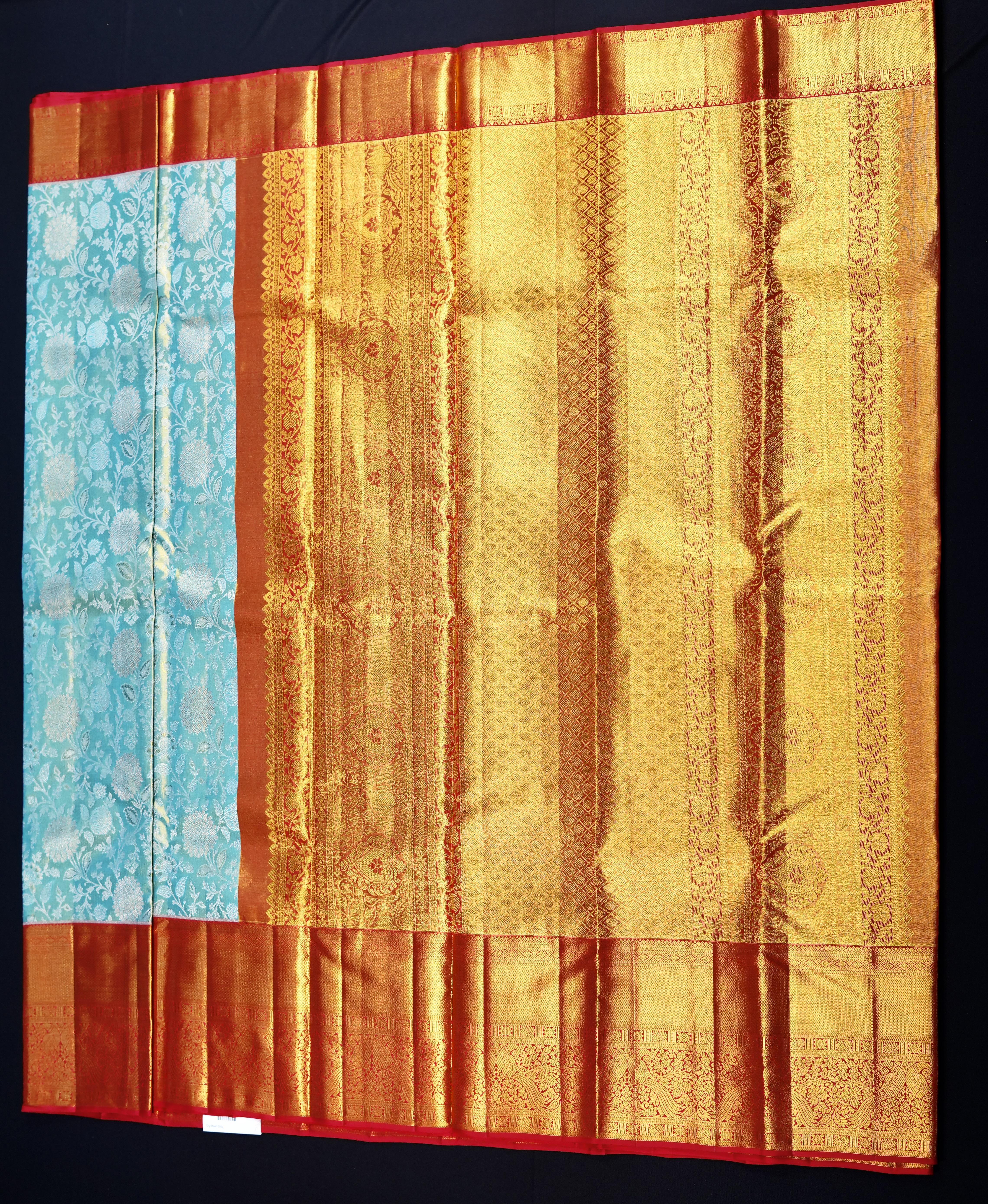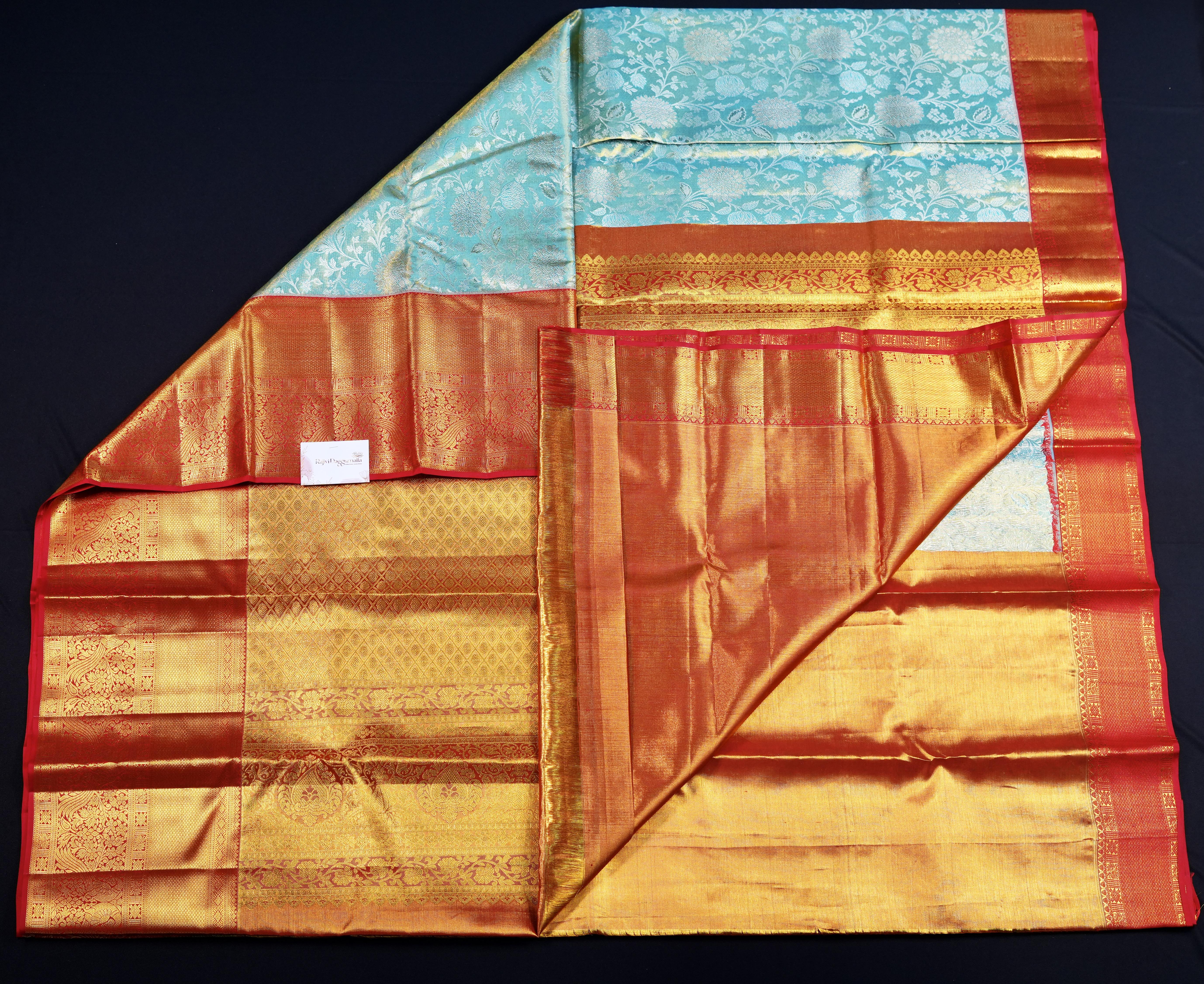 Radiating in the shade of this Pastel Blue Kanjivaram Silk Saree, adorned with gleaming gold zari woven border and pallu in contrast red colour.