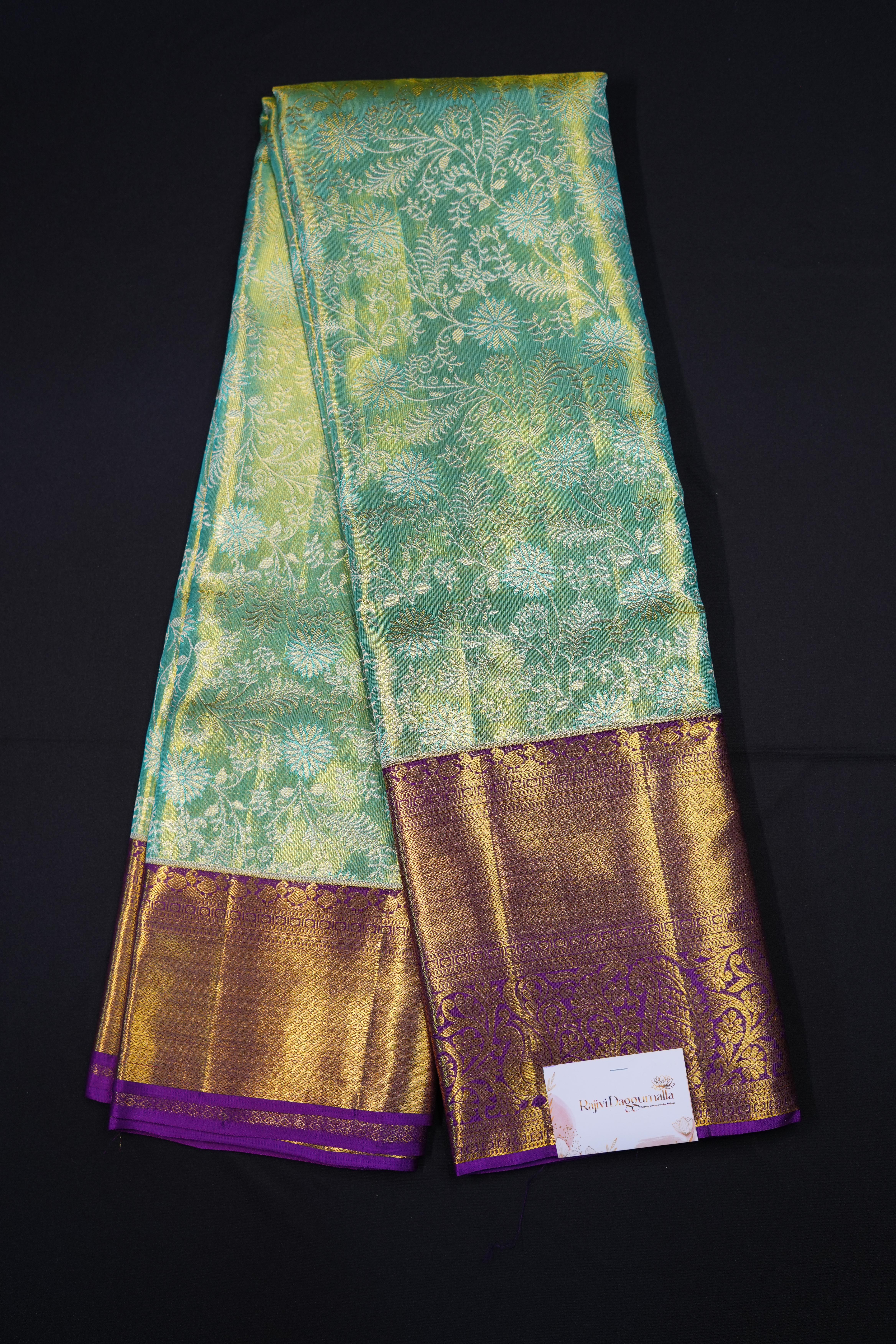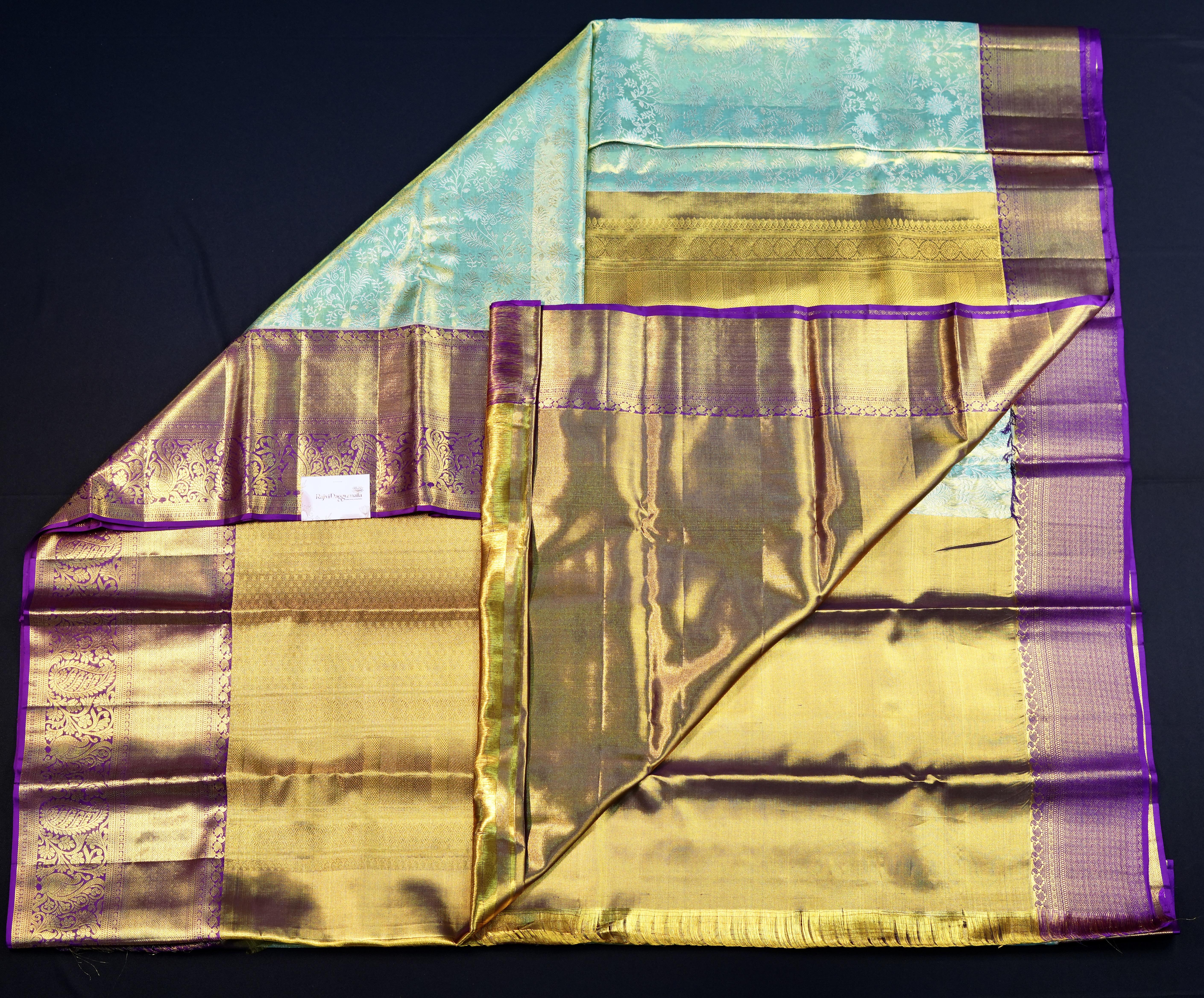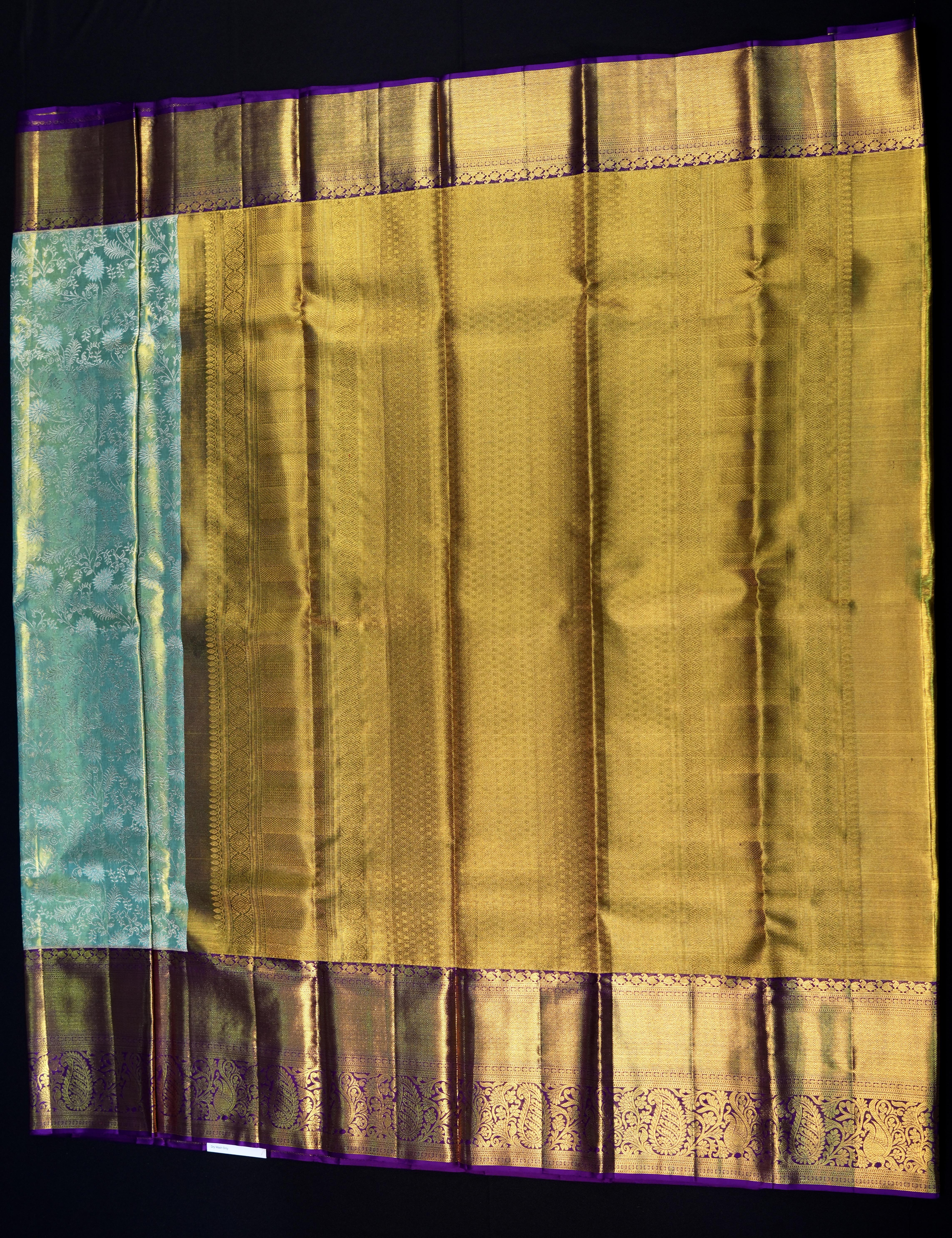 Subtle elegance - this Pastel Green-Gold Kanjivaram Silk Saree features intrucate gold zari ogival weaving and a contrasting purple border, with floral creeper and kaddi pattern. The soft green elegantly complements Indian skin tones. Drape it for festivals and weddings.