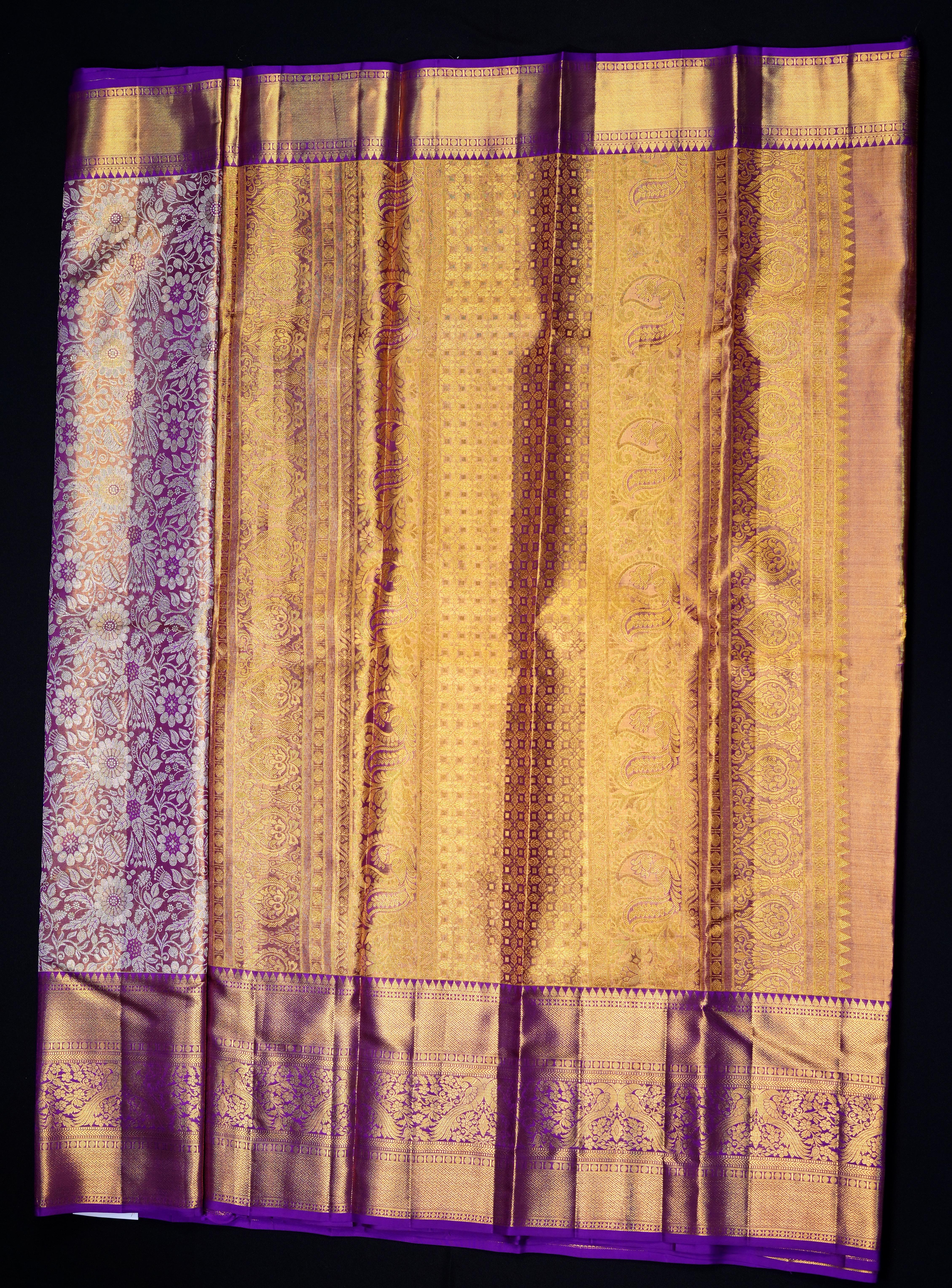 Delicate and precious, this regal Purple Kanjivaram Silk Saree is intricately woven with gold zari, featuring floral weaving. The big border and pallu is designed with floral creeper and kaddi pattern that creates grandeur.