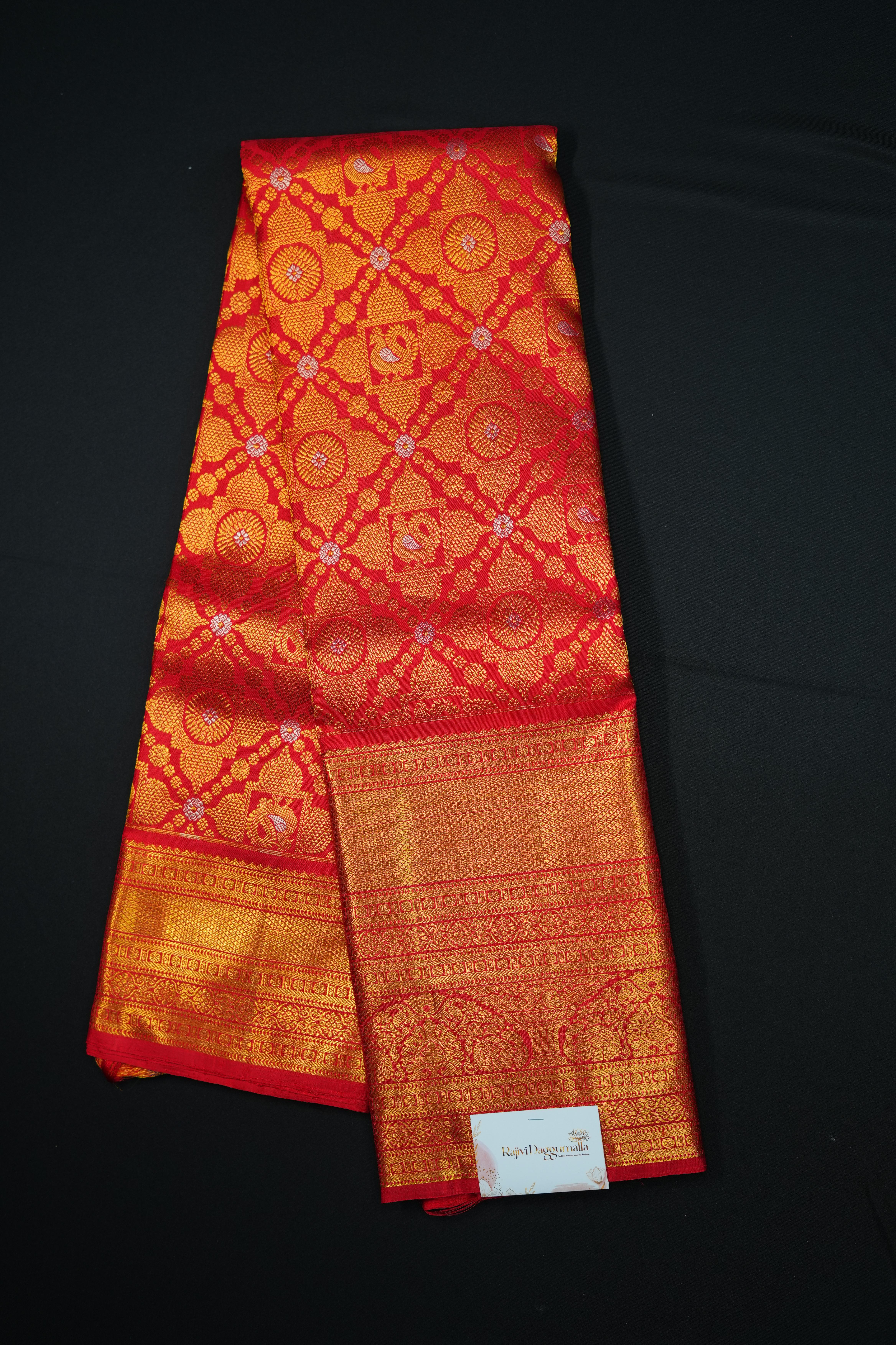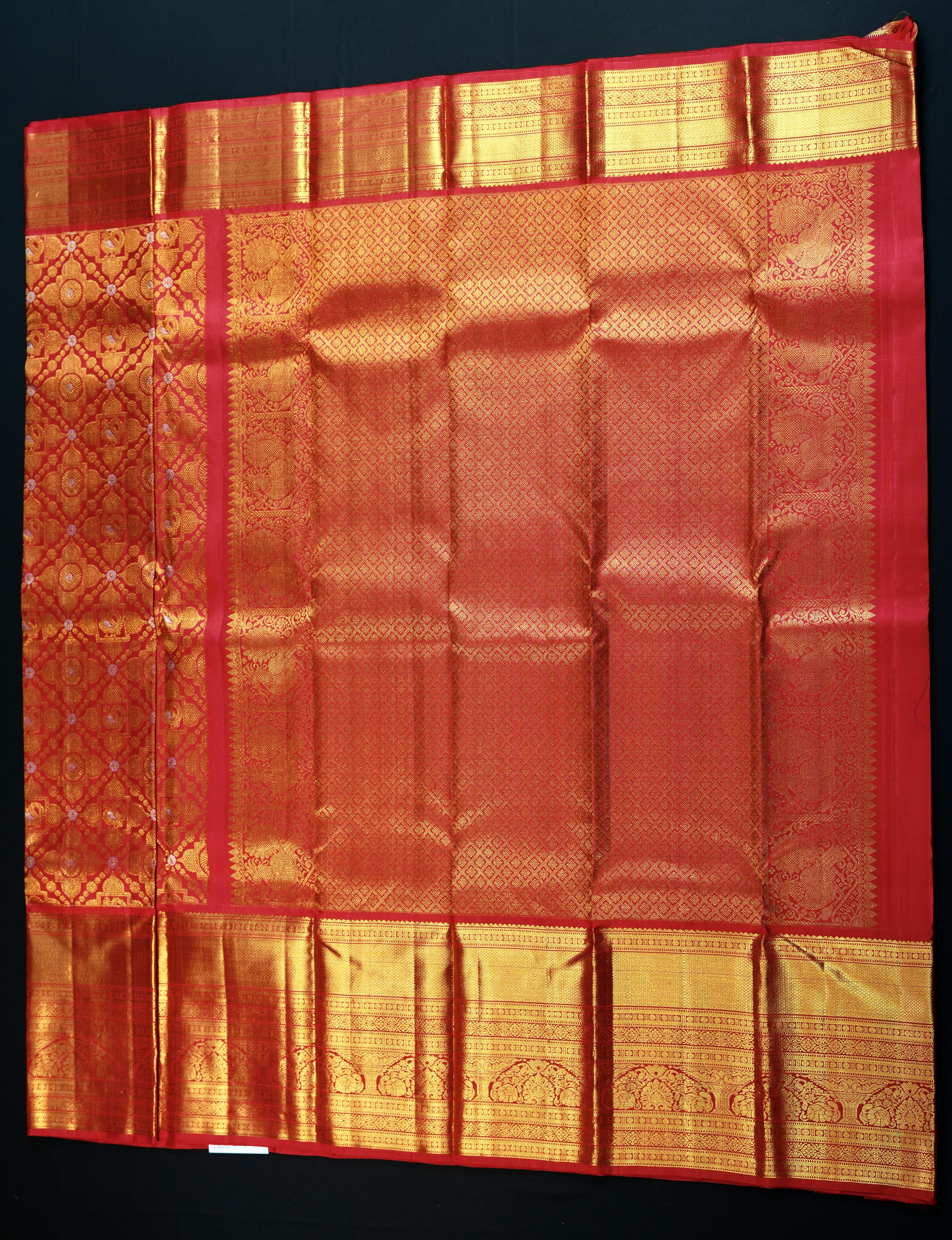 A stunning bright red kanjivaram silk saree featuring the floral jaal motif woven throughout in rich gold zari threads. The broad border and pallu presents a spectacular canvas of intertwined kaddi pattern amid floral vines. Perfect for bridal ceremonies and traditional functions.