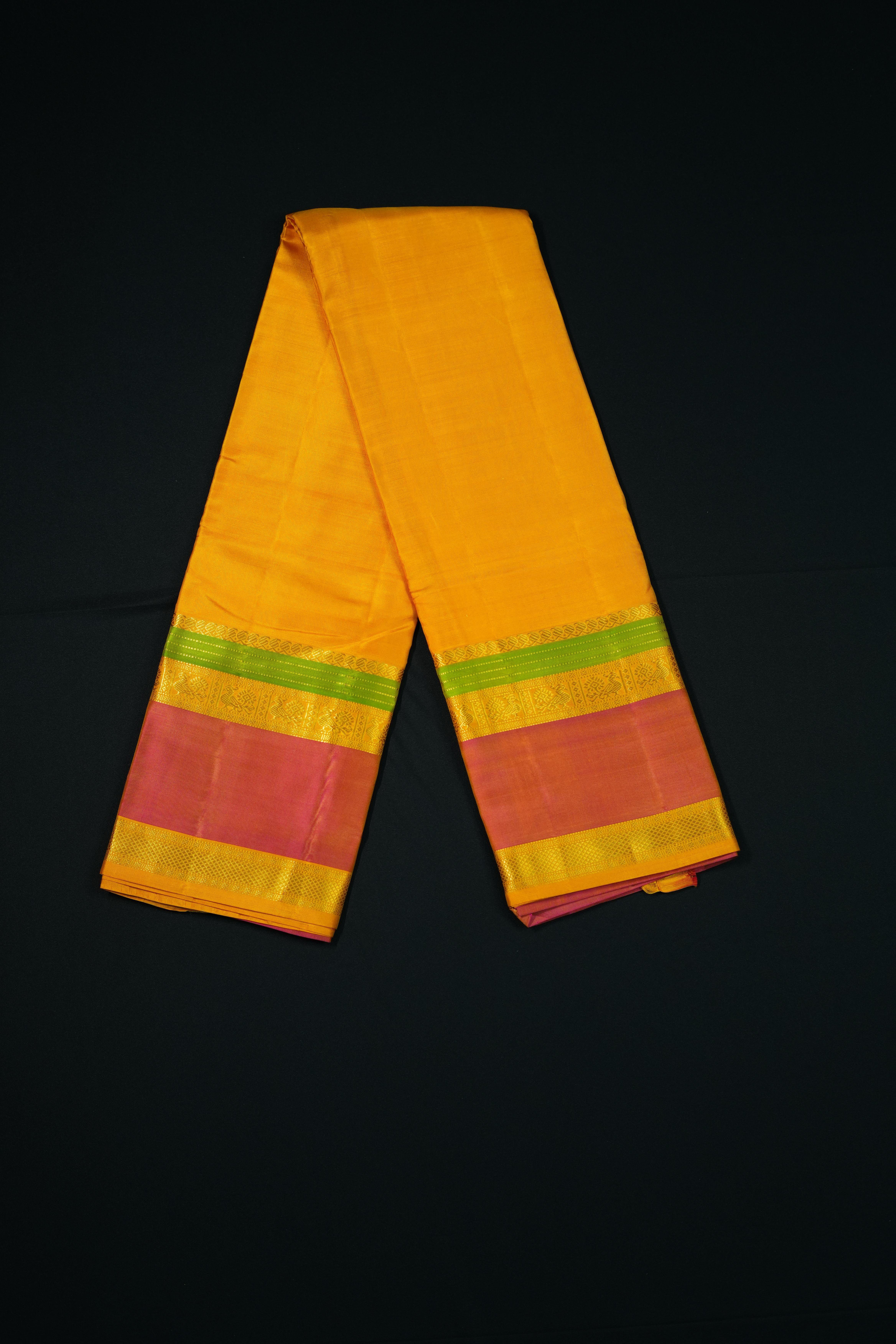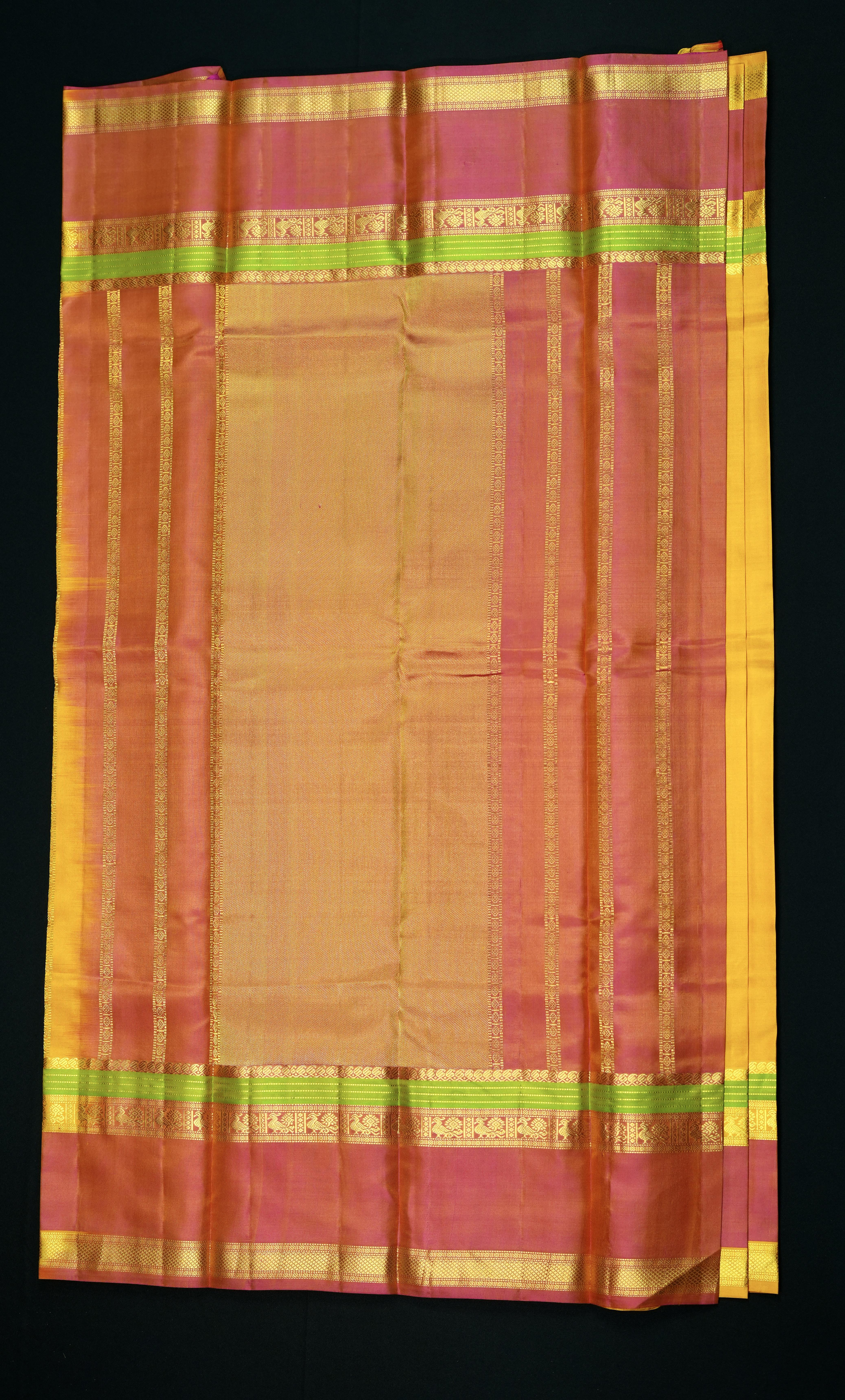 Features a plain yellow body that highlights the richness of the Kanchipuram silk. Border: A bold contrast pink gap border adds a dramatic and traditional flair. Pallu: The contrast gold zari vertical lines pallu lends an elegant and structured appeal. Blouse: Comes with a contrast pink plain blouse with zari borders for a sleek and balanced look.