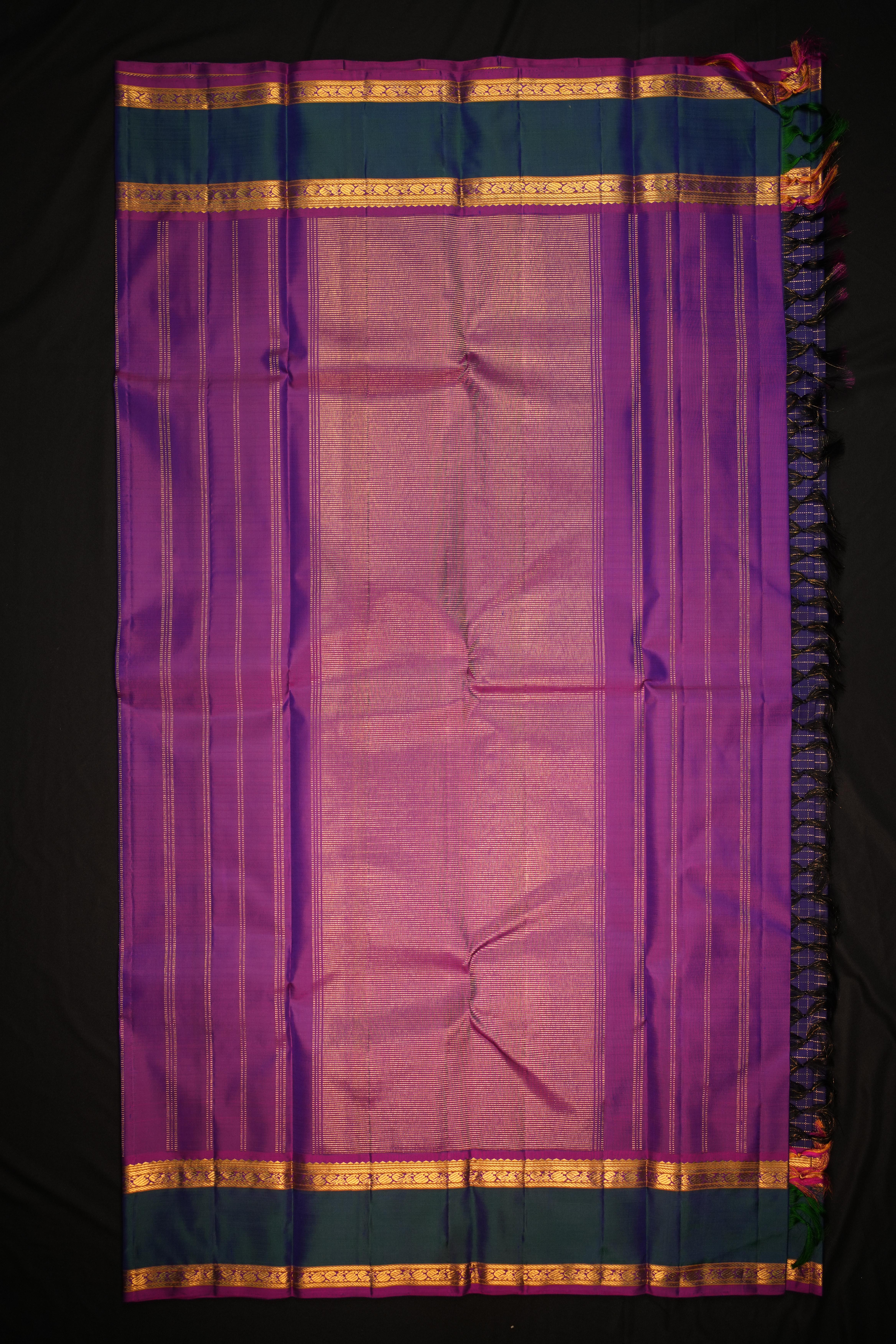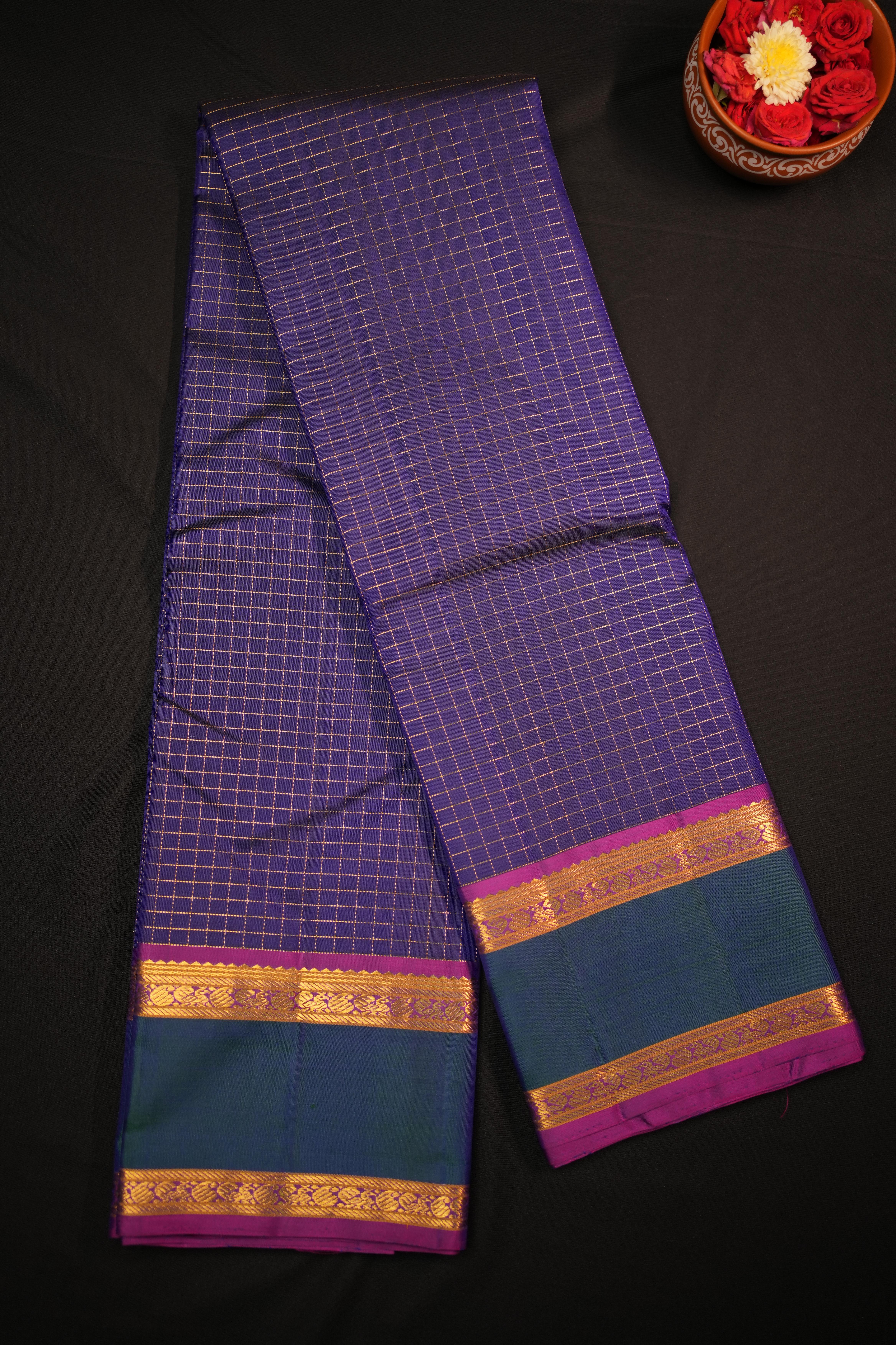 This exquisite Kanchipuram Silk Checks Blue Saree is perfect for weddings or brides. The saree features gold zari checks on the body and a self rettai pattu medium border adorned with peacock motifs. The pallu showcases a stunning self gold zari lines design. It comes with a contrast plain pink blouse with borders, adding a touch of elegance to the overall look. Ideal for those who prefer a vibrant color palette for their special occasions.