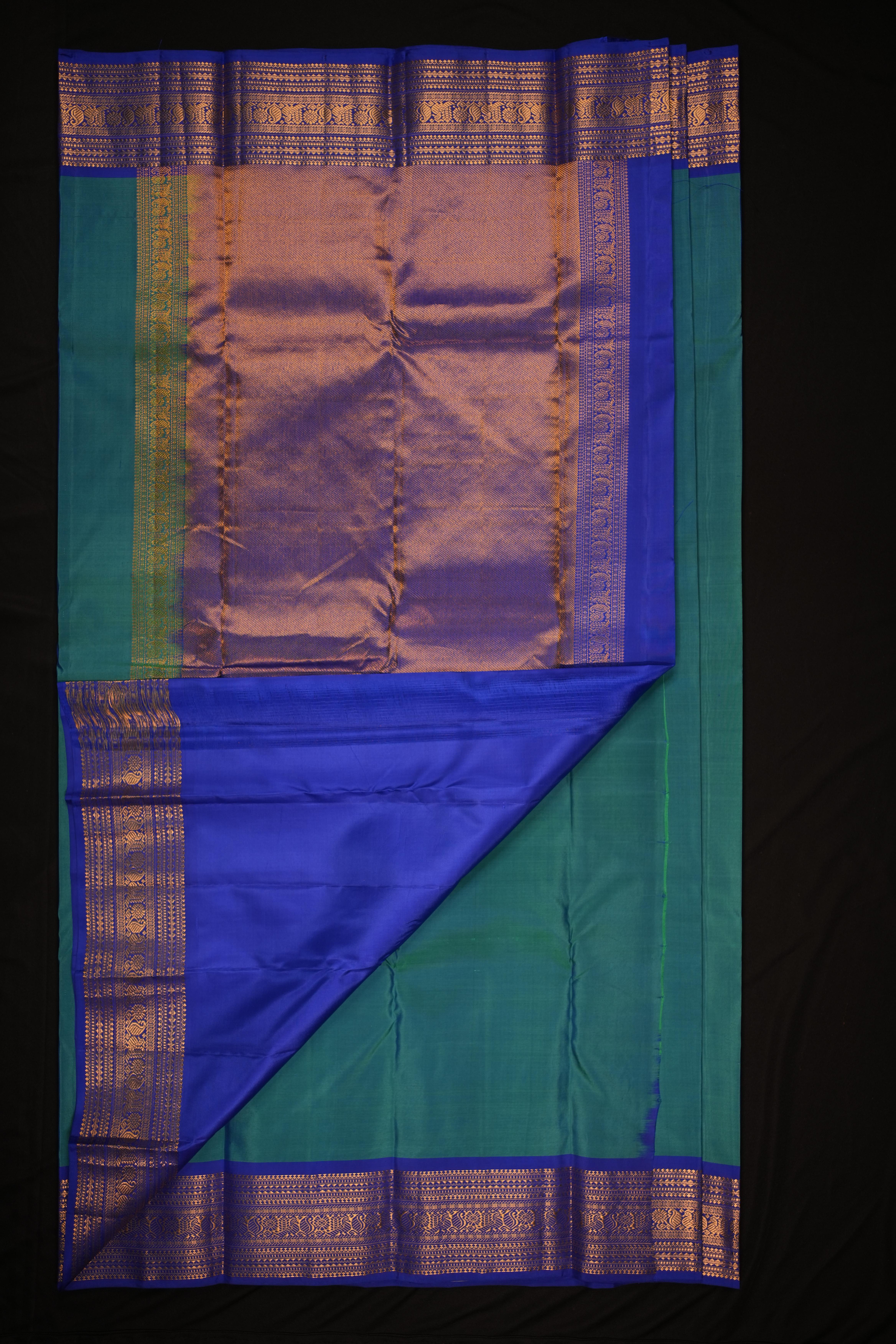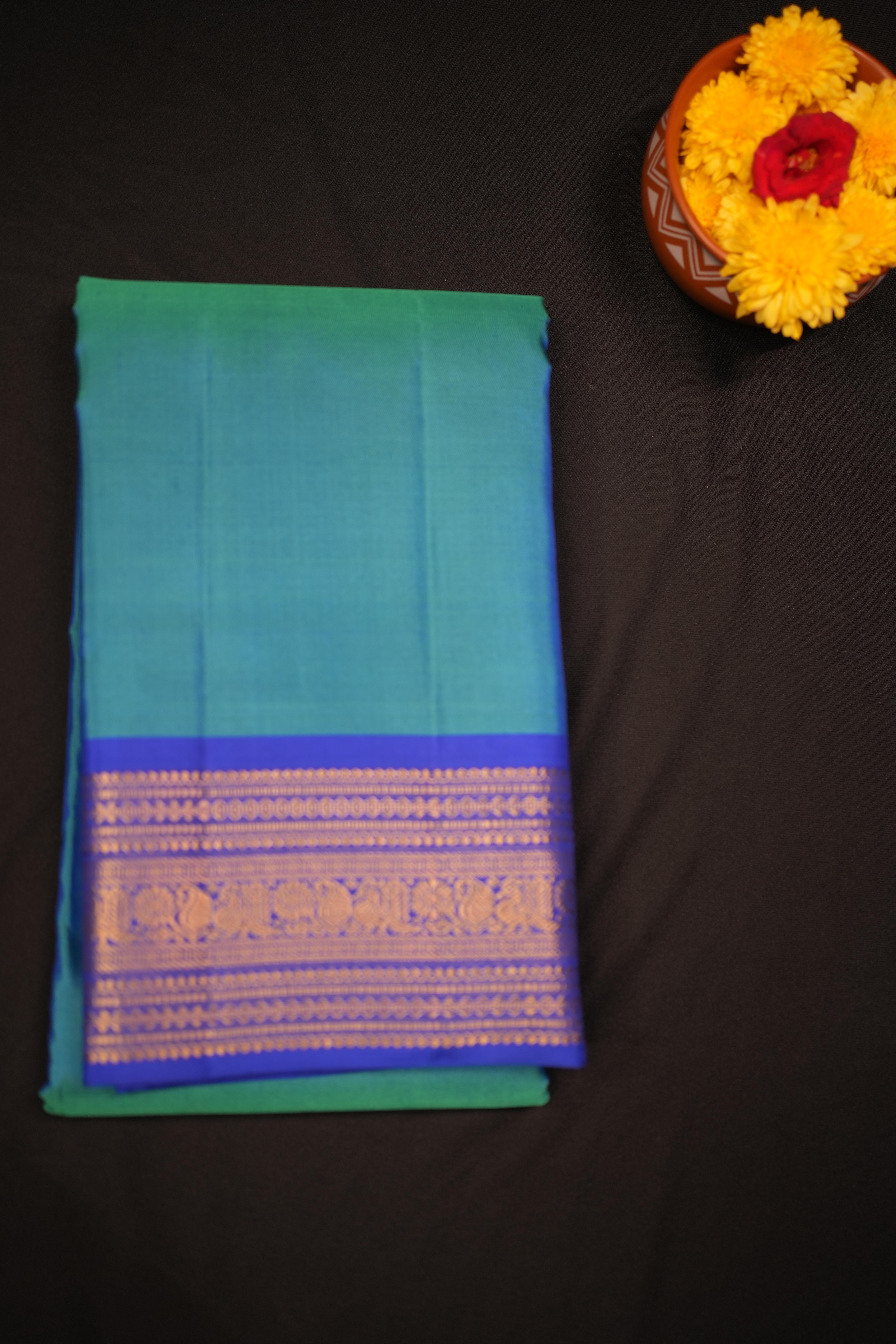 Body: The body of this saree features elegant blue base. Border: The small border is in contrast royal blue adorned with gold zari zigzag lines and peacock motifs, adding a vibrant and intricate touch. Pallu: The pallu features contrast gold zari kaddi with peacock motifs enhancing the saree's overall ornate and cohesive appearance. Blouse: Includes a contrast royal blue plain blouse with zari borders, ensuring a coordinated and polished finish.