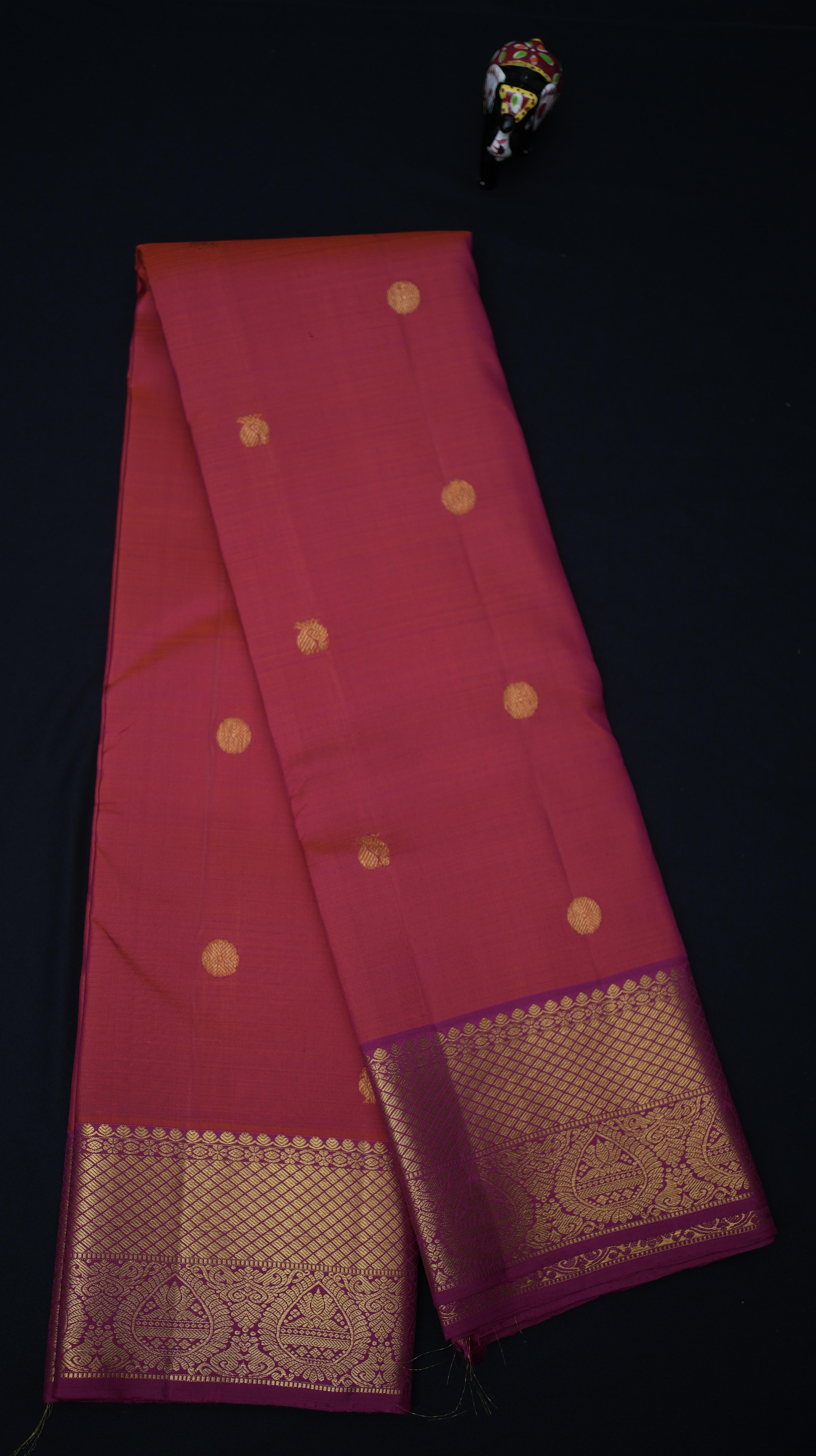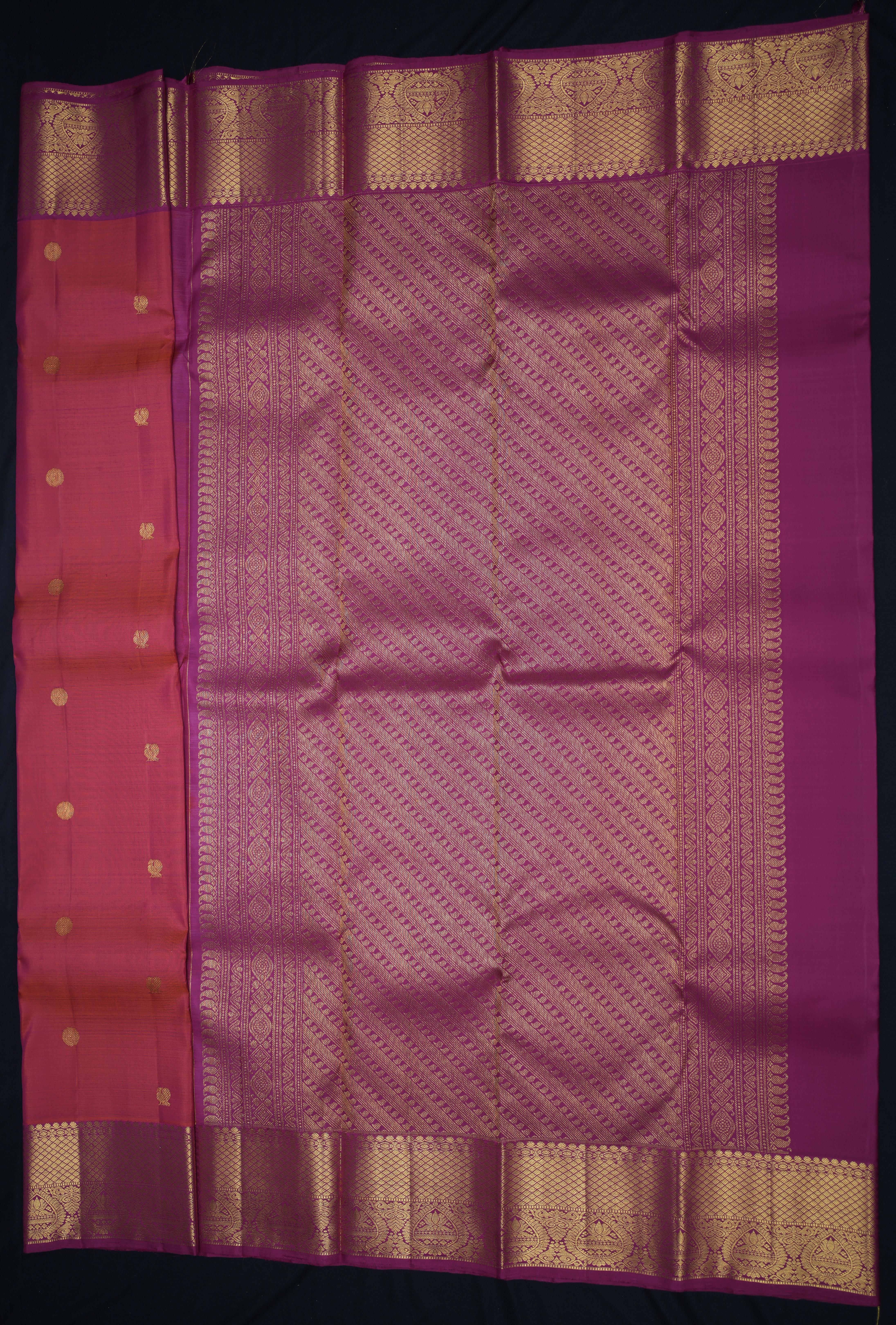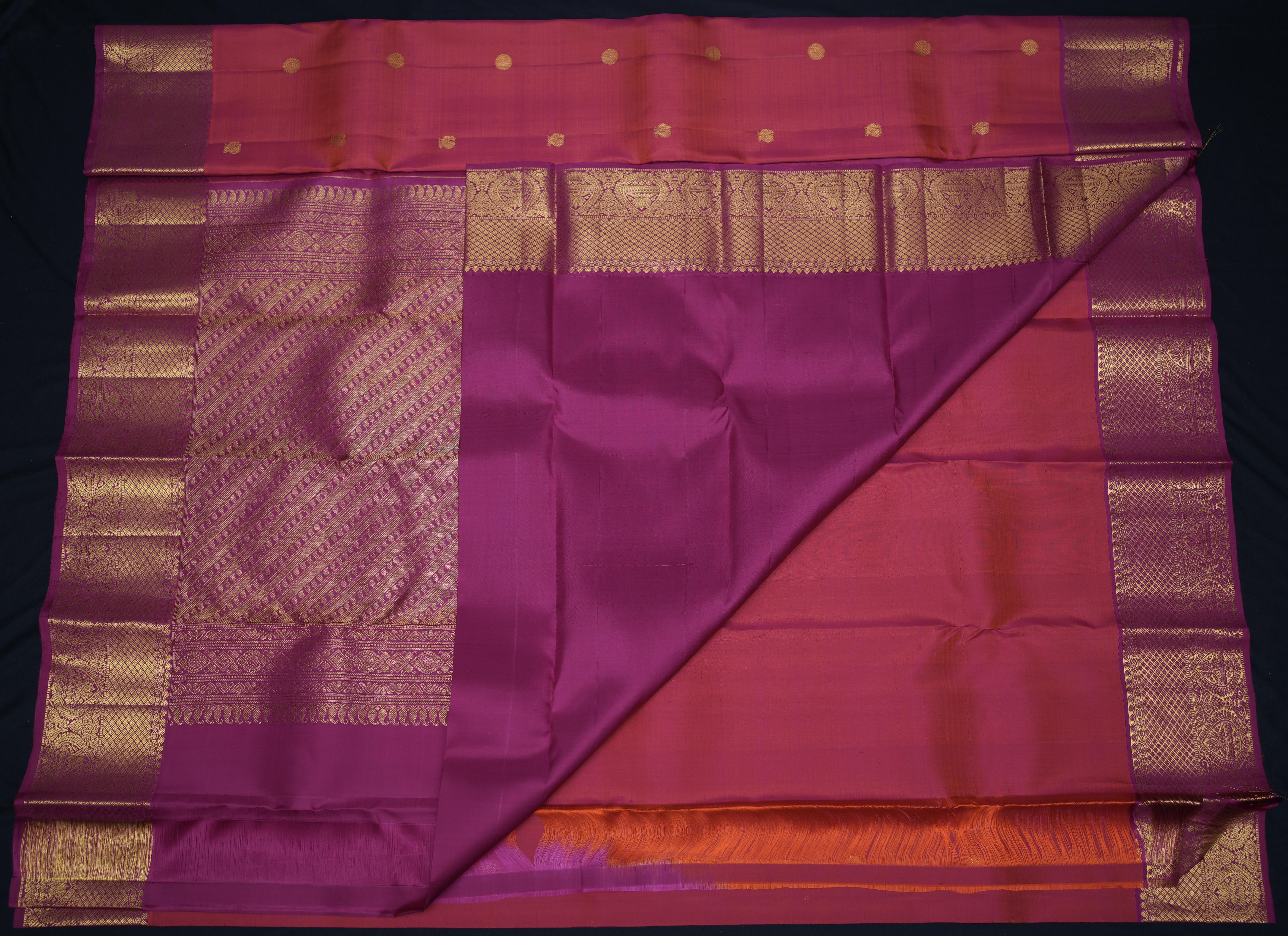 Add a touch of elegance to your wardrobe with this Kanchipuram Silk Peacock Butta Dual Tone Orange Pink Saree. The beautiful pink hue and intricate design make it perfect for any occasion. Made from high-quality silk, this saree is comfortable to wear and drapes beautifully. Pair it with statement jewelry to complete your look.