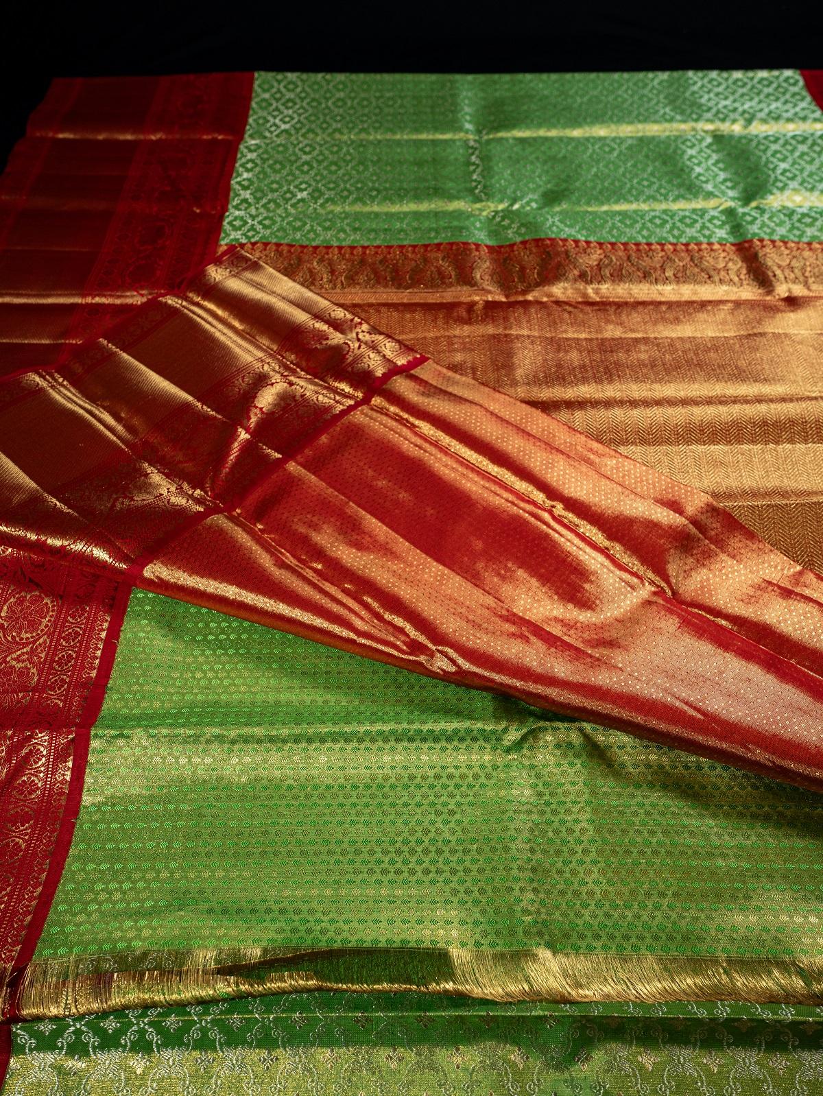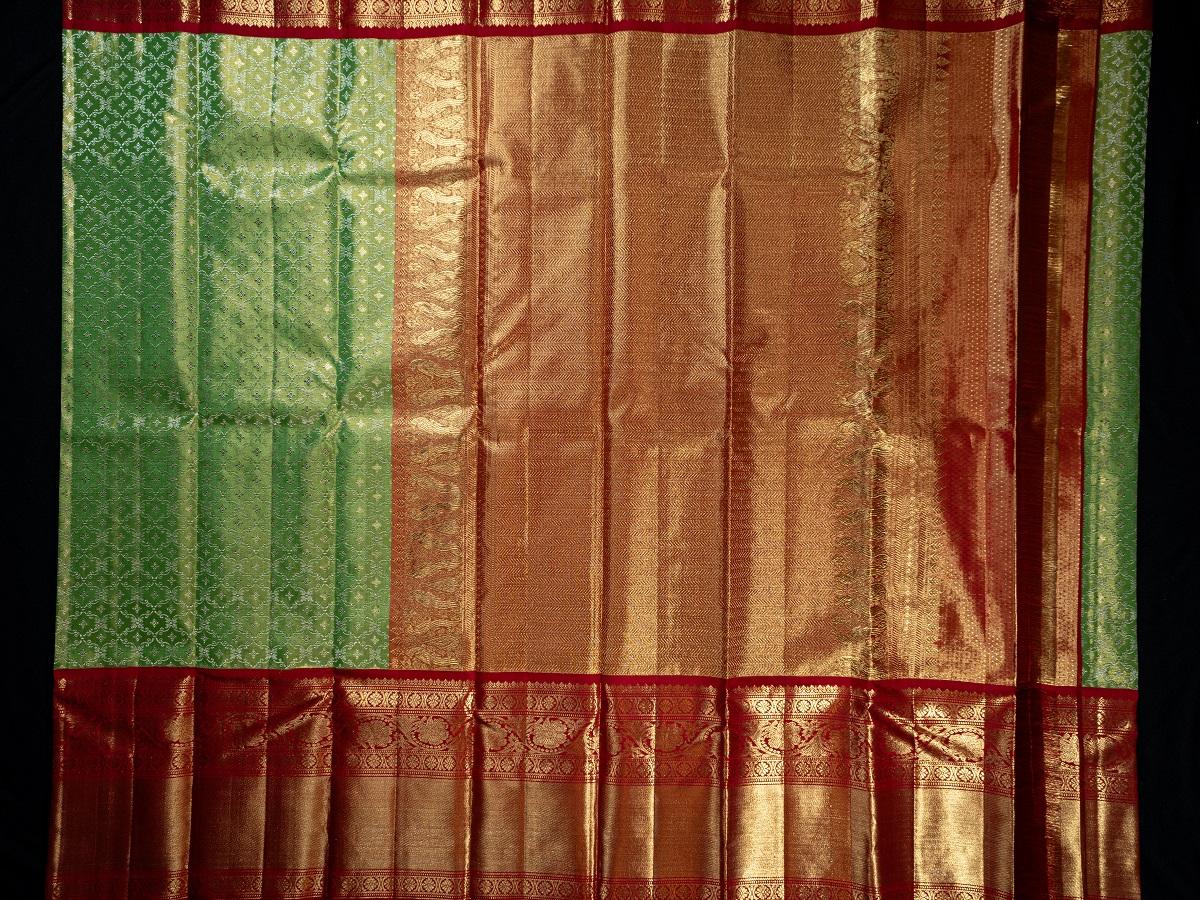 Elevate your style with the Kanchipuram Silk Brocade Green Saree. The gold zari brocade body exudes elegance, while the striking contrast gold zari brocade red big border showcases floral motifs in a series. The pallu is a work of art with its beautiful contrast gold zari floral brocade design. To complete the look, the saree includes a contrast red butta blouse with zari borders, ensuring you make a stunning style statement.