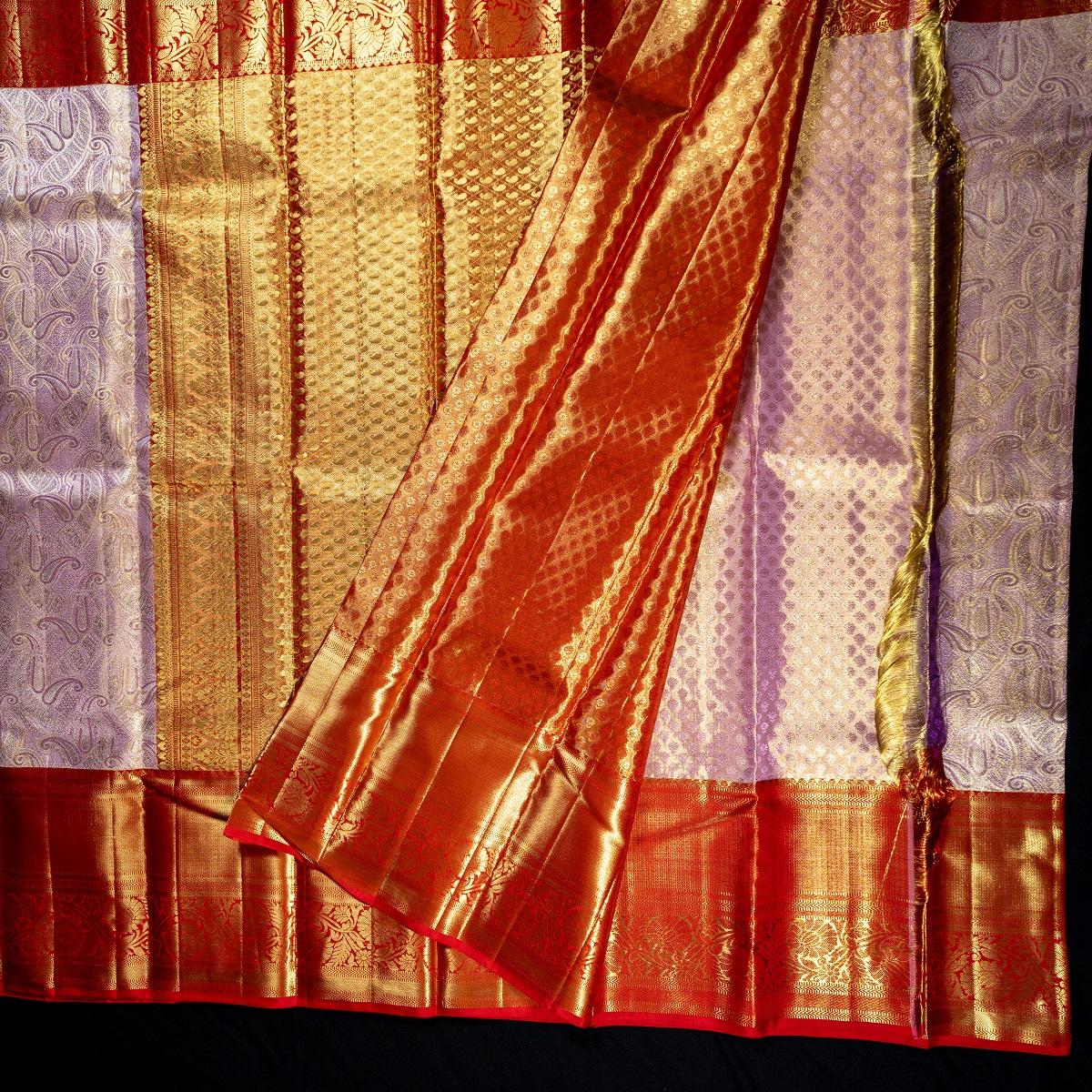 The Kanchipuram Silk Tissue Brocade Lilac Saree is a testament to opulence, featuring a body in gold zari tissue with silver and gold zari floral brocade. The border showcases a striking contrast with a big gold zari kaddi border adorned with floral motifs. The pallu continues the regal theme with a contrasting gold zari brocade pallu. The ensemble is completed with a red blouse featuring gold zari brocade detailing and zari borders for a refined look.