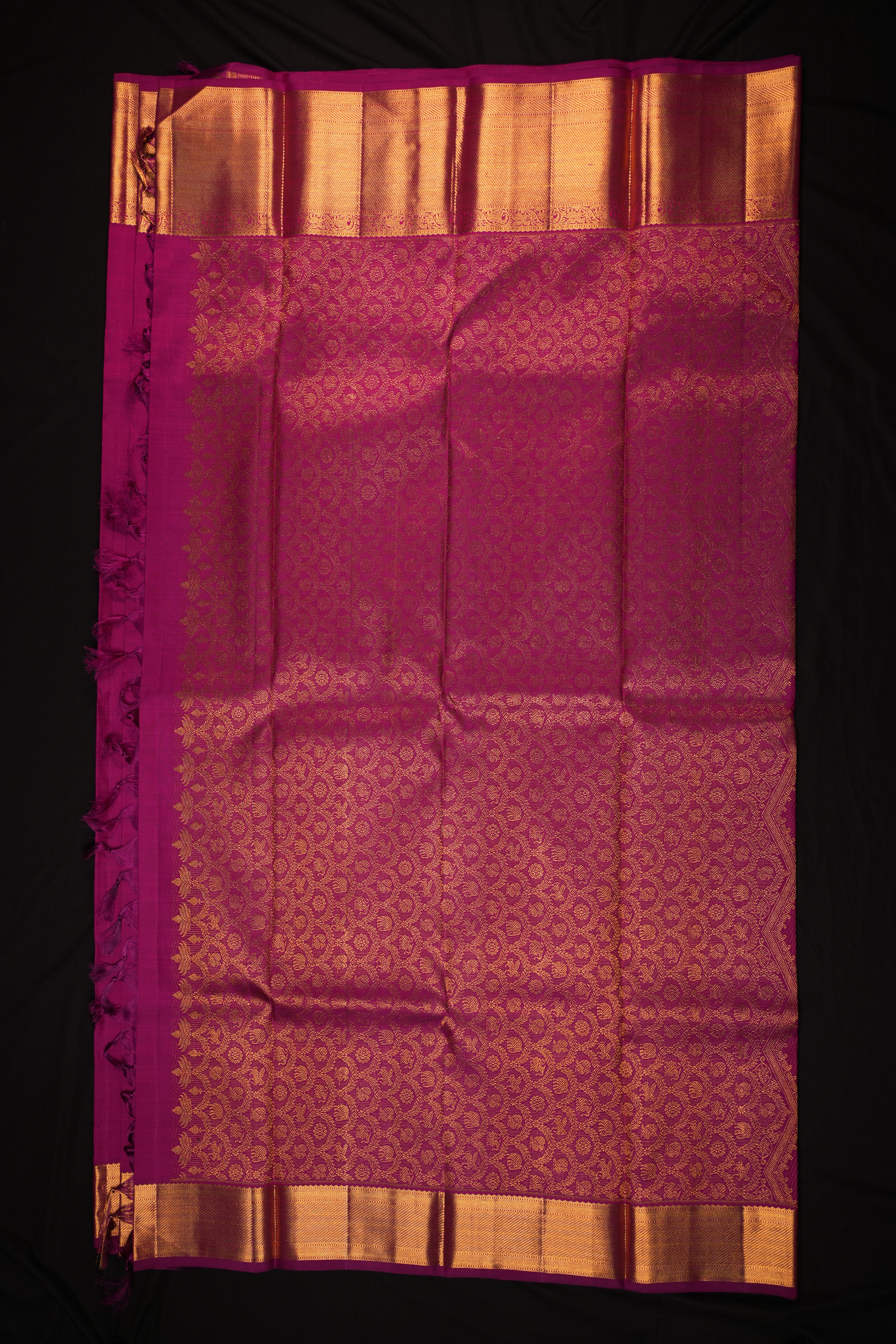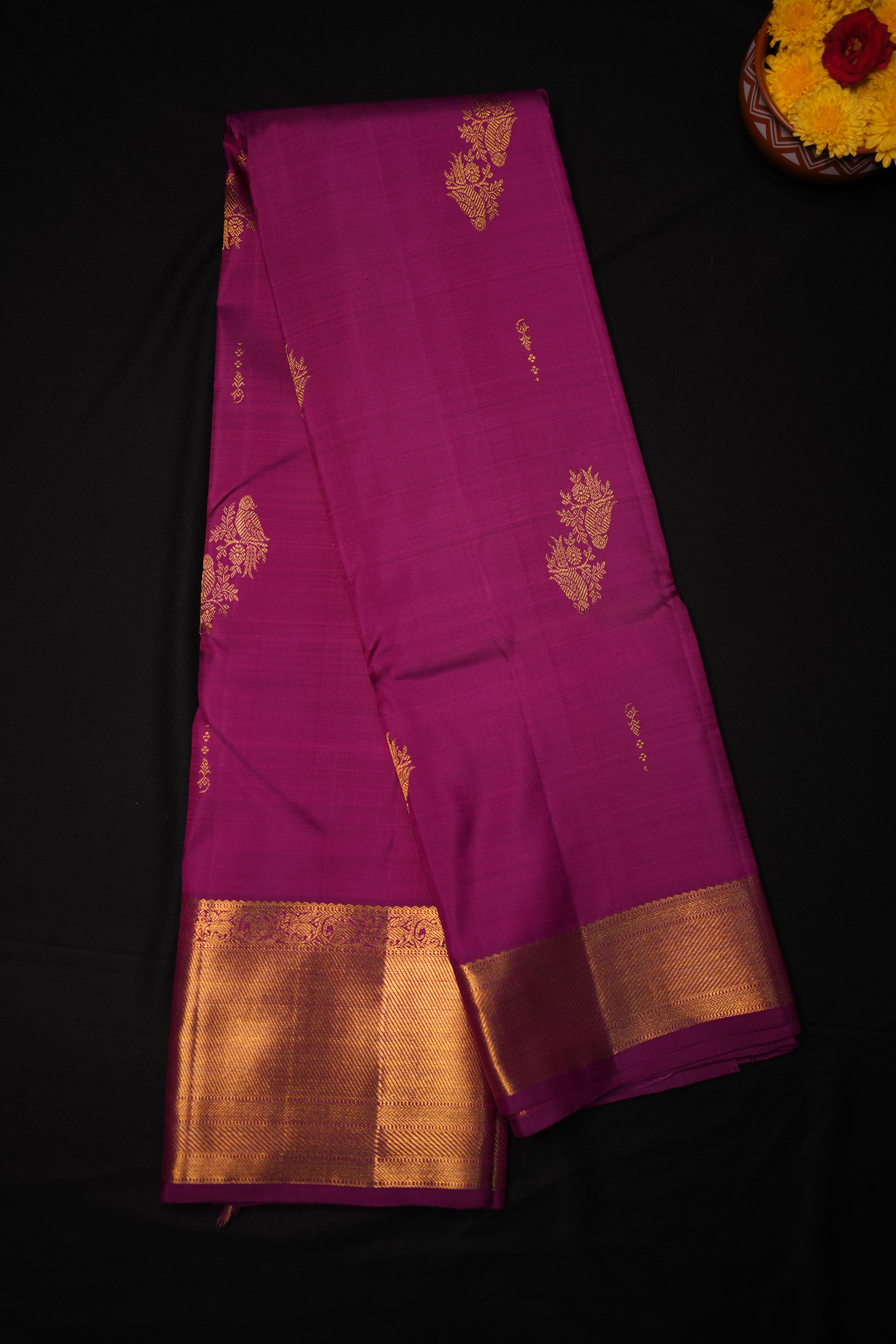Body: Magenta Pink and intricate gold zari bird and floral motifs, creating a vibrant and elegant look. Border: Self gold zari kaddi big border with elephant motifs intertwined in florals, adding a majestic and traditional charm. Pallu: Self gold zari kaddi pallu, enhancing the regal appeal of the saree. Blouse: Self plain blouse with zari borders, completing the look with a touch of sophistication.