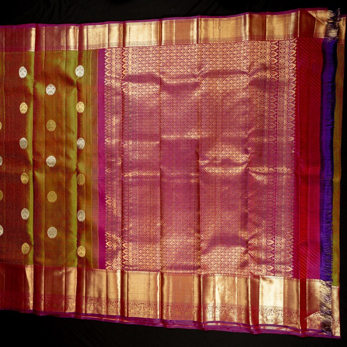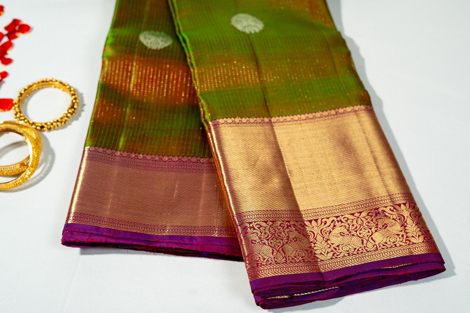 A Kanchipuram mehendi green checks saree with a contrast purple and gold zari border is a stunning and eye-catching creation.The saffron checks pattern and butta on the main body of the saree adds a touch of warmth and vibrancy, evoking the richness of the spice. The contrast purple and gold zari border creates a bold and dramatic contrast, adding a pop of color and luxury to the saree. The Kanchipuram silk fabric provides a lustrous sheen and smooth texture, enhancing the saree's visual appeal. The gold zari threads woven into the border add an extra layer of opulence and sophistication. The combination of mehendi green, purple, and gold creates a captivating and regal look, perfect for formal events, weddings, or special occasions.