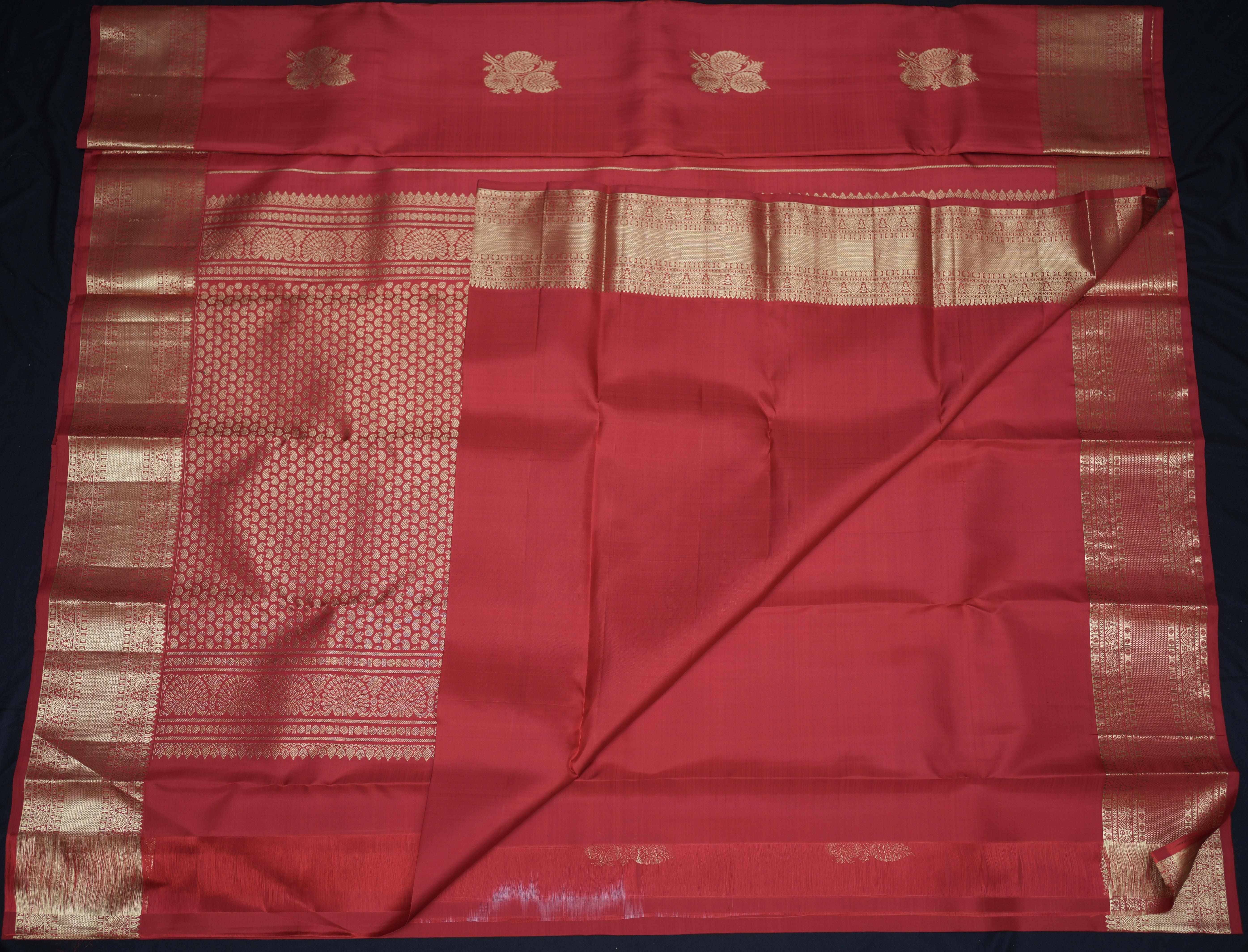Indulge in luxury with our Floral Zari Motifs Red Kanchipuram Silk Saree. Featuring intricate floral zari motifs and a self zari border, this saree exudes sophistication and exclusivity. Elevate your wardrobe with our premium silk saree and make a statement of elegance.