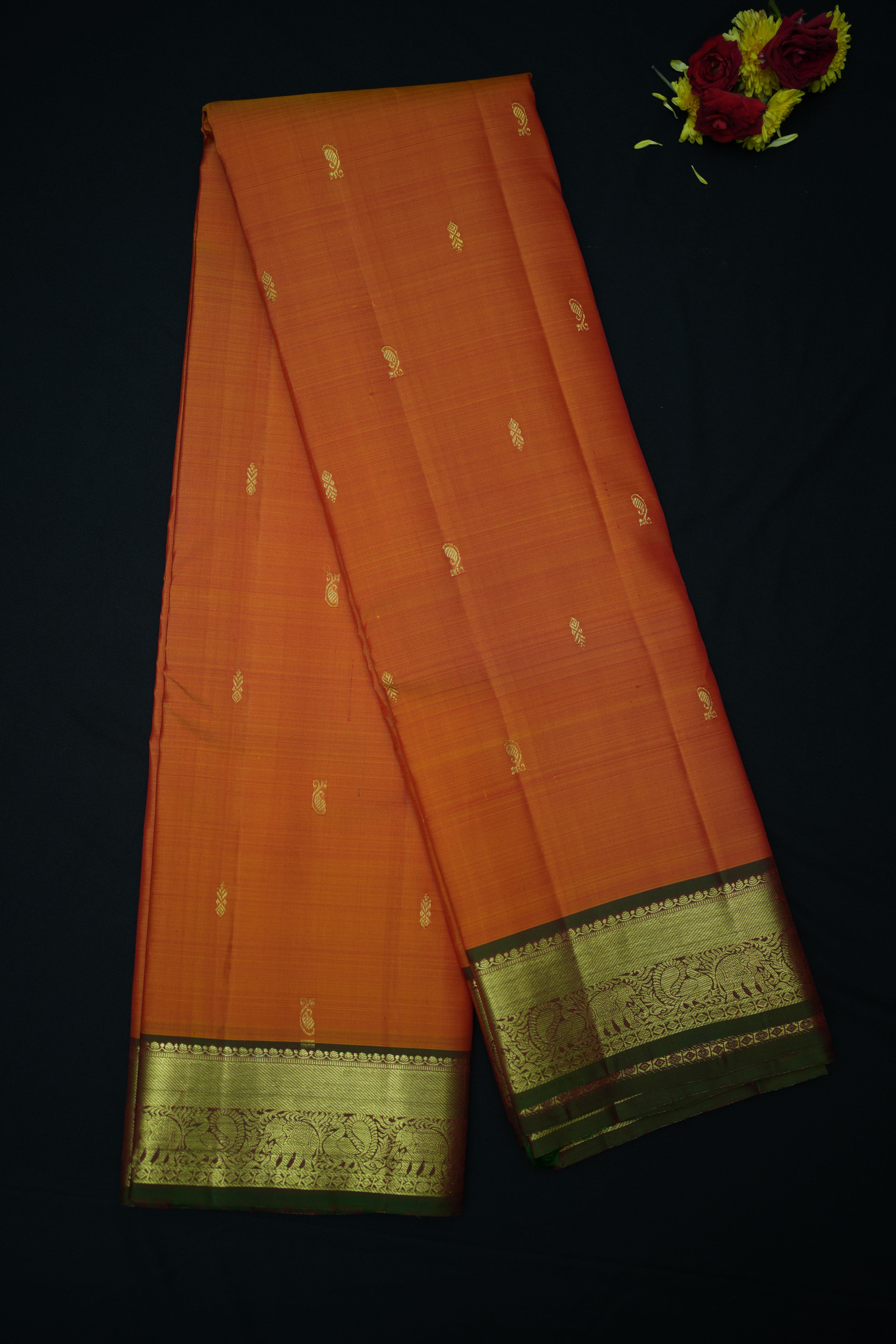 Elevate your style with our luxurious buttas mustard yellow kanchipuram silk saree. The intricate butta design showcase the finest craftsmanship of kanchipuram silk. Transform any occasion into a high-class affair with this elegant and exclusive saree.