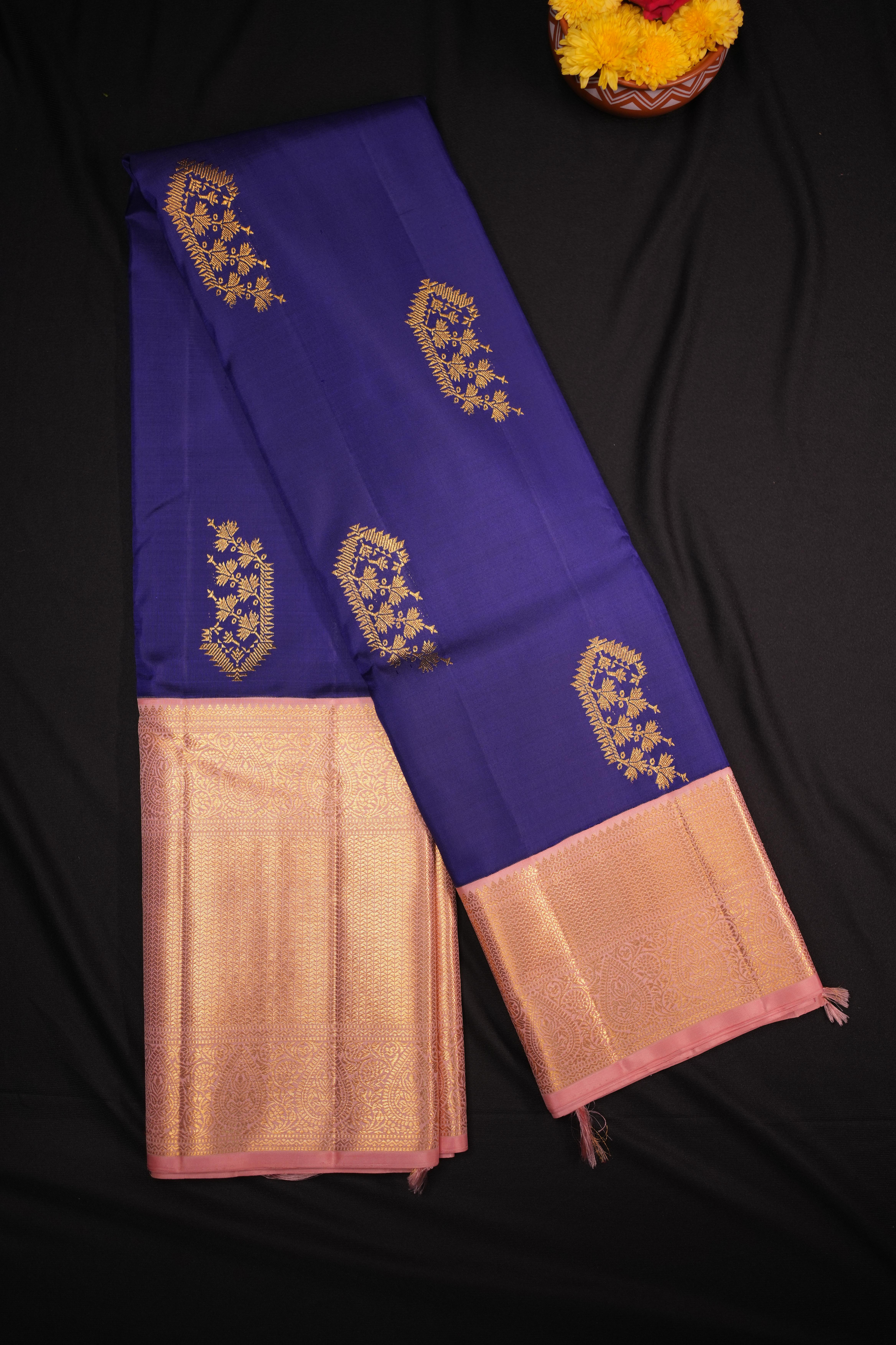 Step into sophistication with the Kanchipuram Silk floral motif navy blue Saree. The contrast gold zari diagonal lines pastel pink medium border with leaf motifs adds a touch of whimsy. The pallu continues the theme with contrasting gold zari brocade pallu with leaf motifs. The contrast navy blue blouse with zari borders completes the ensemble, ensuring a cohesive and elegant appearance.