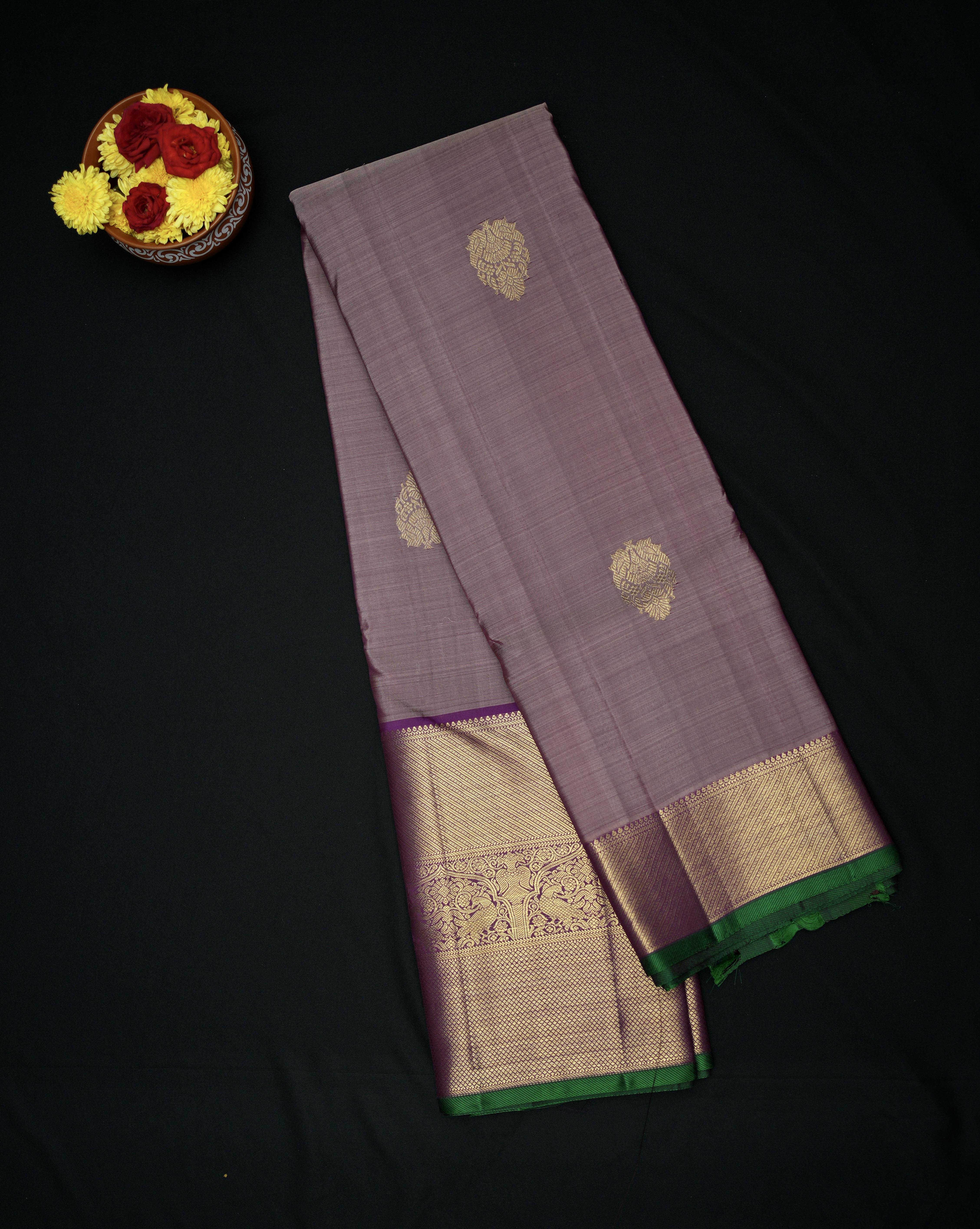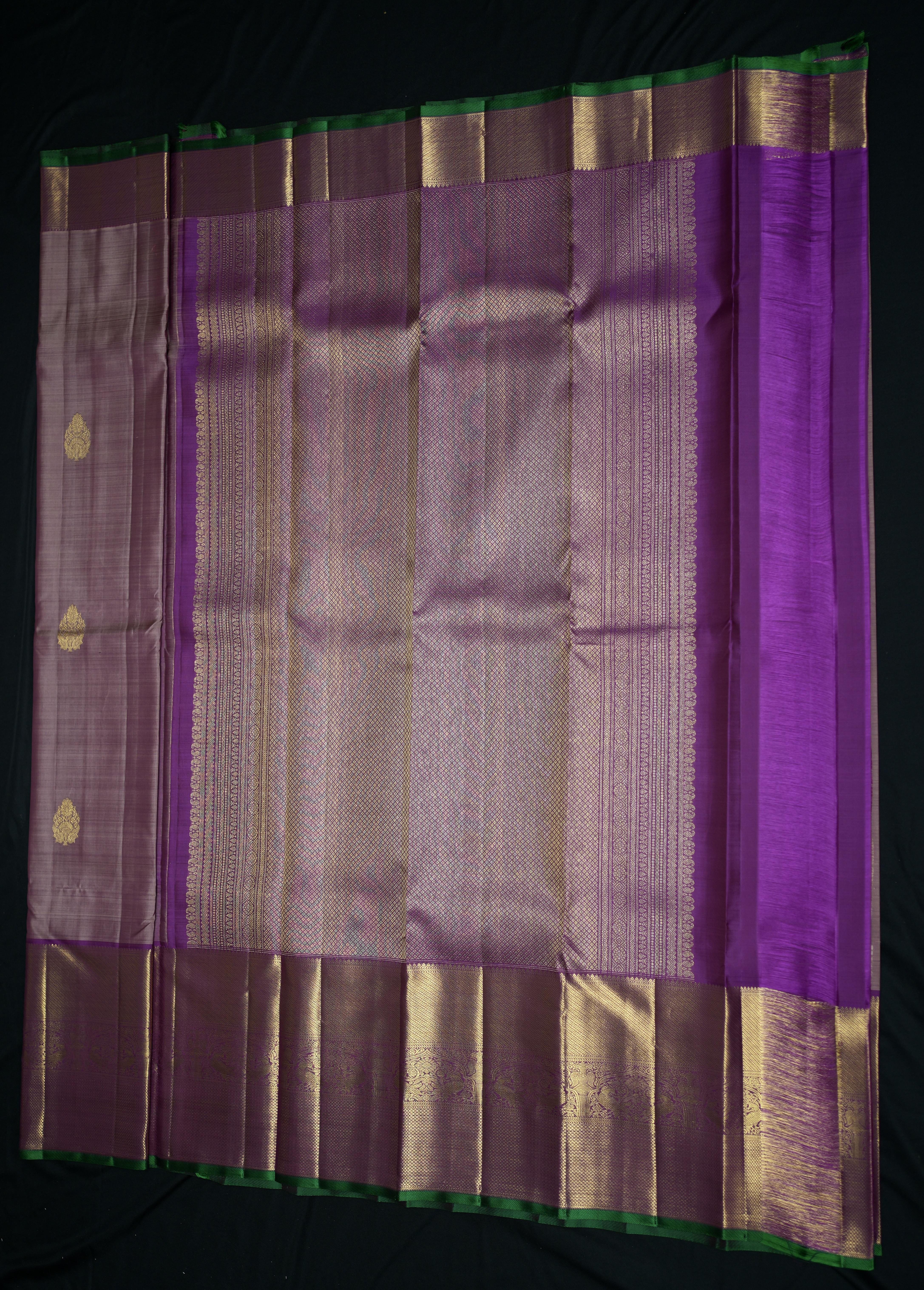 Body: The body of this saree is elegantly showcasing the rich onion pink silk with leaf motif in its purest form, highlighting the beauty of simplicity. Border: The contrast purple big zari border adds a modern and sophisticated touch to the saree, providing a striking contrast. Pallu: The contrast kaddi pallu enhances the saree's elegance with its understated yet luxurious design. Blouse: Completing the look is a contrast plain purple blouse with zari borders, offering a refined and harmonious finish.