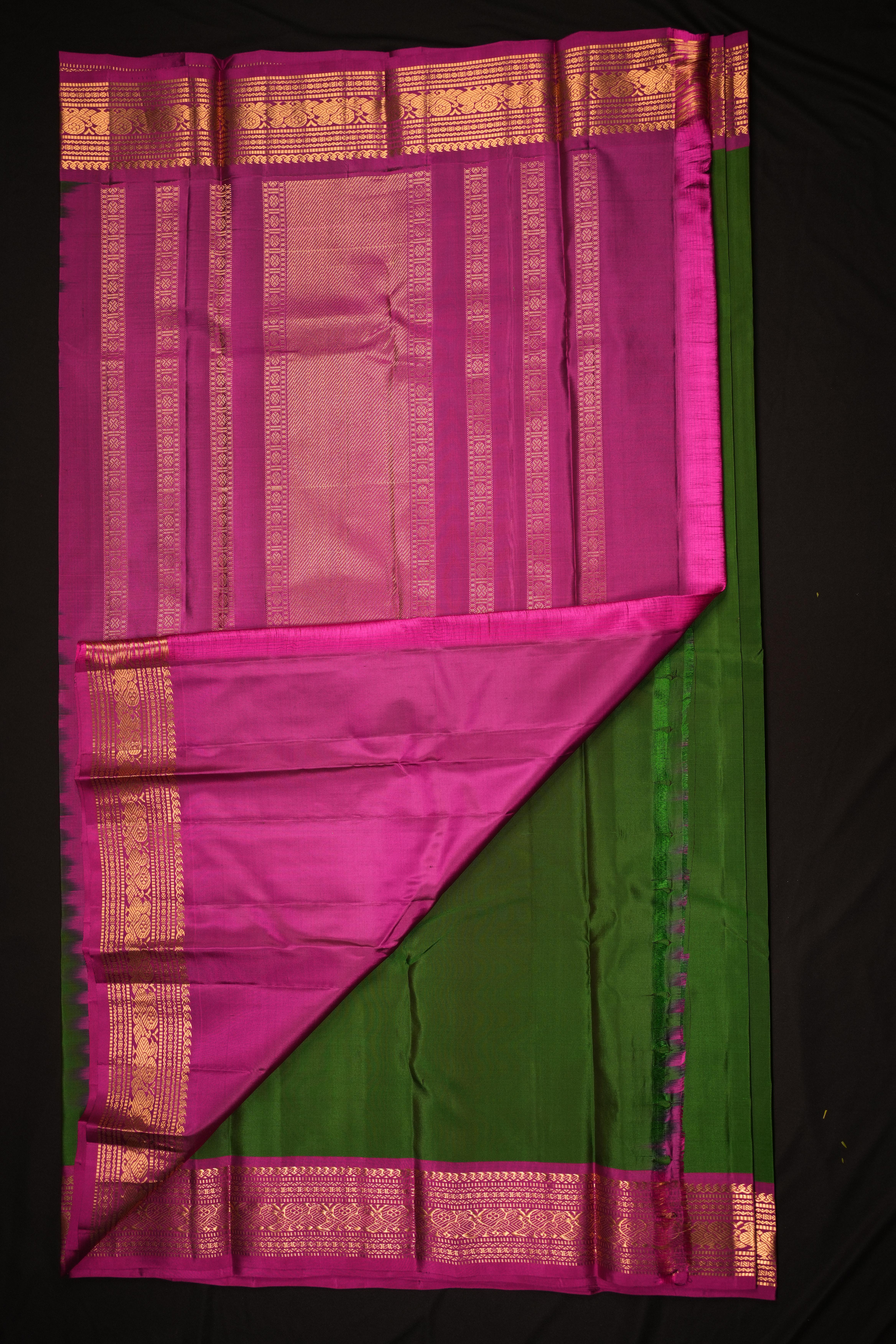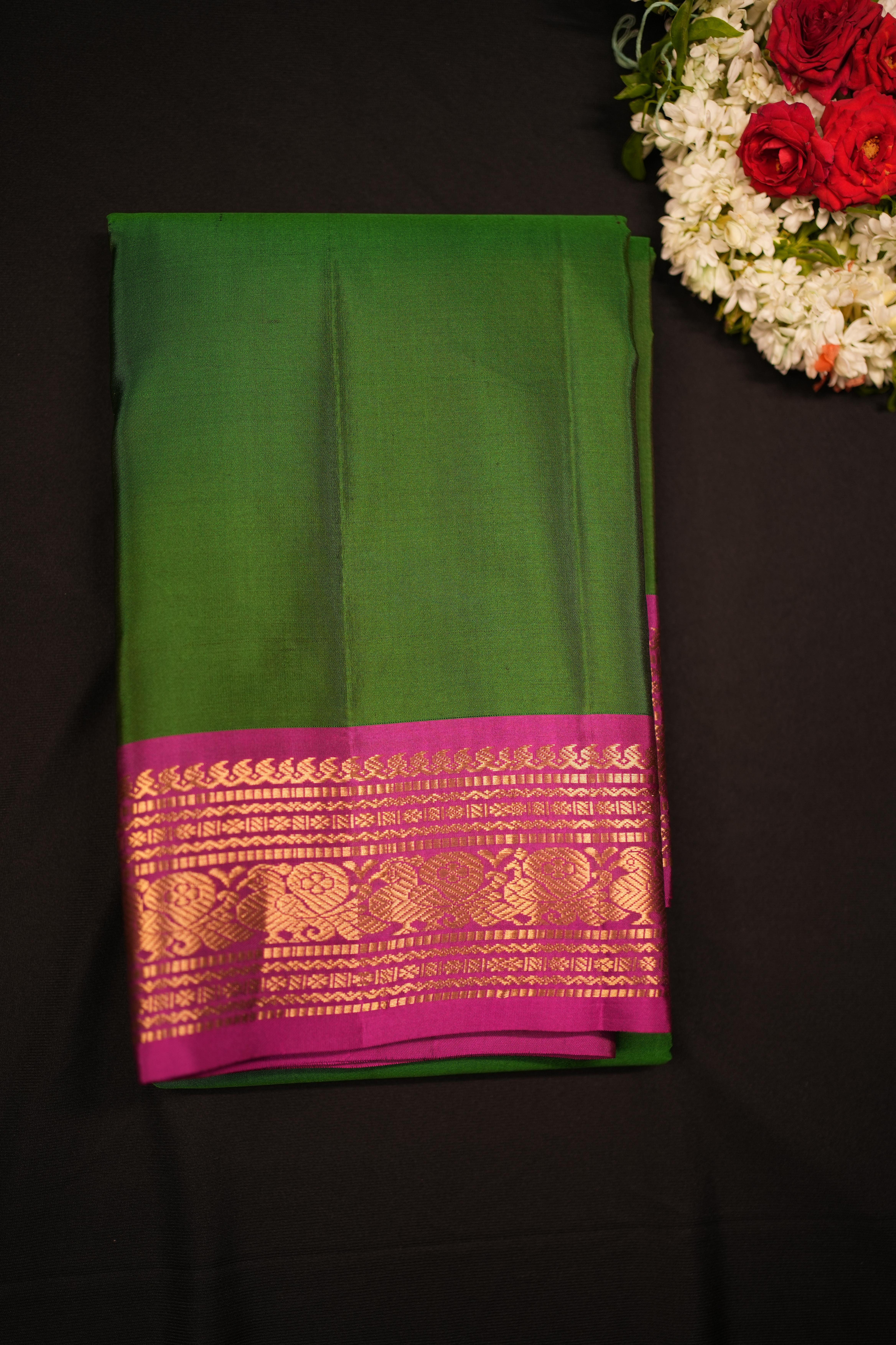 Body: The body of this saree features a Parrot Green base. Border: The small border is in contrast pink, adorned with gold zari zigzag lines and peacock motifs, adding a vibrant and intricate touch. Pallu: The pallu features contrast gold zari kaddi, enhancing the saree's overall ornate and cohesive appearance. Blouse: Includes a contrast pink plain blouse with zari borders, ensuring a coordinated and polished finish.