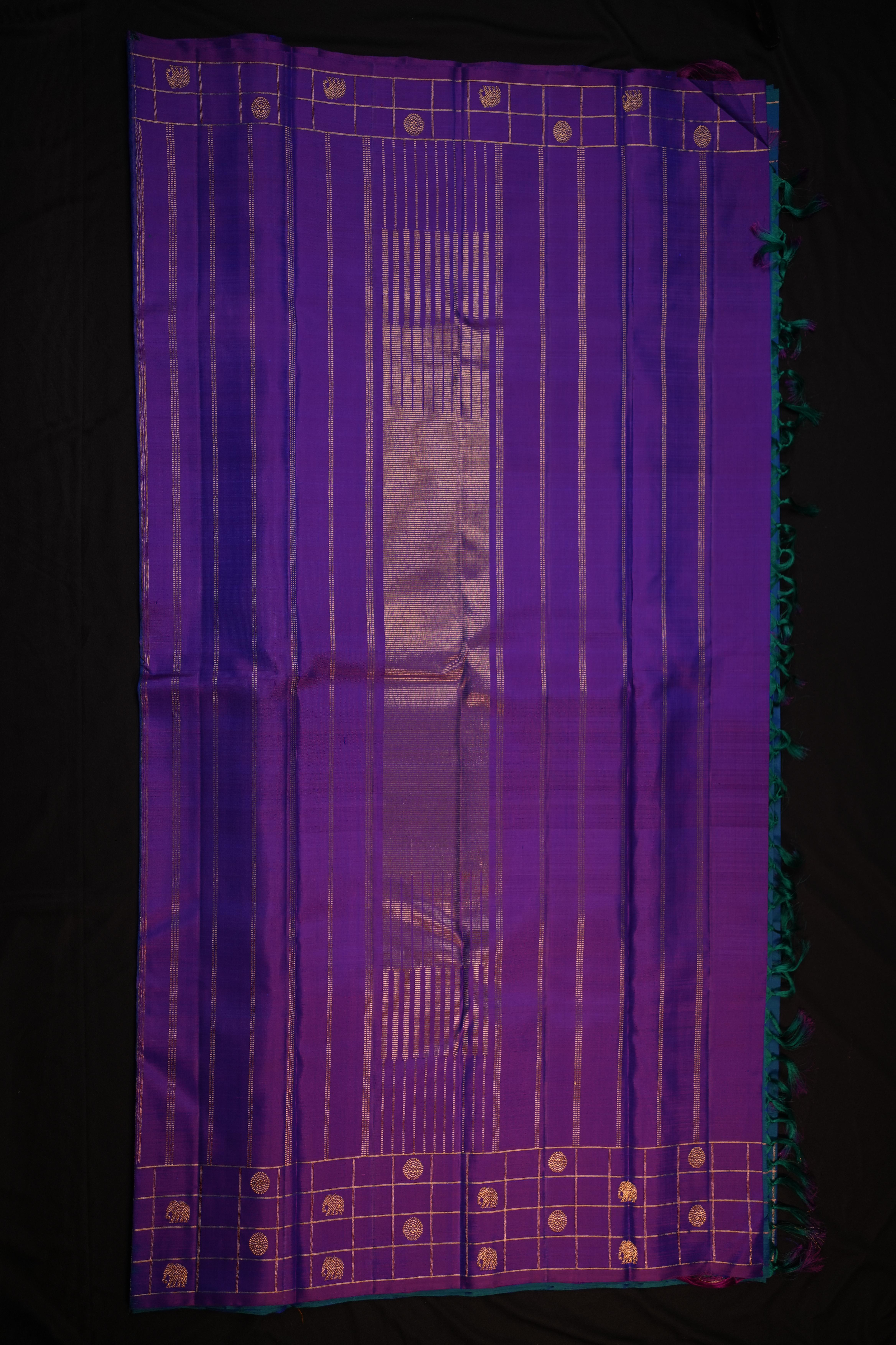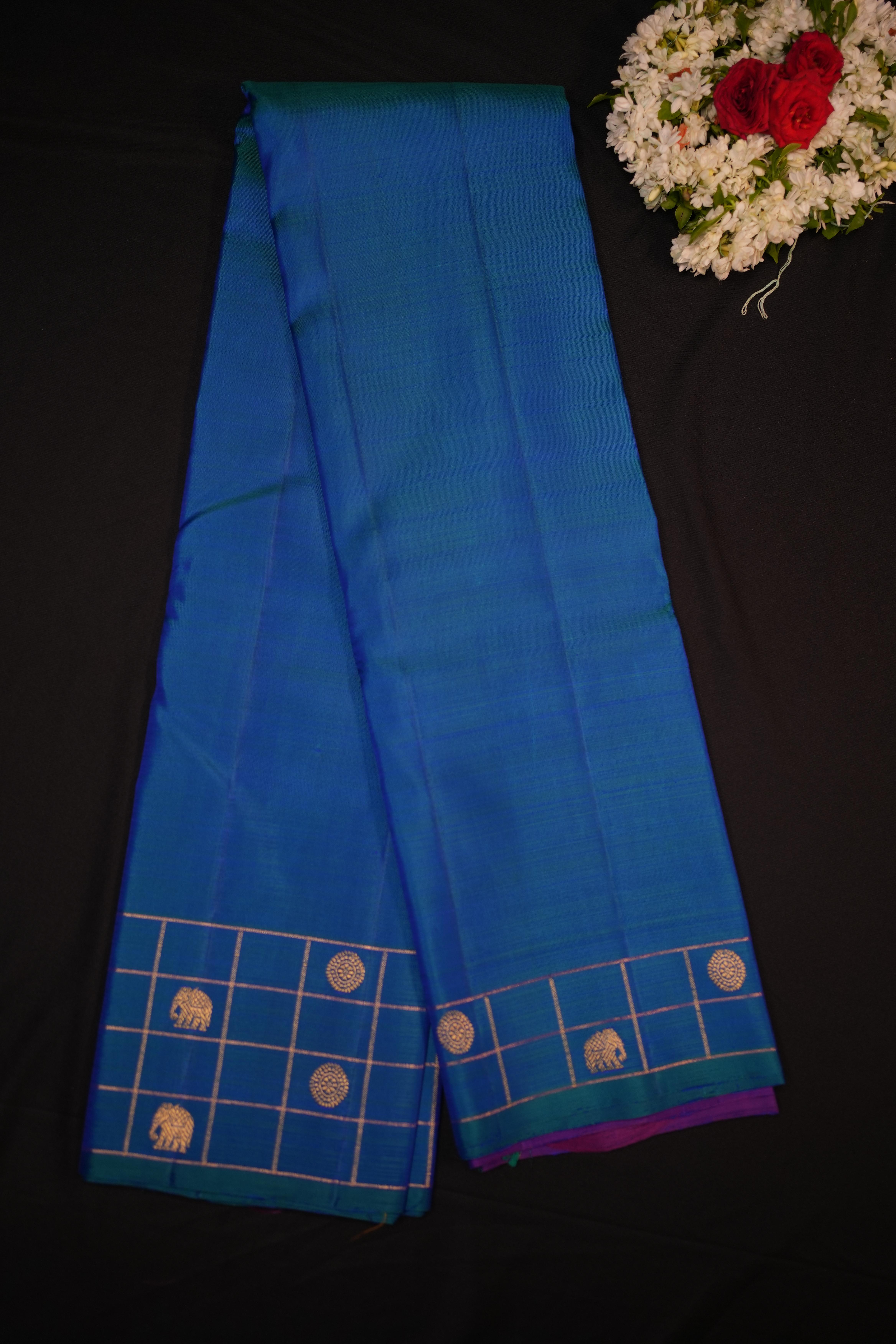 Graceful in the shade of Bright peacock blue kanjivaram silk saree with floral in checks pattern, etched with contrast purple border and pallu.