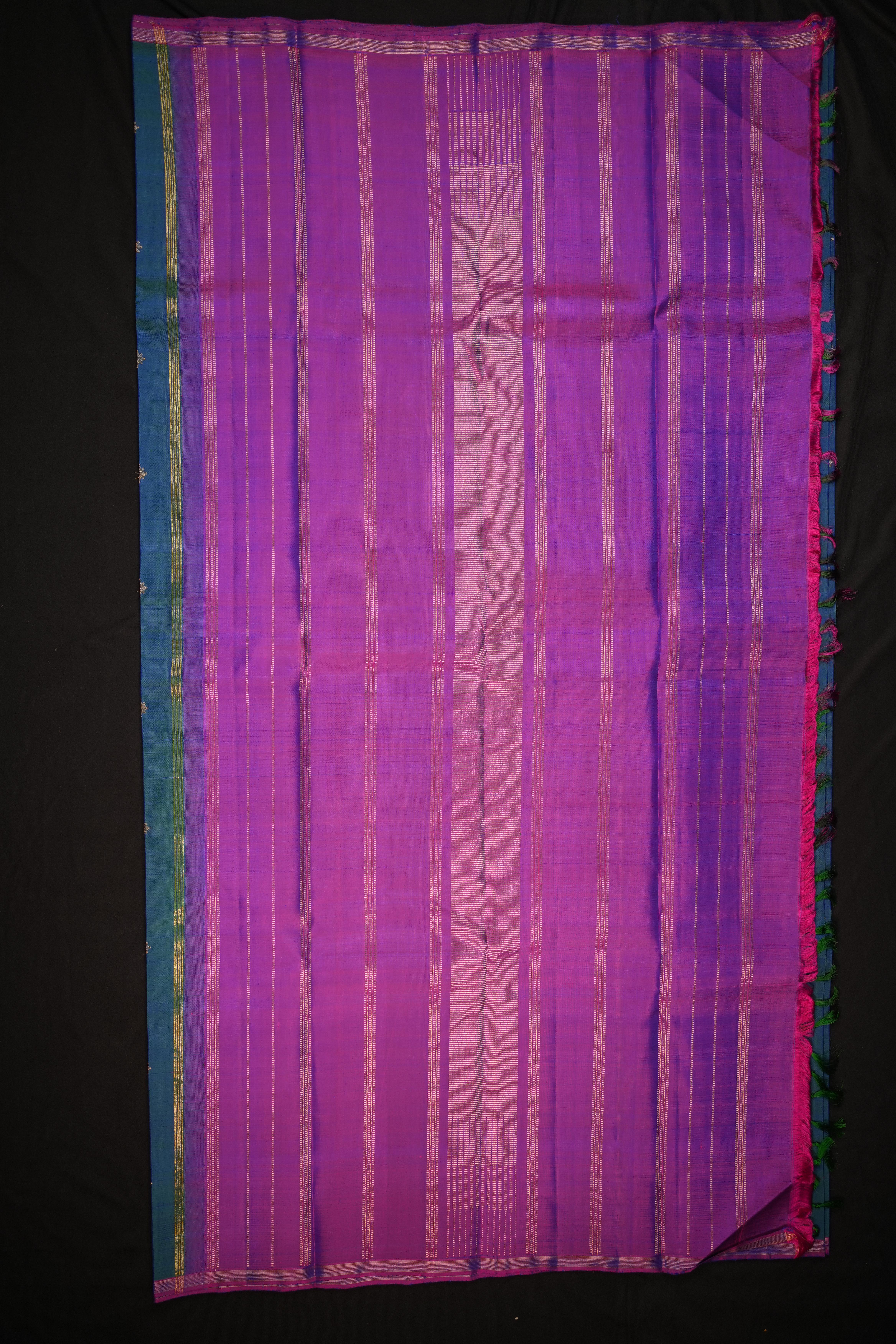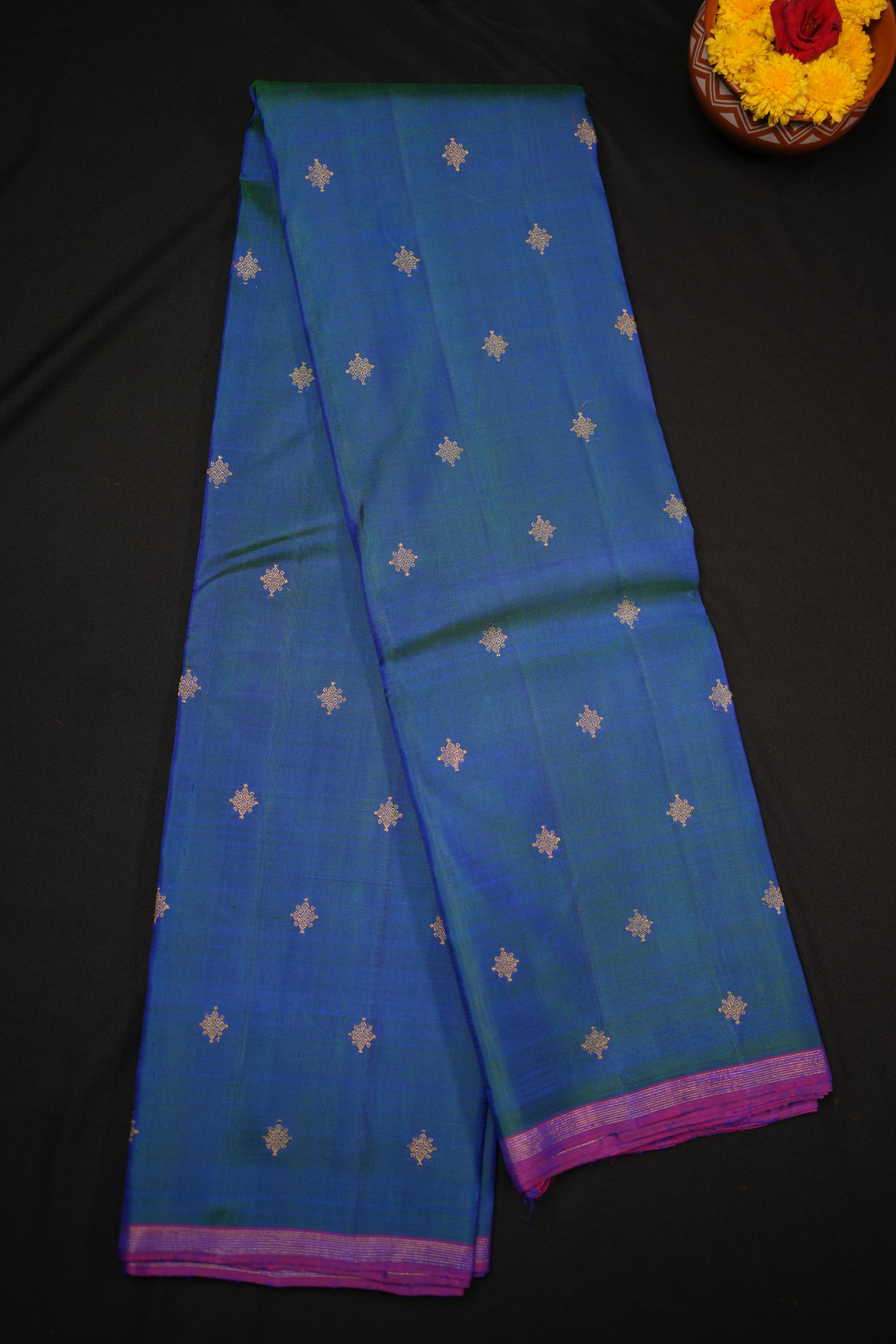 Elevate your style with this Kanchi Silk Butta Peacock Blue Saree. The rich Peacock blue color adds a touch of elegance, while the intricate butta design adds a unique charm. Made from high-quality silk, this saree is perfect for special occasions.