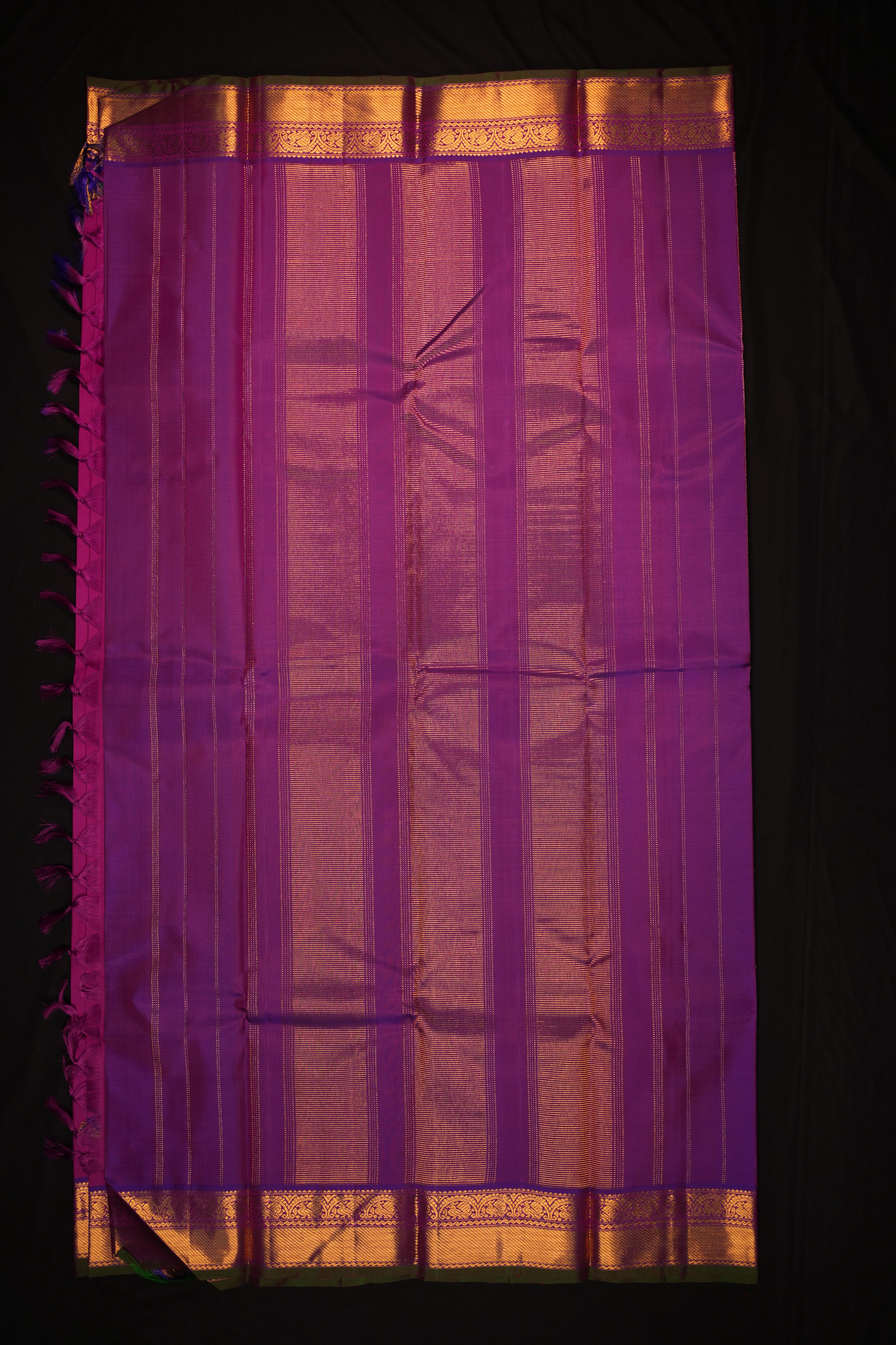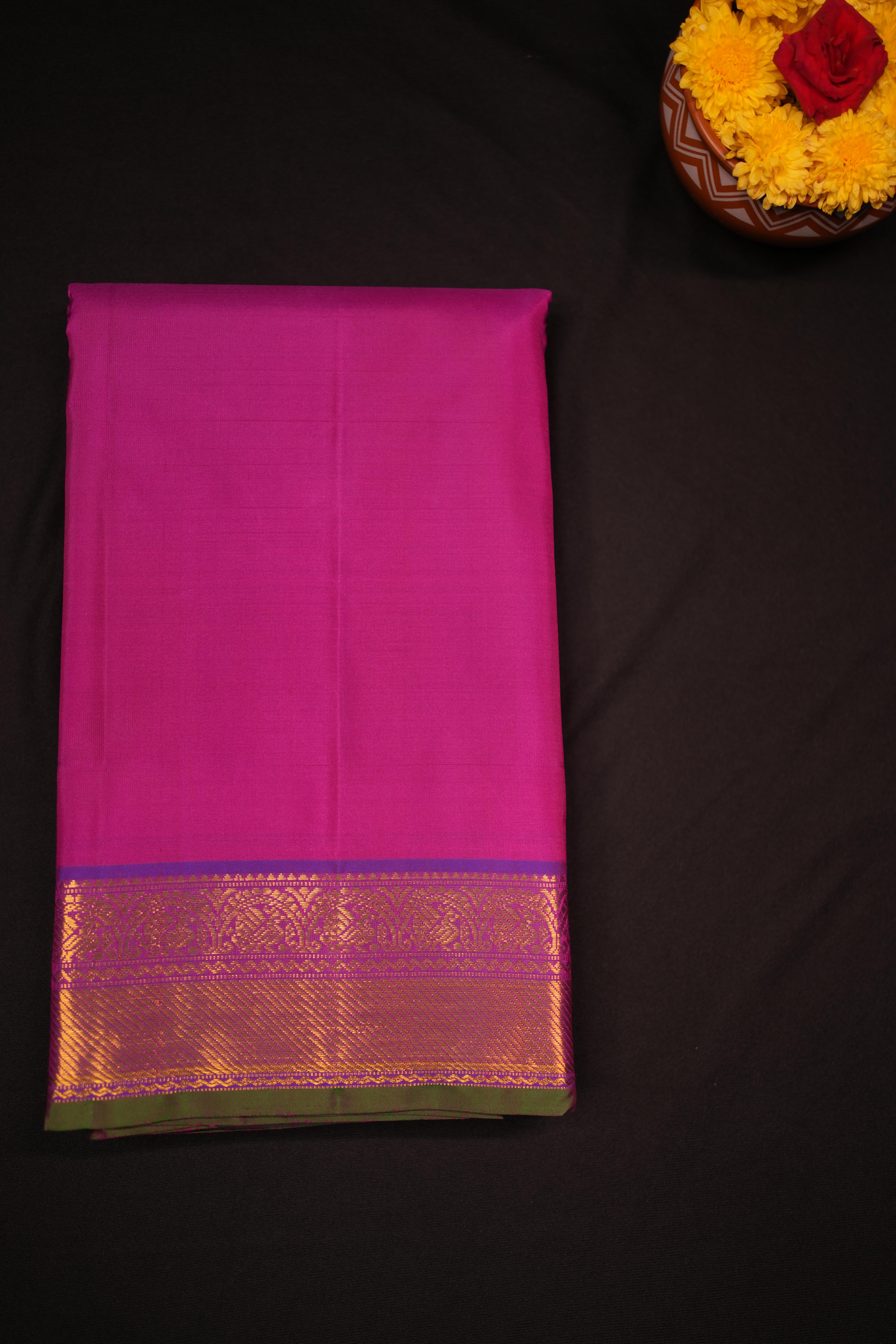 Body: The body of this saree features elegant pink base. Border: The small border is in contrast purple, adorned with gold zari zigzag lines and peacock motifs adding a vibrant and intricate touch. Pallu: The pallu features contrast gold zari kaddi, enhancing the saree's overall ornate and cohesive appearance. Blouse: Includes a contrast purple plain blouse with zari borders, ensuring a coordinated and polished finish.