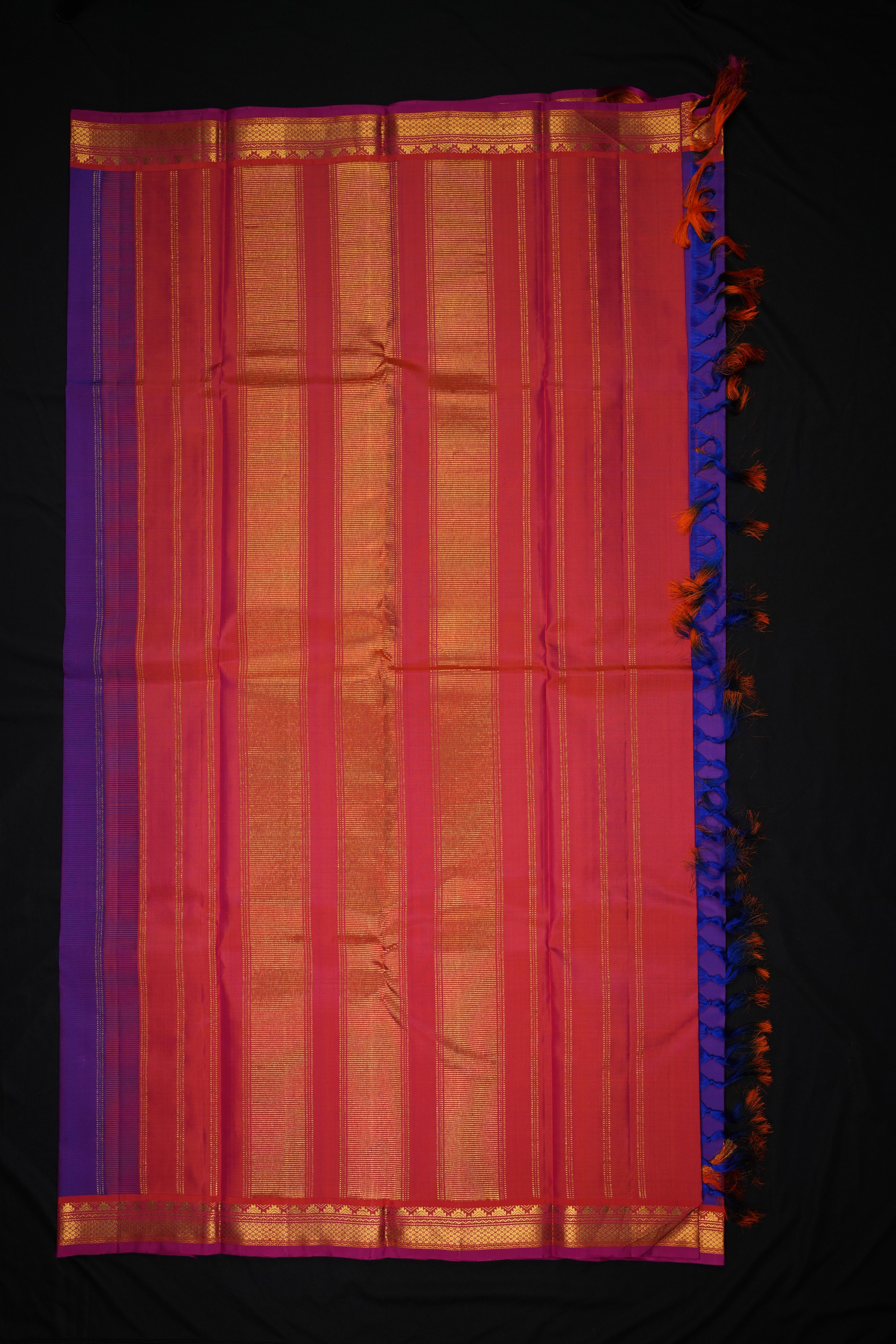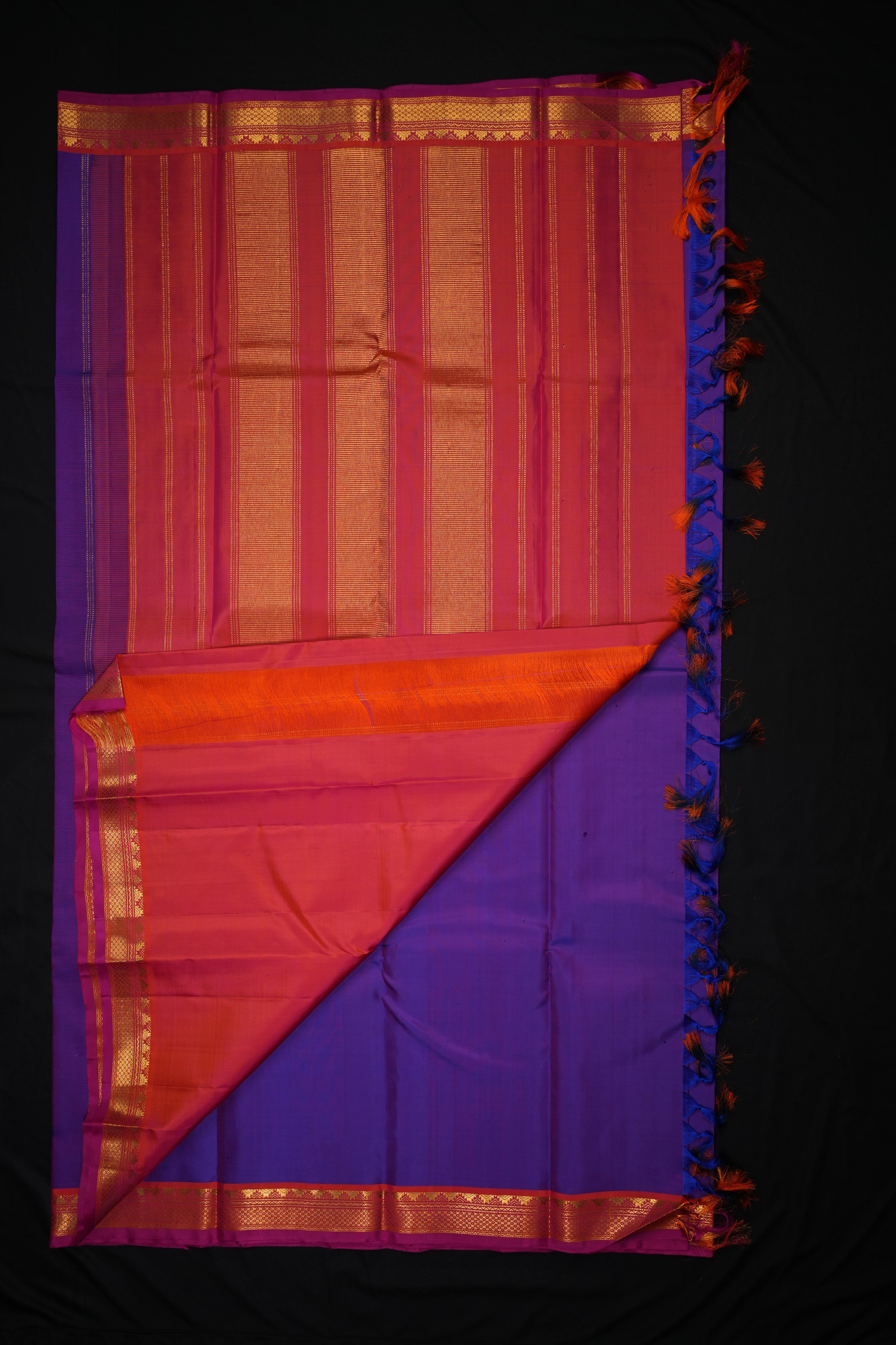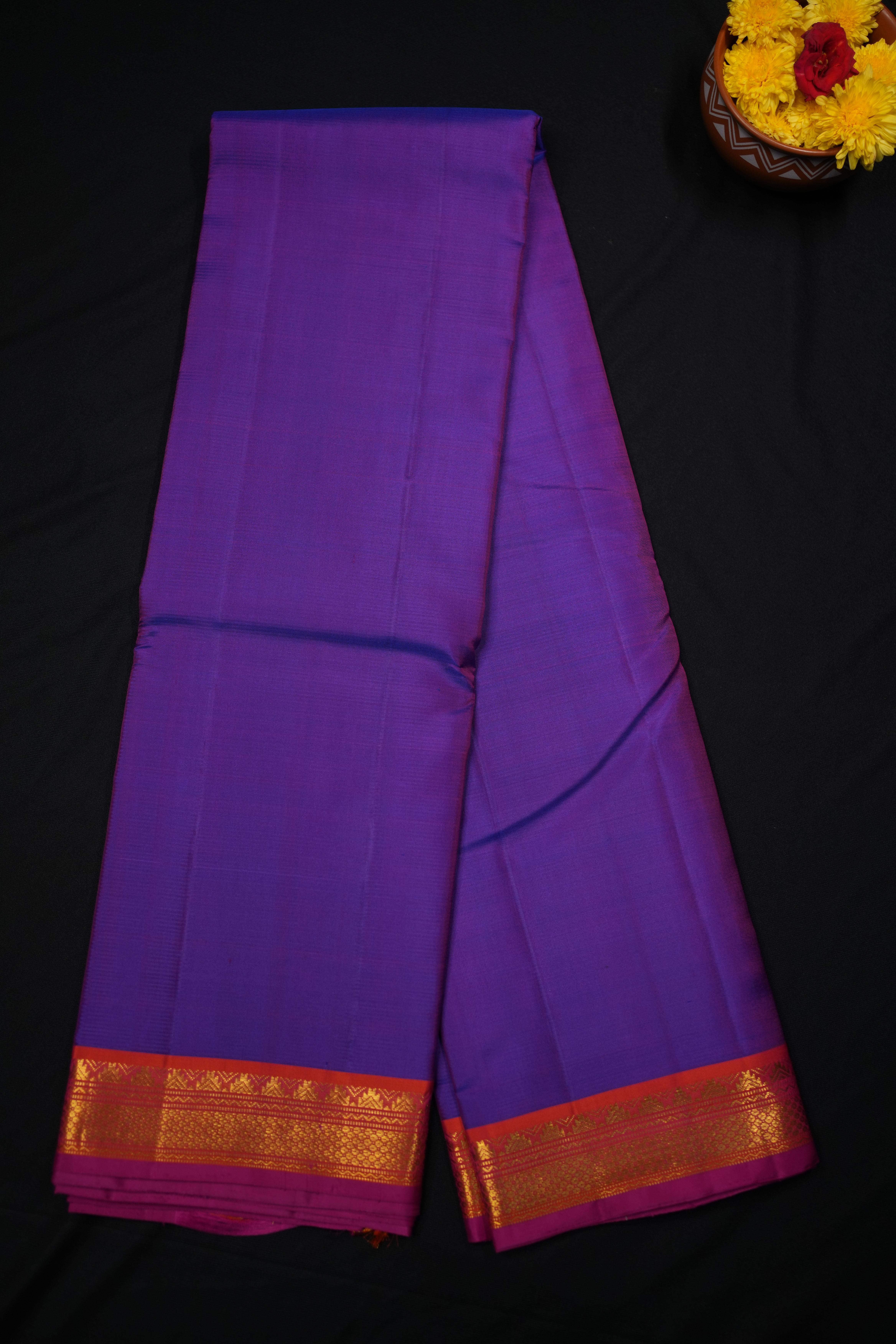 Body: The body of this saree features a purple base. Border: The small border is in contrast orange border, adorned with gold zari zigzag lines, adding a vibrant and intricate touch. Pallu: The pallu features contrast gold zari kaddi, enhancing the saree's overall ornate and cohesive appearance. Blouse: Includes a contrast orange plain blouse with zari borders, ensuring a coordinated and polished finish.