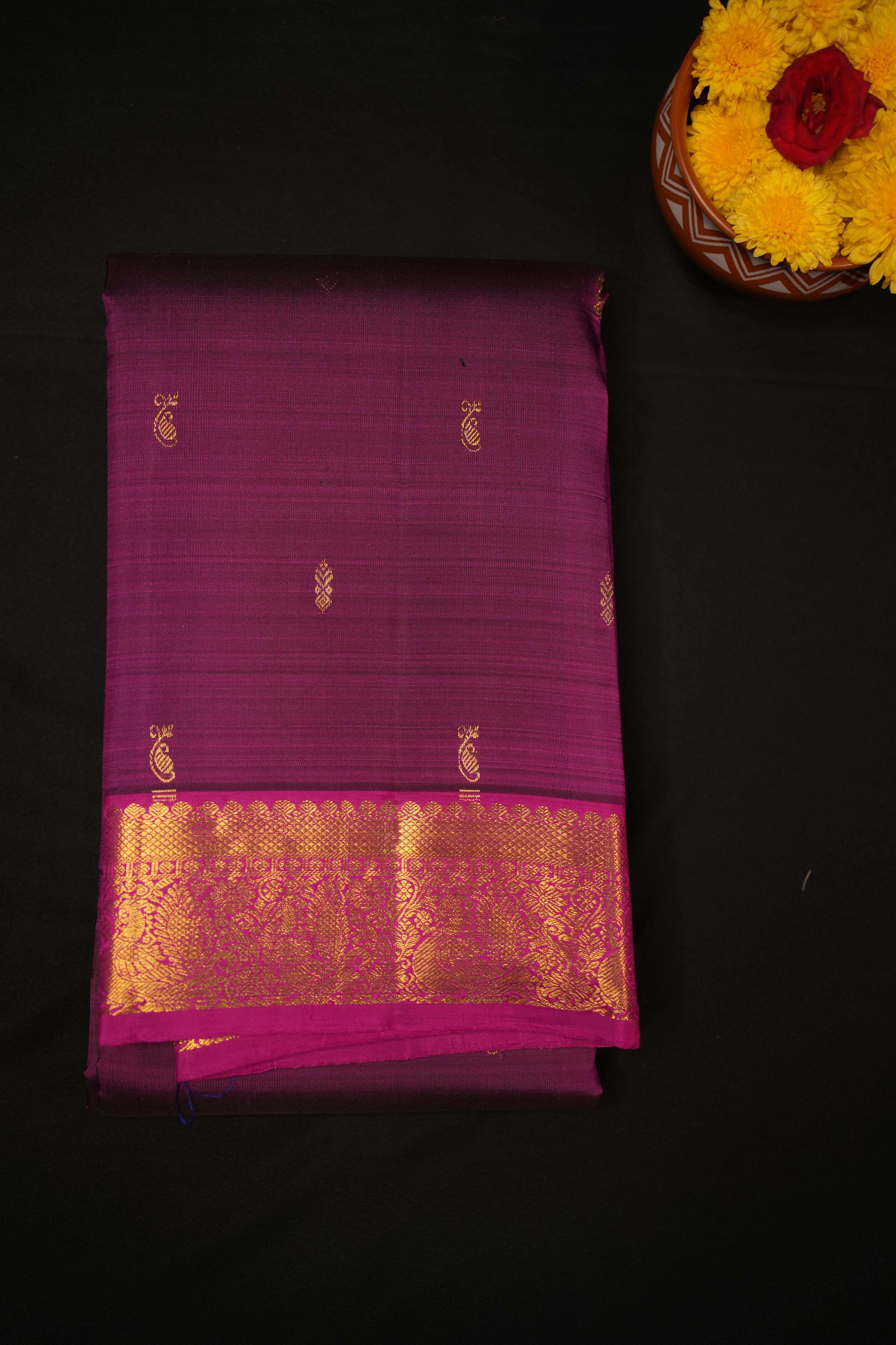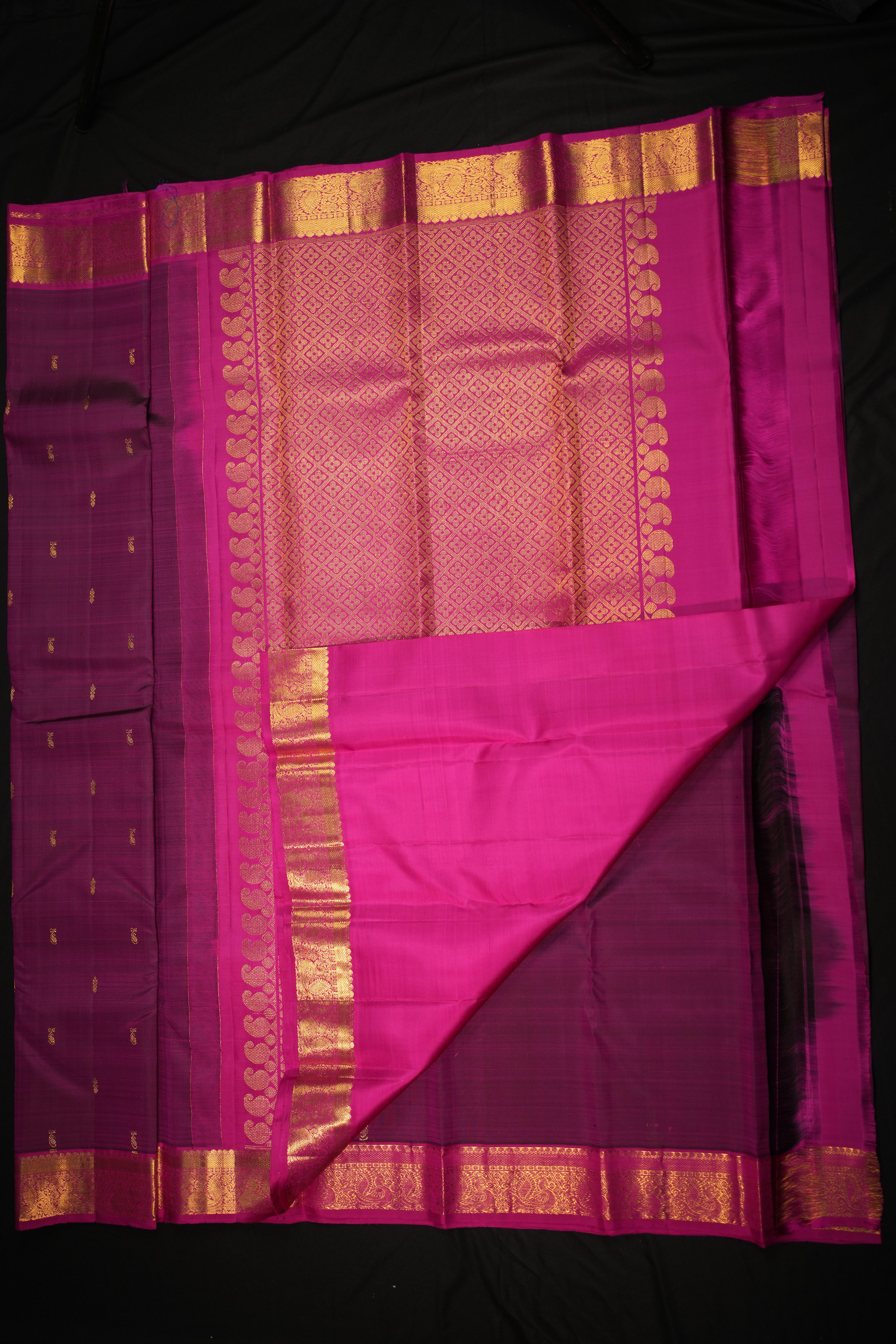 Body: Features gold zari paisley butta on a purple base, creating a vibrant and intricate design. Border: Contrast gold zari paisley and peacock vines on a pink small border, adding a striking and elegant touch. Pallu: The contrast gold zari brocade pallu with floral paisleys enhances the saree with a rich and cohesive design. Blouse: Includes a contrast pink plain blouse with zari borders, providing a stylish and polished finish.