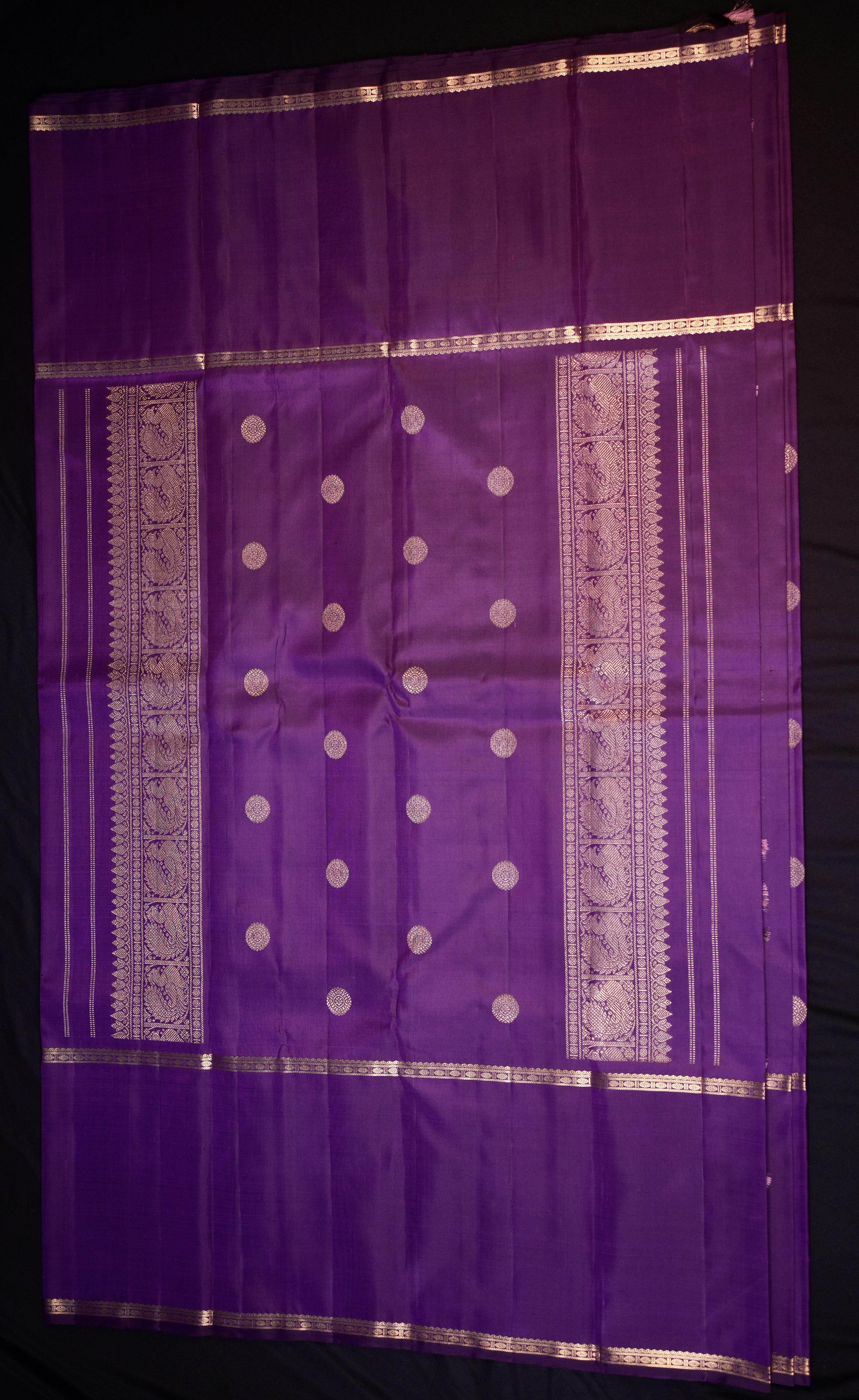 The Kanchipuram Silk Butta Purple Saree is a masterpiece, with gold zari butta on the body. The self gap border adds a touch of whimsy. The self butta pallu complements the overall design, while the self blouse with zari gap borders ensures a cohesive and refined appearance.