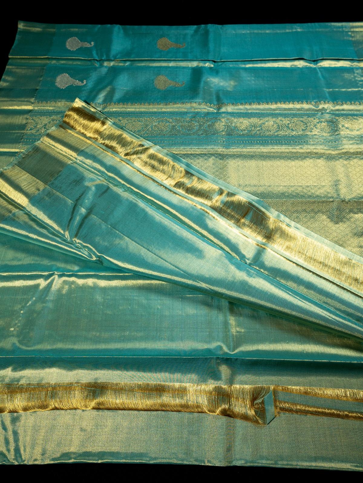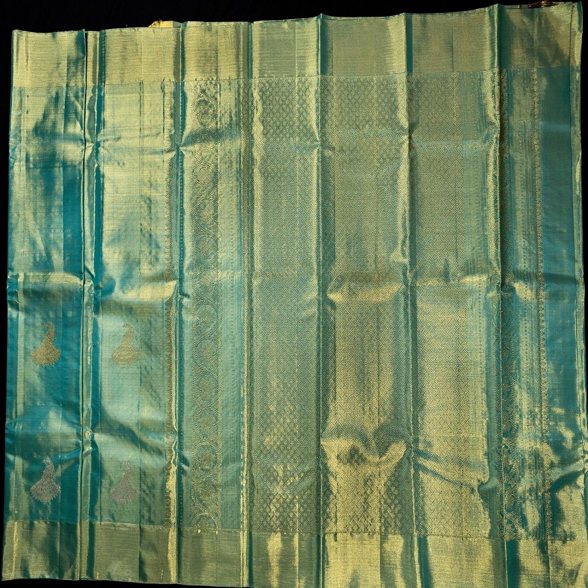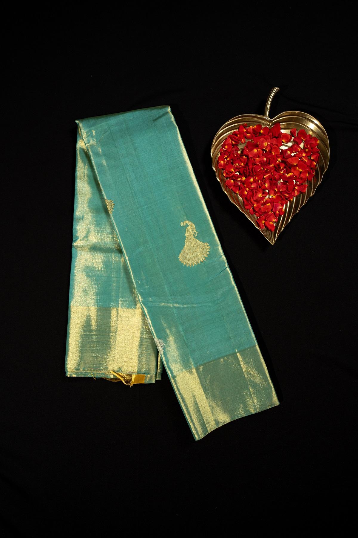 A Kanchipuram silk sea blue monotone tissue silk saree is a stunning and elegant creation.The saree features a beautiful sea blue monotone color, evoking the calmness and serenity of the ocean. The tissue silk fabric gives the saree a light, airy texture and a subtle sheen, adding to its visual appeal. The monotone color scheme creates a clean and minimalist look, making the saree perfect for formal events, modern weddings, or high-end parties. The Kanchipuram weaving technique ensures that the saree is of the highest quality, with intricate weaving and attention to detail. The sea blue color is both soothing and sophisticated, making the saree perfect for those who want to exude elegance and poise.