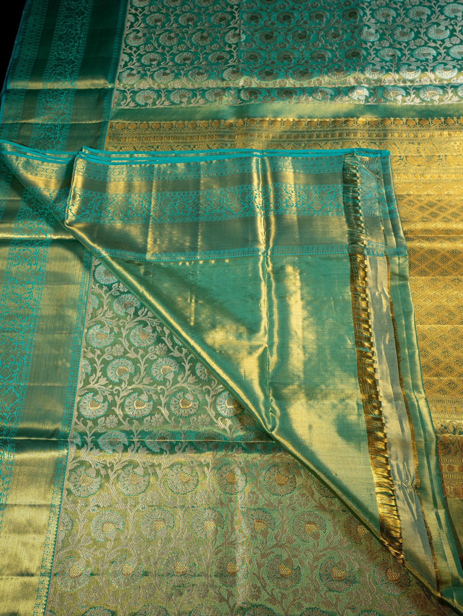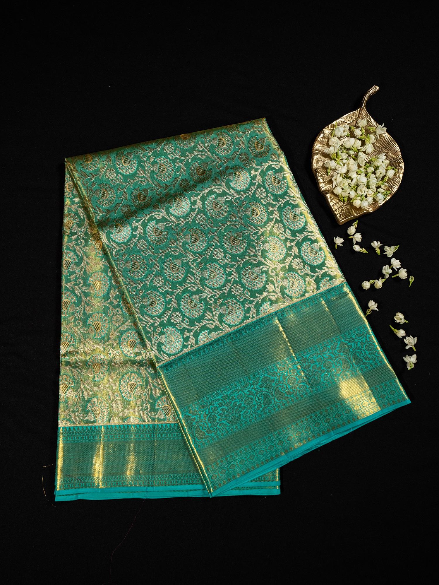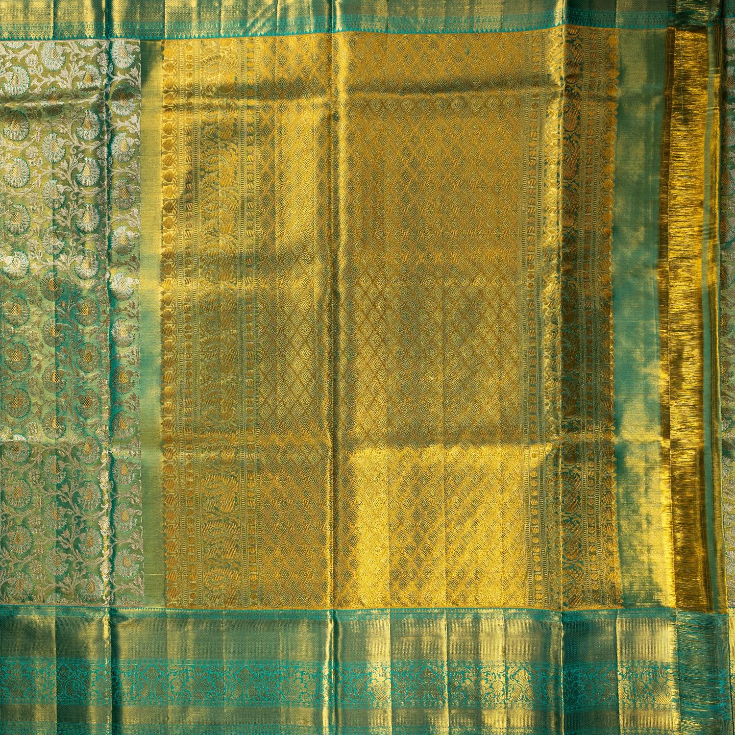 The body of this saree features a luxurious gold zari tissue base adorned with silver zari floral brocade on a rich green background, creating a delicate and elegant design with a shimmering effect. Border: Self gold zari kaddi medium border with floral motifs, adding a subtle yet refined touch that complements the intricate brocade work on the body. Pallu: The self gold zari diamond brocade pallu enhances the saree with a cohesive and ornate finish, maintaining the traditional elegance of Kanchipuram silk. Blouse: Includes a self tissue plain blouse with zari borders, offering a coordinated and polished finish to the ensemble.