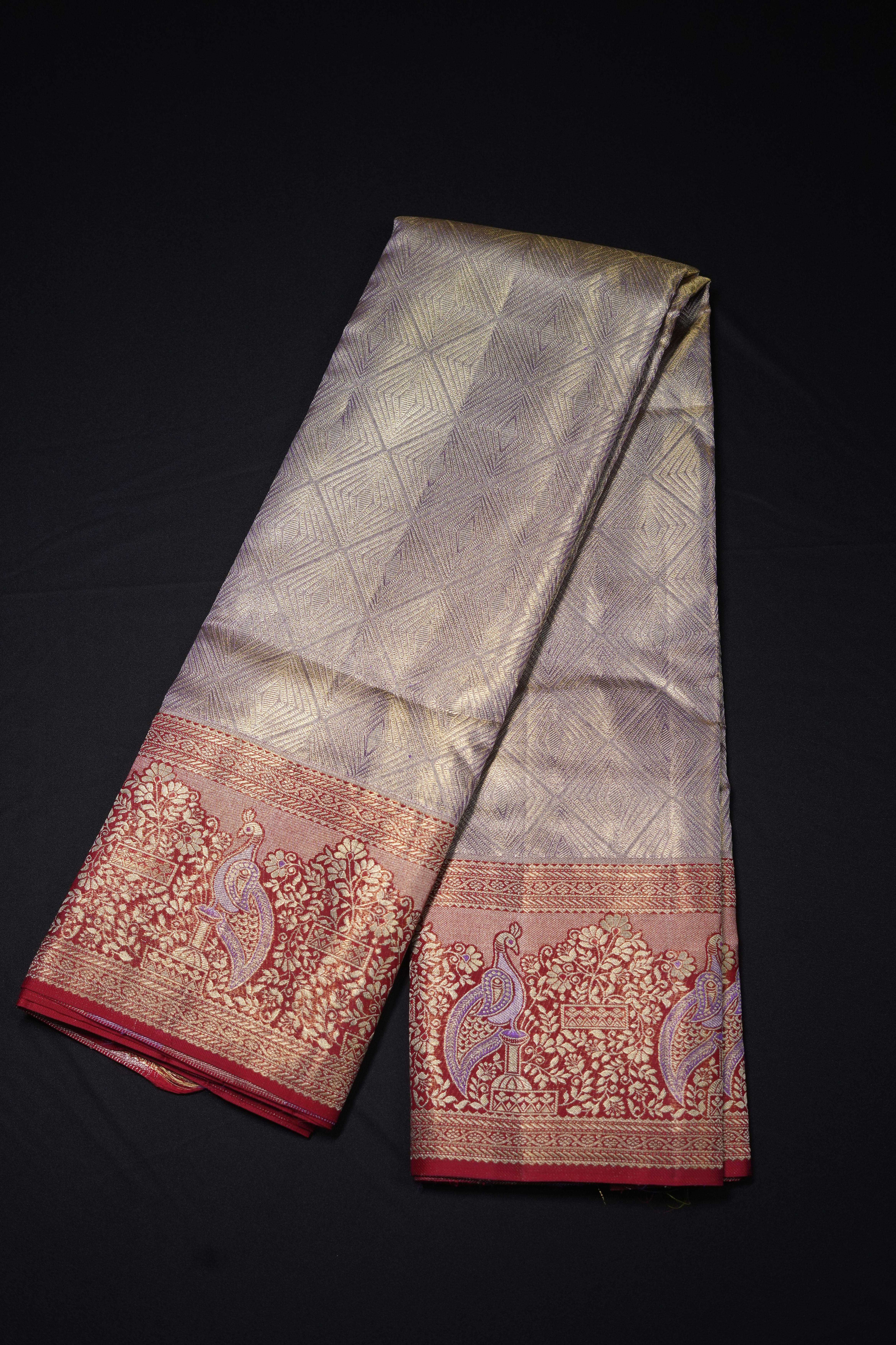 This exquisite saree features a gold silk tissue base adorned with intricate silver zari diamond brocade. The elegant diamond patterns, woven in fine silver zari, lend a subtle shimmer and grace to the saree, making it a perfect choice for a refined and sophisticated look