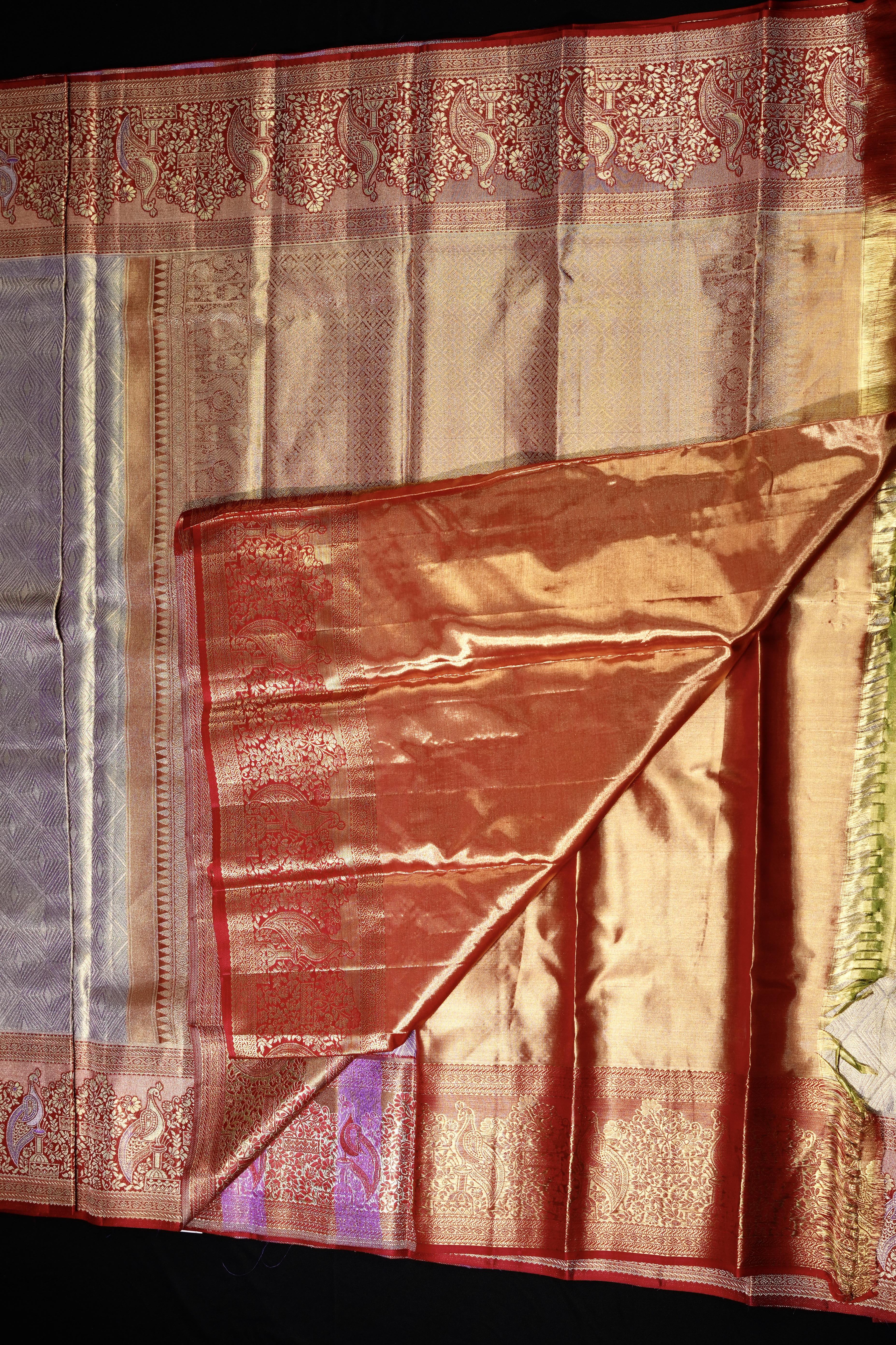 Blouse: The contrast red and gold zari tissue floral brocade pink blouse with zari borders perfectly complements the saree, with the vibrant red tone offering a striking contrast against the lavender base while harmonizing beautifully with the border and pallu.