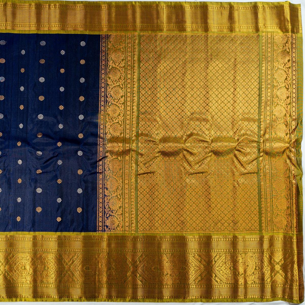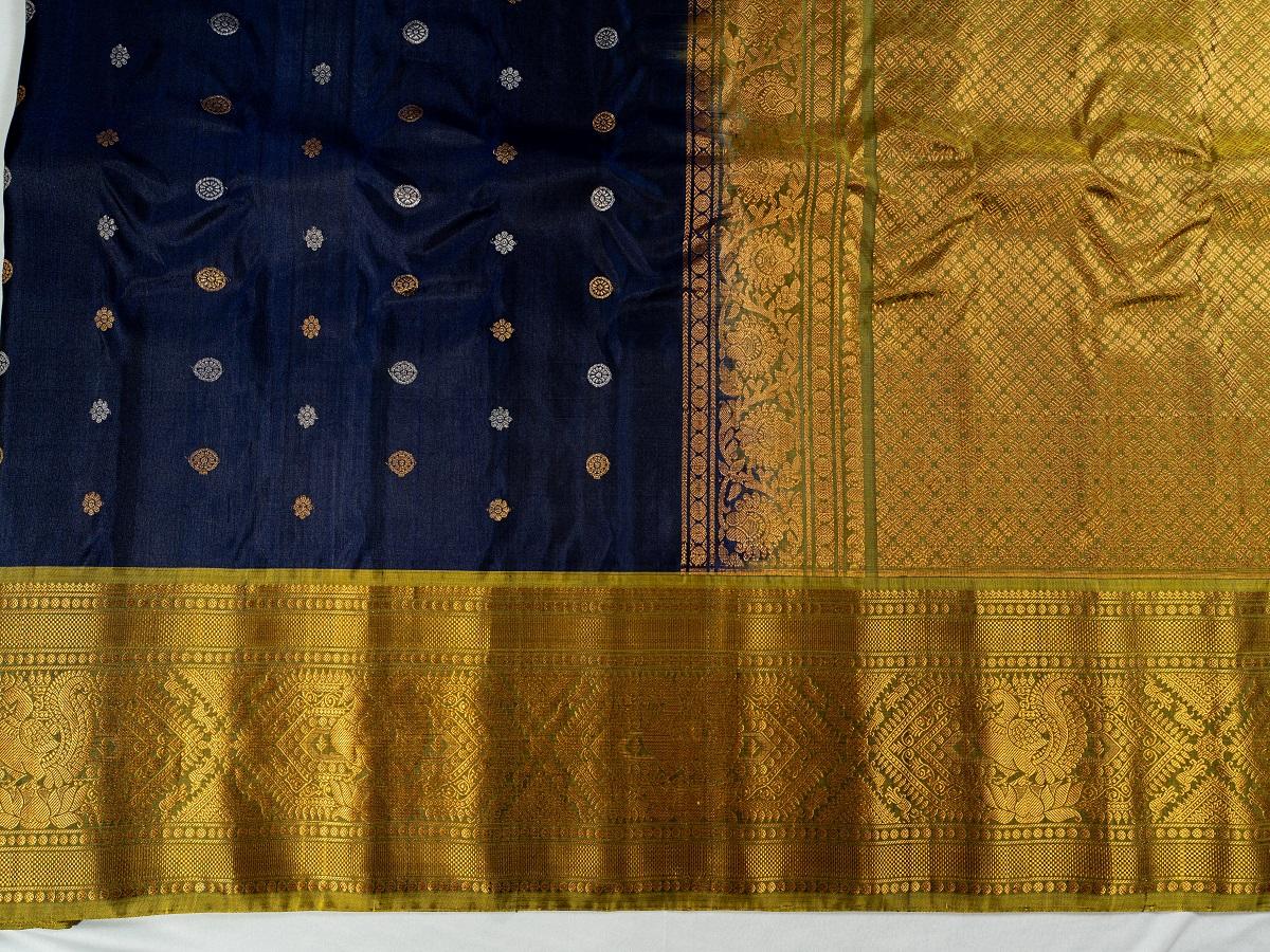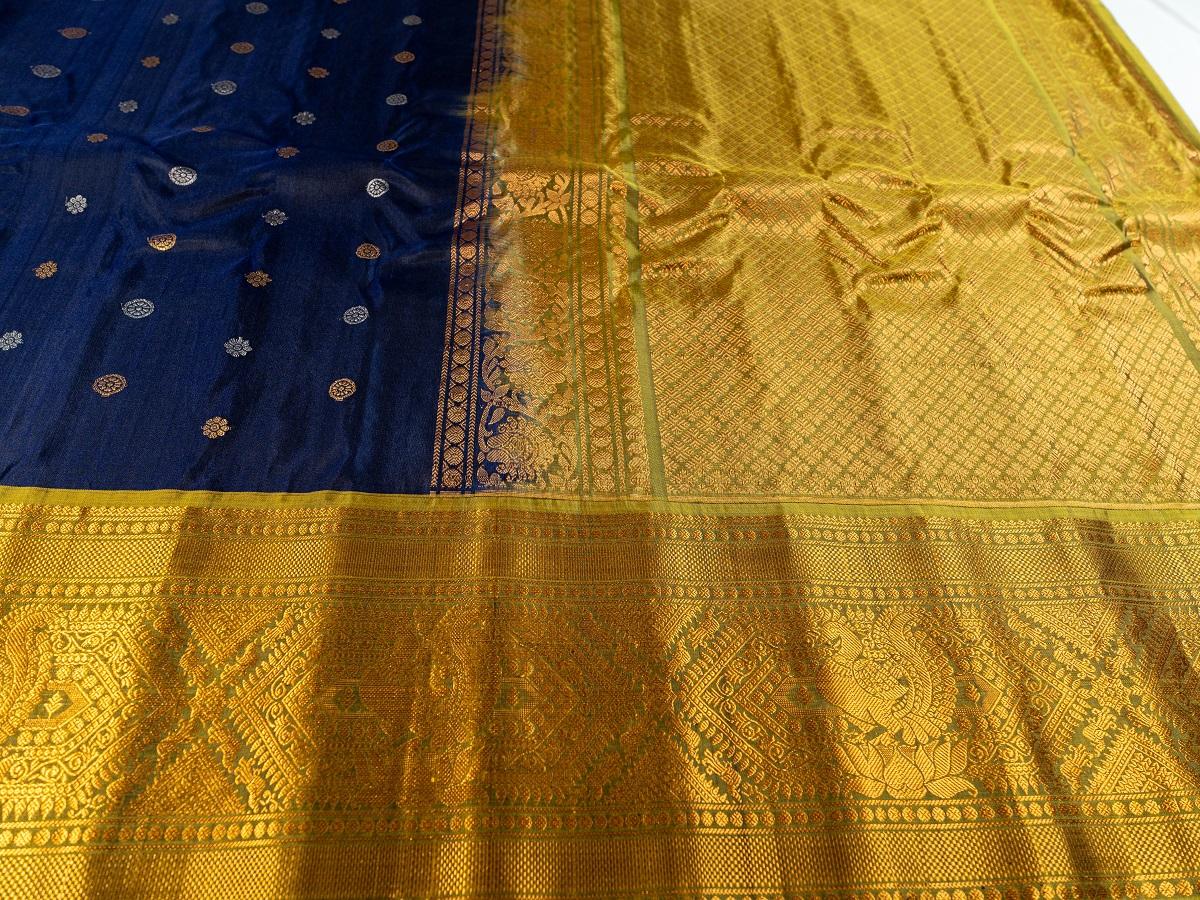 A navy blue Gadwal saree with a gold pattu border is a stunning and sophisticated ensemble.The navy blue is beautifully complemented by a gold pattu border, adding a touch of luxury, glamour, and sophistication. The gold border adds a subtle sheen and texture, creating a striking visual effect that's perfect for formal events, weddings, or special occasions. The contrast between the cool, calming tone of the navy blue and the warm, luxurious tone of the gold creates a captivating and regal look, ideal for those who want to exude confidence and poise.The Gadwal weave adds a luxurious texture and depth to the saree, making it perfect for those who want to experience the epitome of traditional elegance and sophistication.