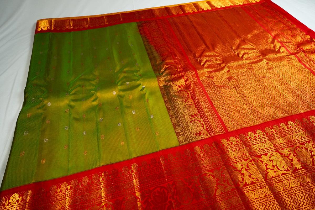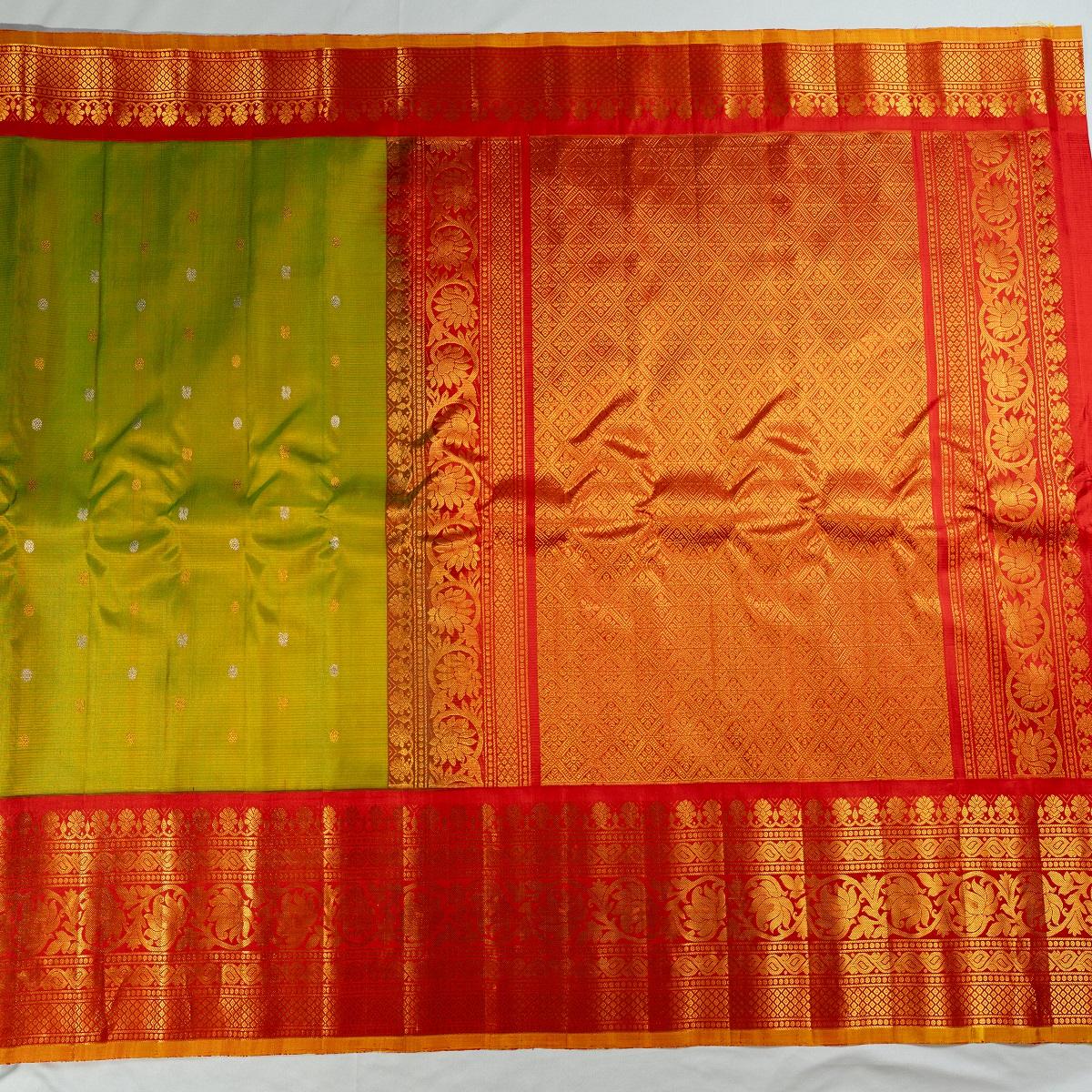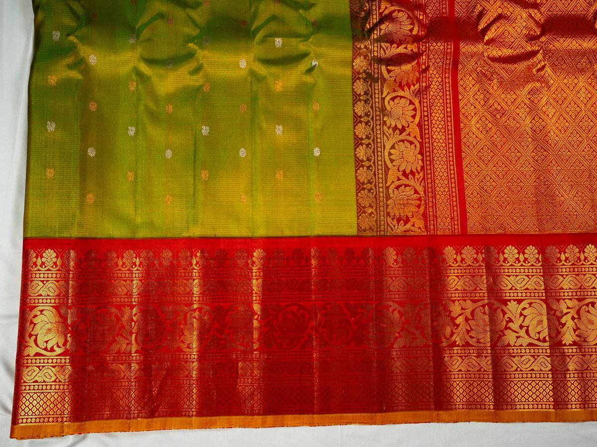 A parrot green Gadwal saree with a red kuttu pattu border is a stunning and eye-catching ensemble. The contrast between the cool, calming tone of the green and the bold, vibrant tone of the red creates a captivating and dynamic look, perfect for formal events, weddings, or special occasions. This saree is a true showstopper, blending vibrant colors, bold contrasts, and traditional elegance, ideal for those who want to exude confidence, energy, and style!