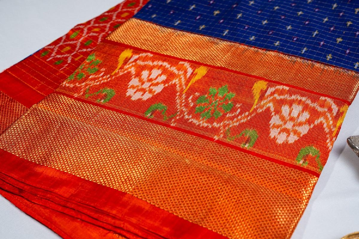 Pochampally Ikat silk royal blue checks saree enhanced with an awe-inspiringly artistic Ikat-woven motifs inserted in the check pattern across the saree. It has a gold-woven pattern with contrast border.