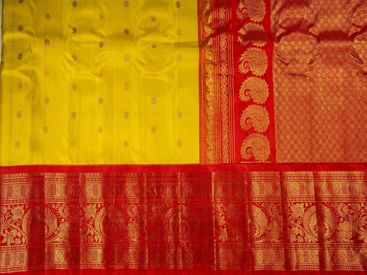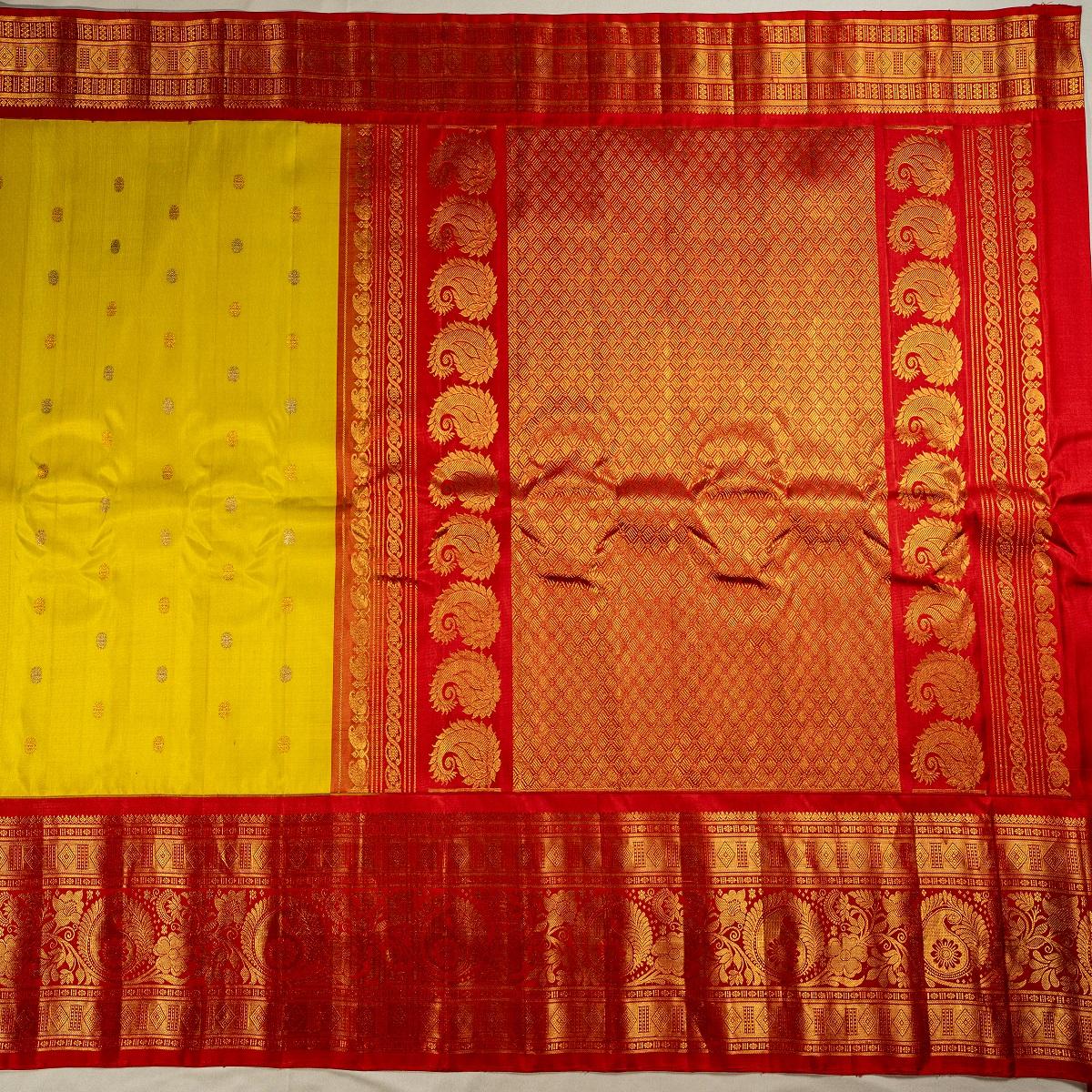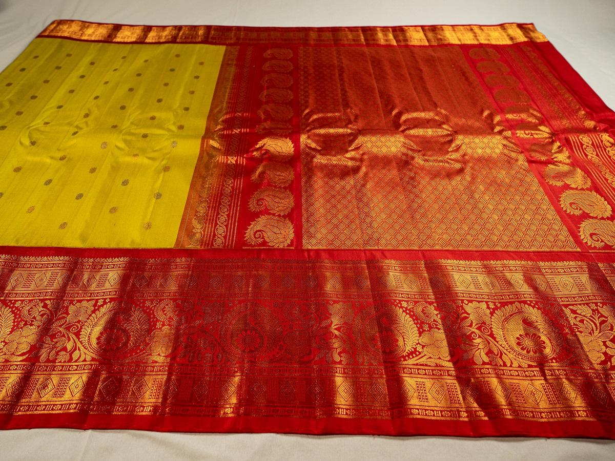 Embrace the warmth of tradition with our vibrant sunshine tradition saree, a classical Gadwal masterpiece. This beautiful yellow saree features a striking red pattu border, intricately woven with silk threads, creating a timeless contrast that's perfect for festive occasions.