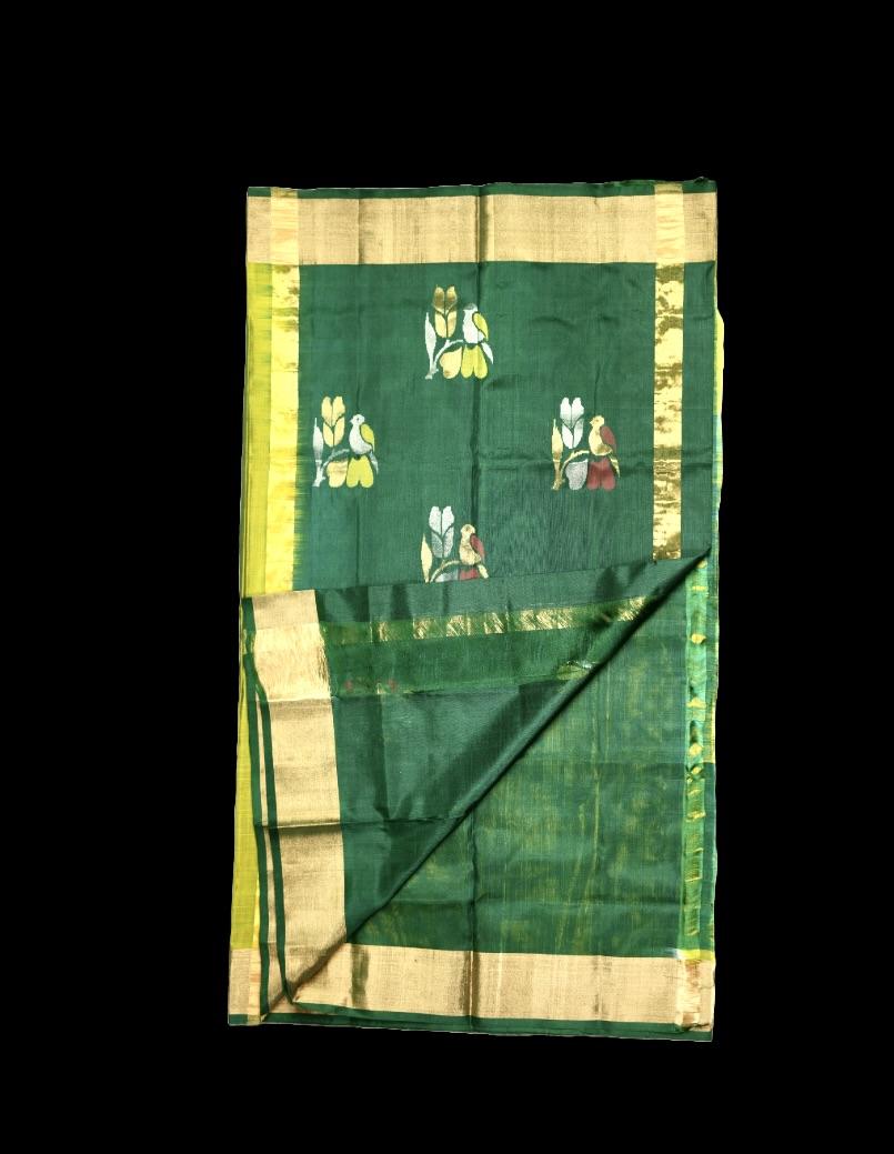 Uppada Silk Green Saree owning floral motifs, a gold Zari woven kaddi border,  and a contrast dark green floral Pallu.