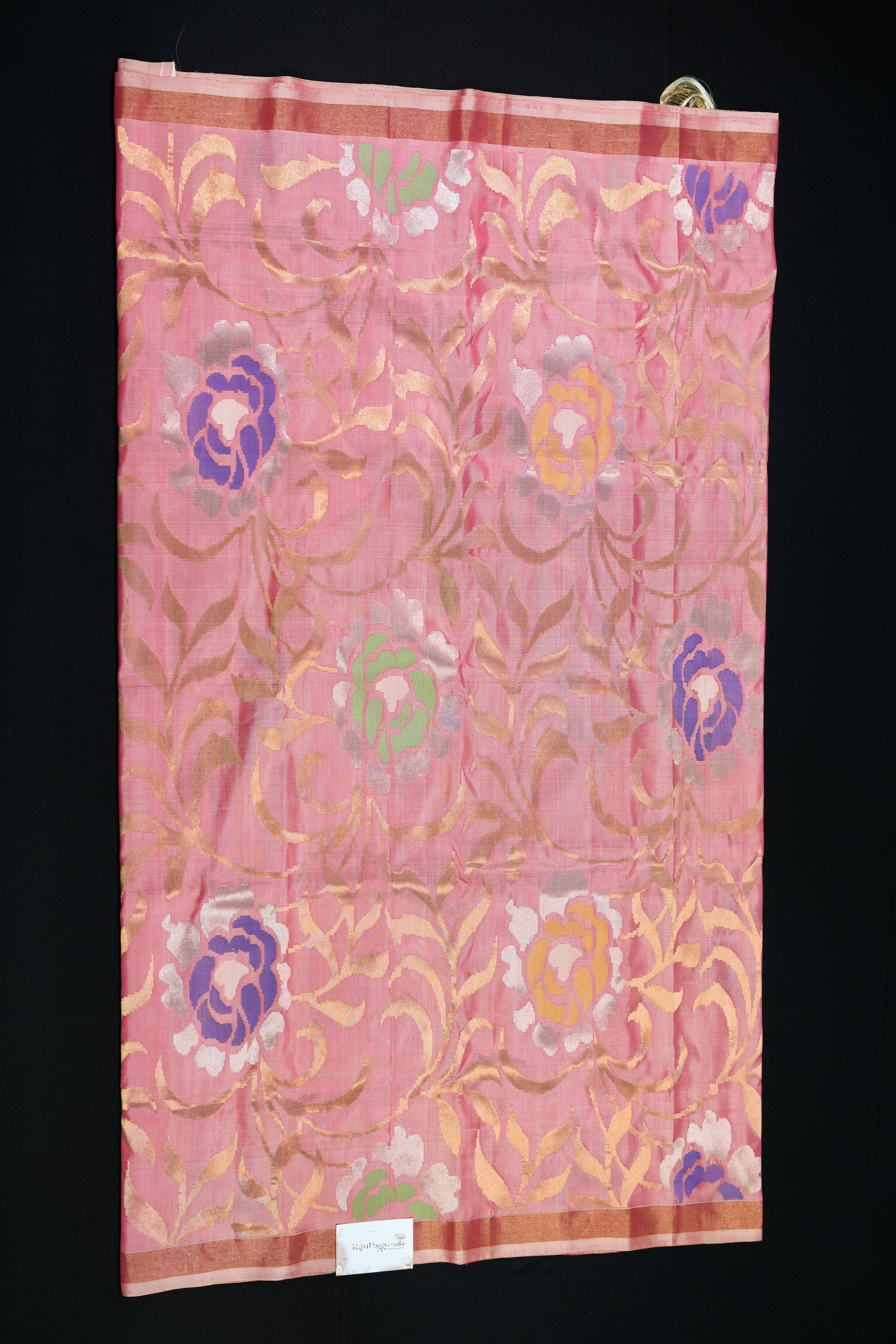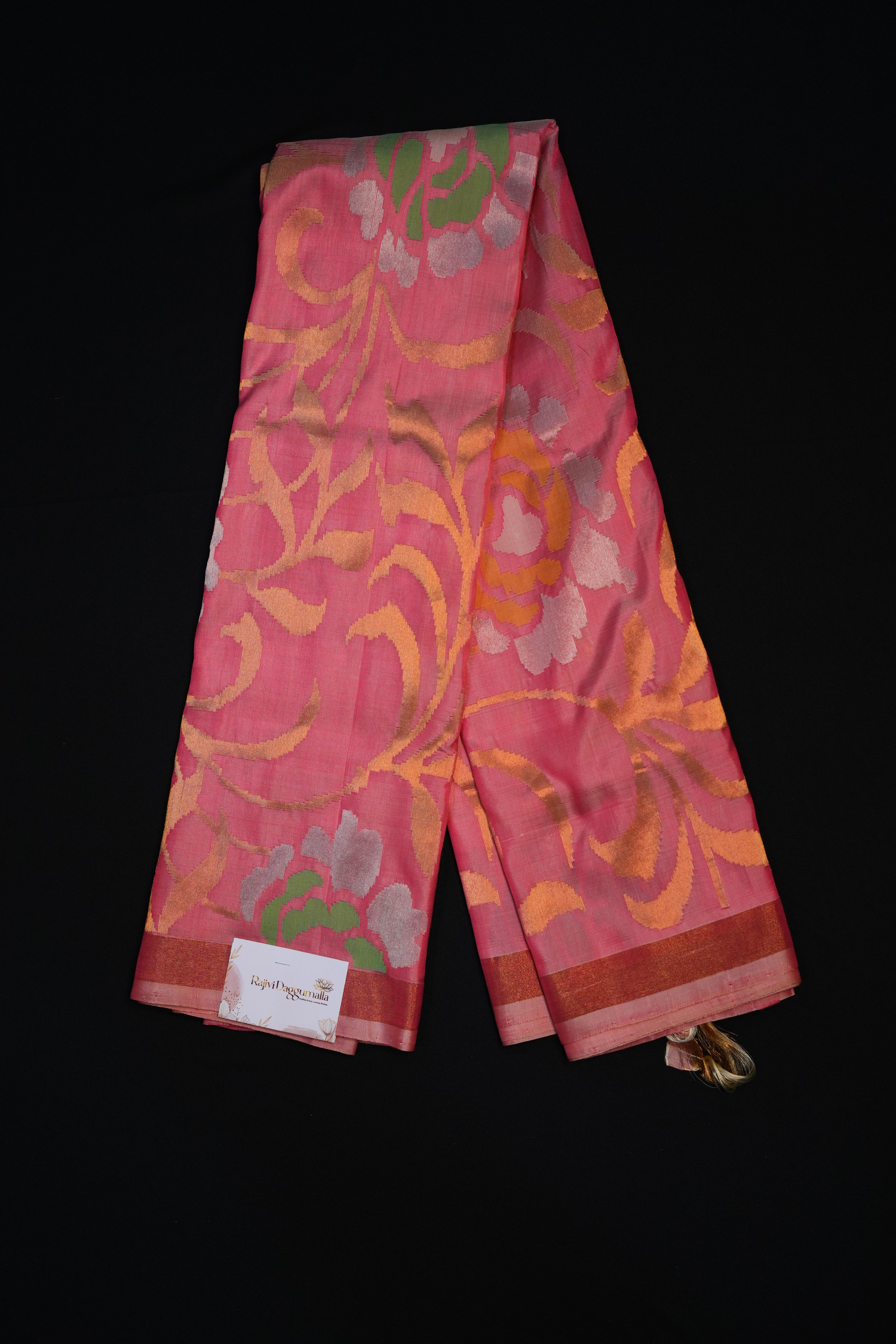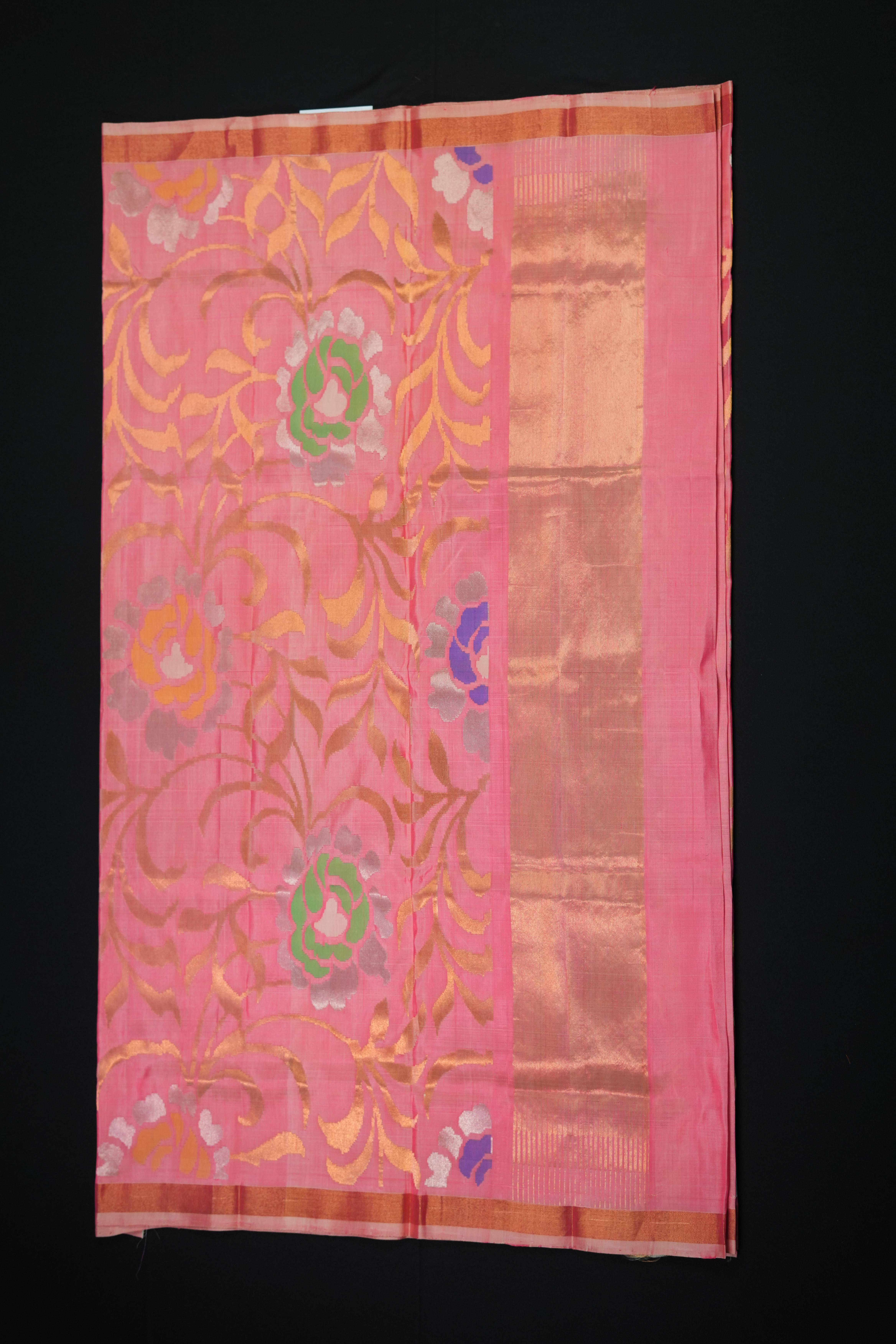 Uppada silk coral-pink, peach mix-tone saree dazzles with alluring Meenakari/gold/silver jamdani-woven lotus floral creeper across the saree. It has a gold-woven border with grey edging. The pallu features a gold/silver jamdani-woven geometric pattern flower series.