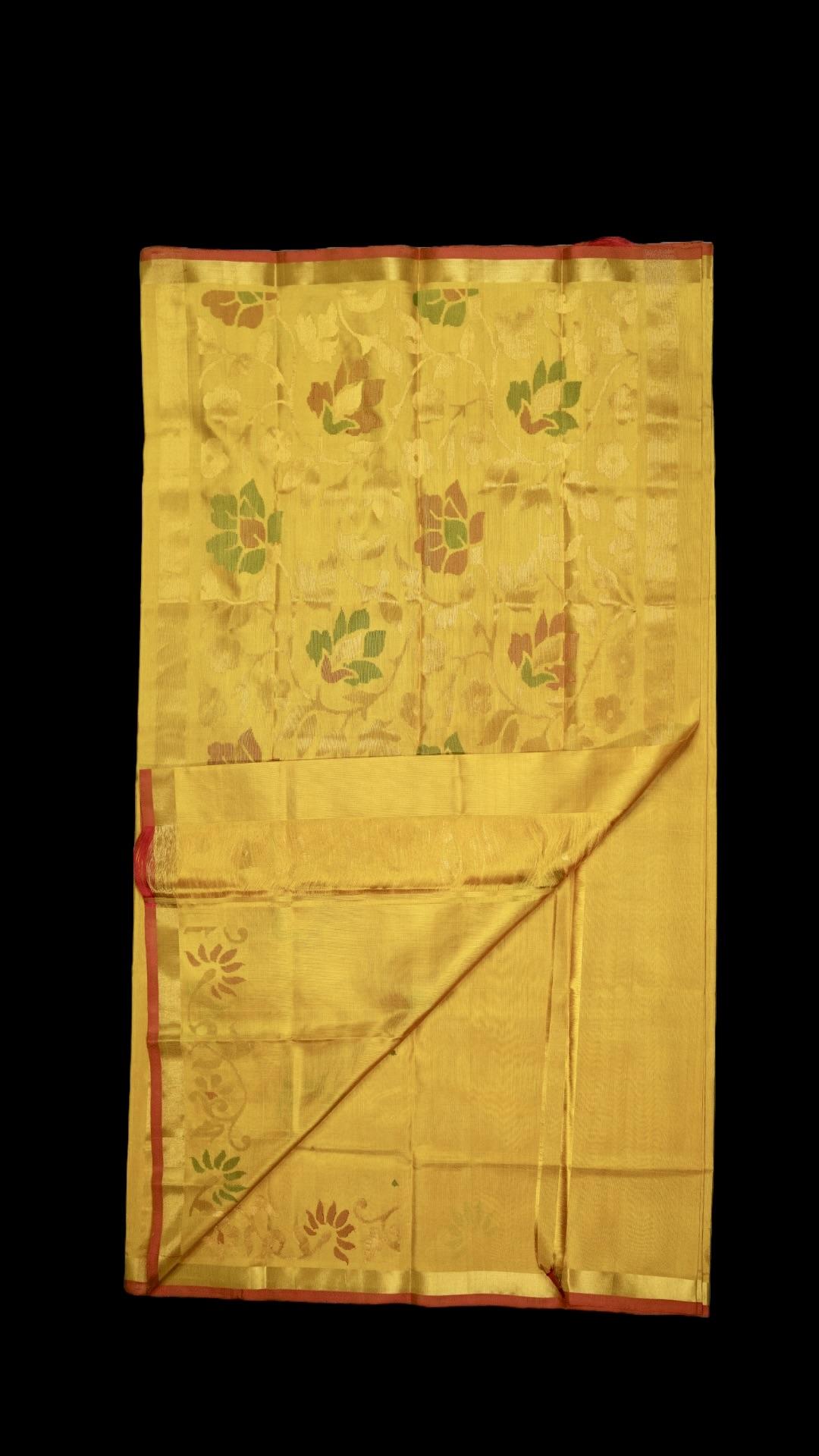 This Uppada SilkYellow Saree is adorned with leafy Buttas, a gold Zari woven floral border, pale orange edging and a Pallu with floral Jaal designs.