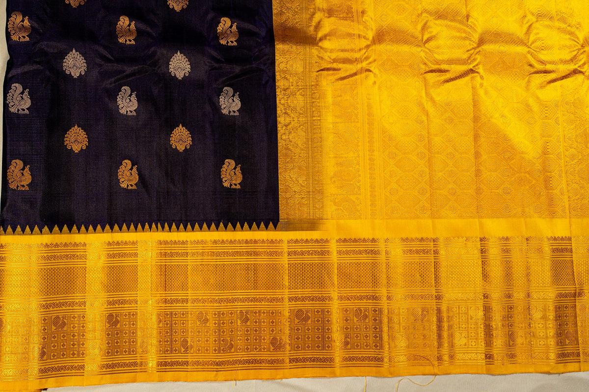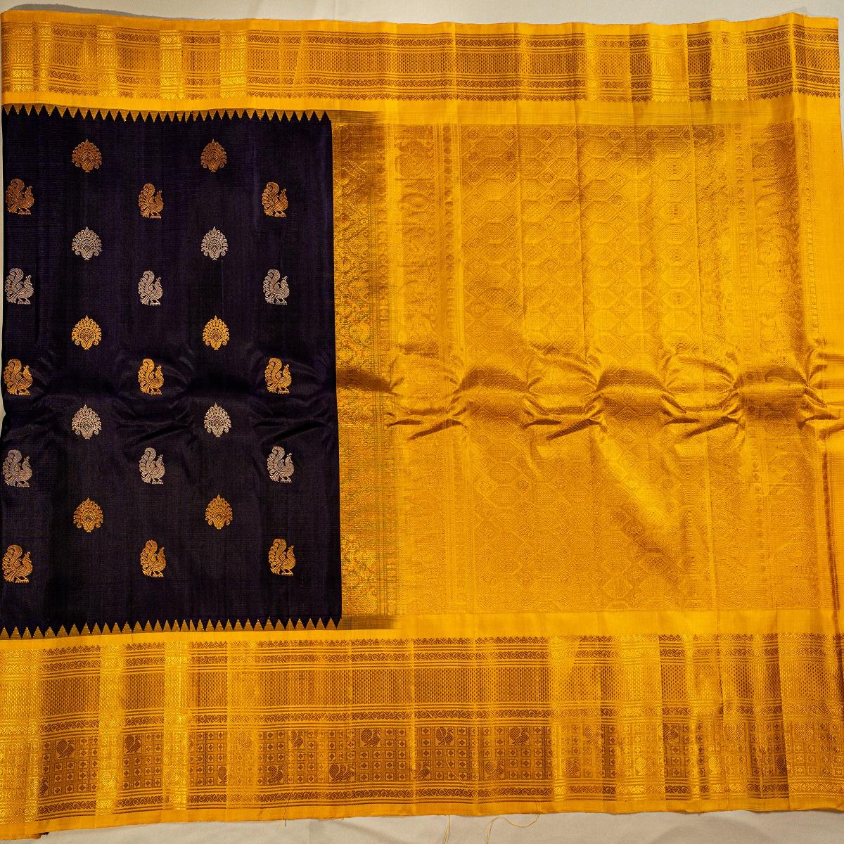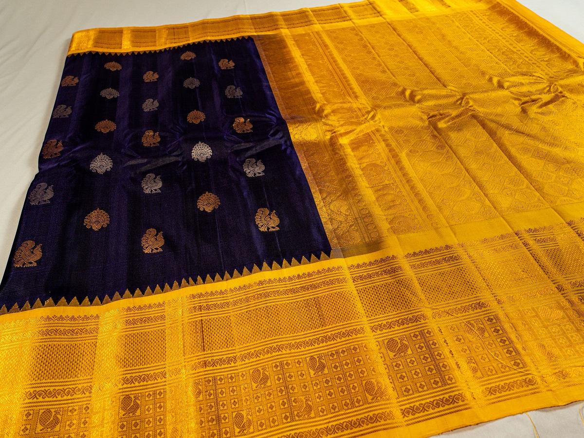 Exude sophistication with our stunning vintage elegance saree, a masterpeice of gadwal weaving. This luxurious dark wine-colored saree features a vibrant golden yellow pattu bordet, intricately woven with silk threads, creating a dramatic contrast that's perfect for making a statement.
